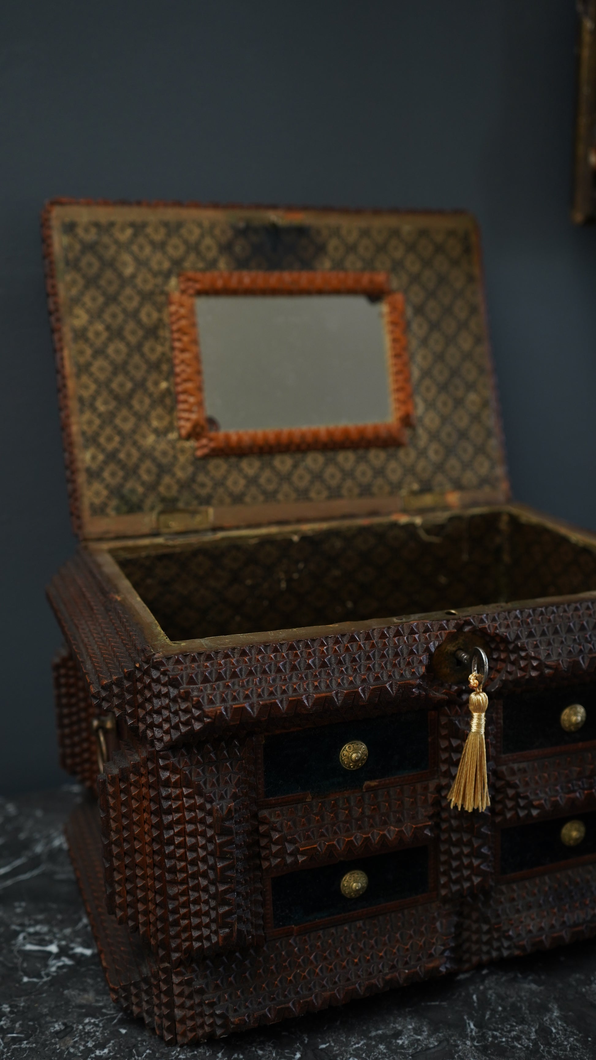 Antique Tramp Art Sewing Box with Drawers and Mirror, Hand-Carved Folk Art Keepsake Chest, Late 19th Century