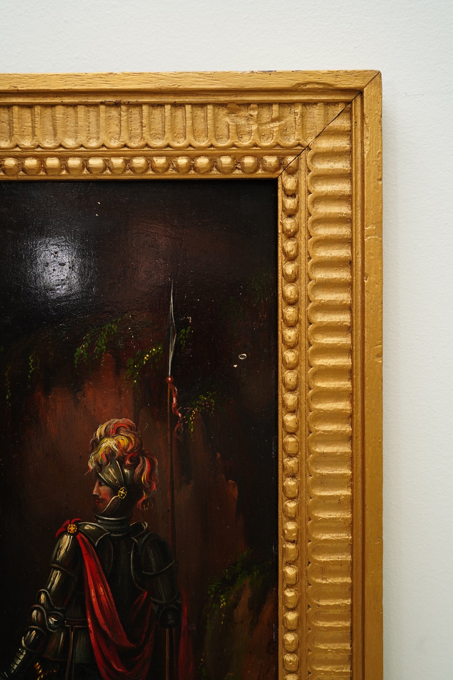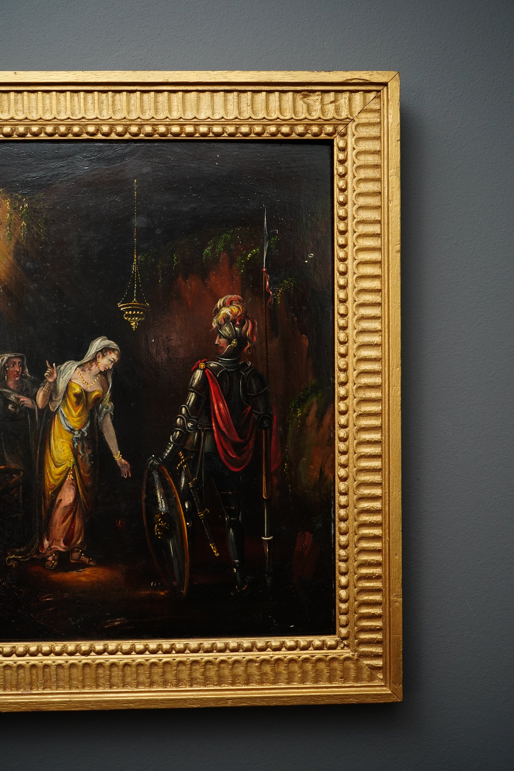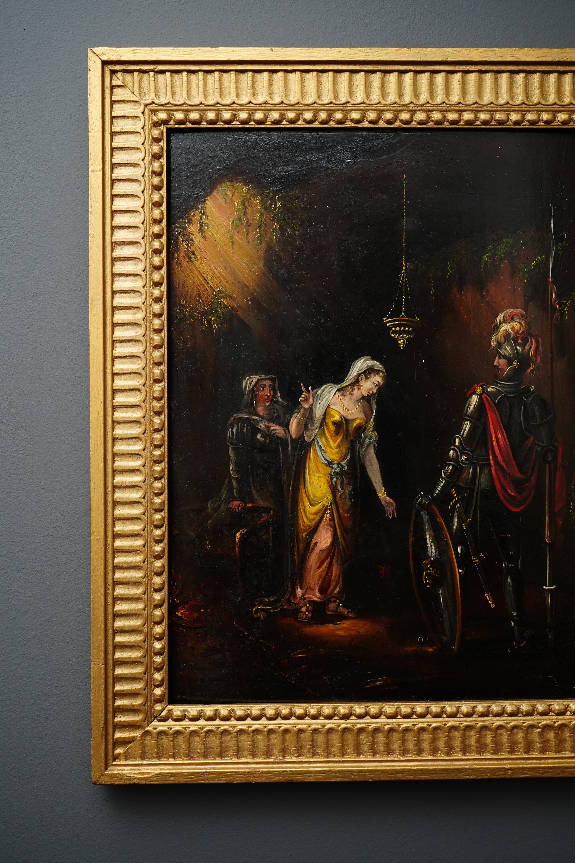 This type of “Troubadour-style” cabinet painting was designed to bring legend, theatre, and Old World atmosphere into the home. The artist relies on deep chiaroscuro and selective highlights, especially across the armor and drapery, creating a rich, moody presence that reads beautifully in traditional interiors and dark-academia spaces alike. Acquired in London in October 2025 and presented in a bold gilt frame that elevates the piece immediately.
