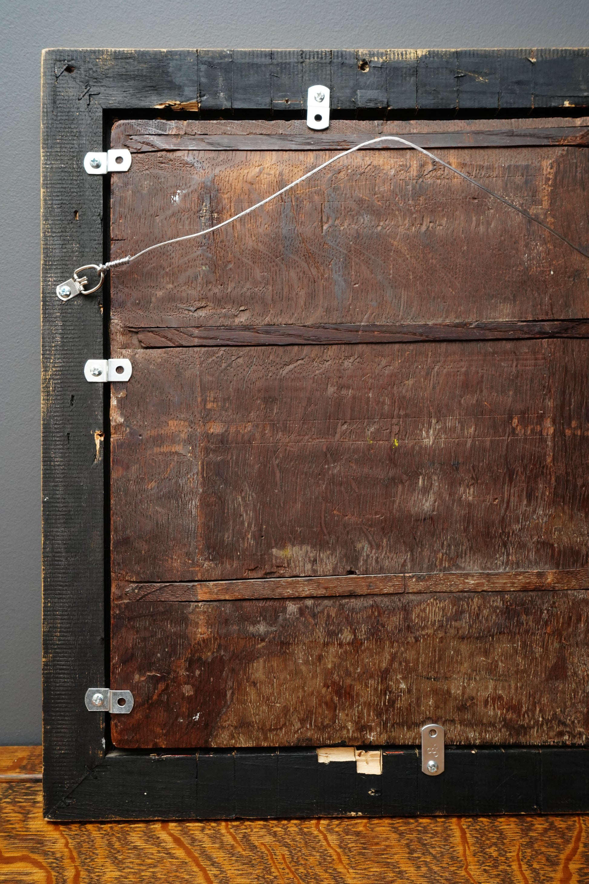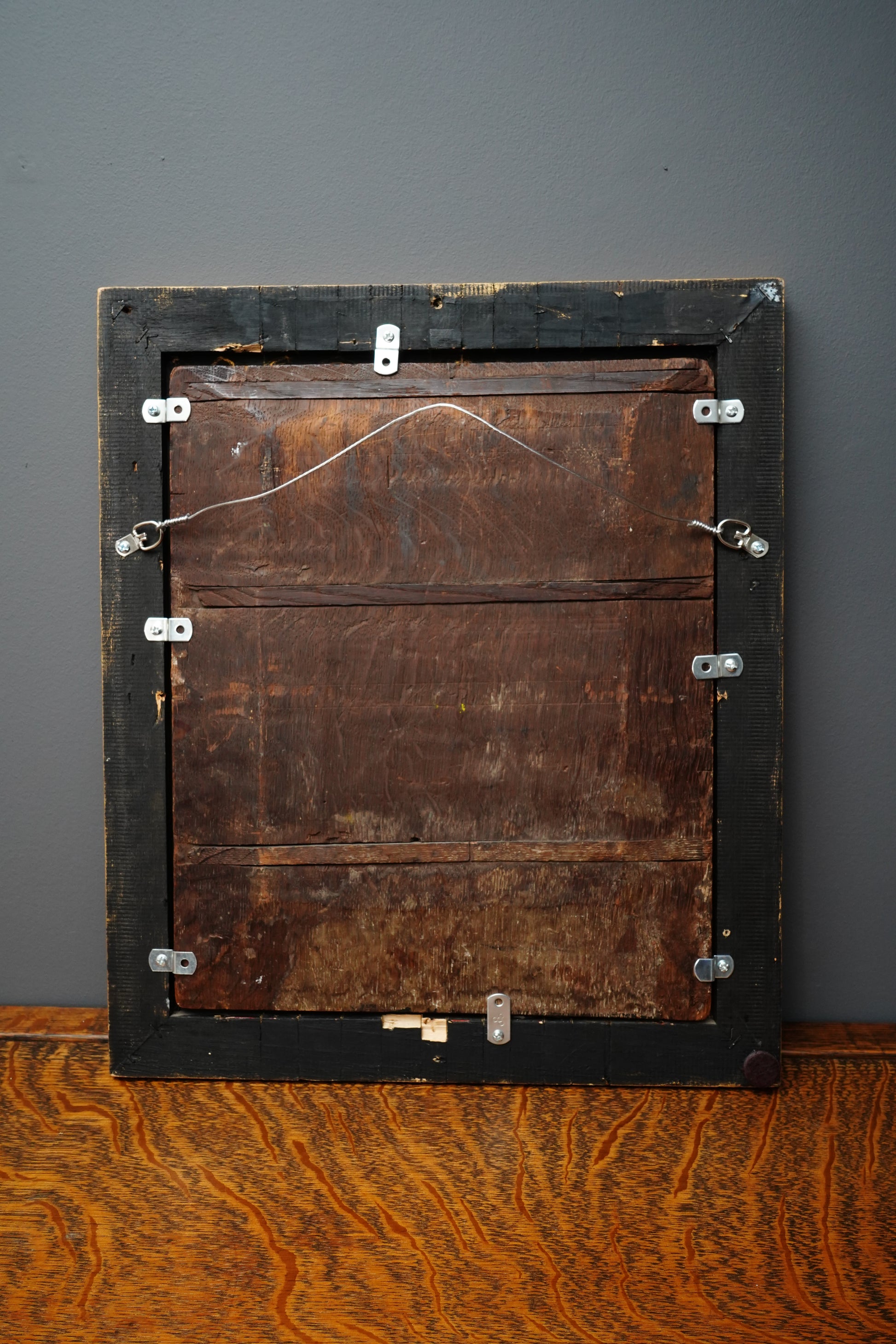 Antique condition consistent with age. The surface has an aged glossy varnish with minor scattered wear and small specks, most noticeable in the dark areas. There is paint loss and abrasion along portions of the outer edges, consistent with prior frame rub when the panel was previously loose, with the main scene remaining largely unaffected. The work is oil on wood panel and is secured into a later backing with modern clips on the reverse. The vintage gilt frame shows typical wear, including scuffs, small finish losses, and some corner join stress/separation.