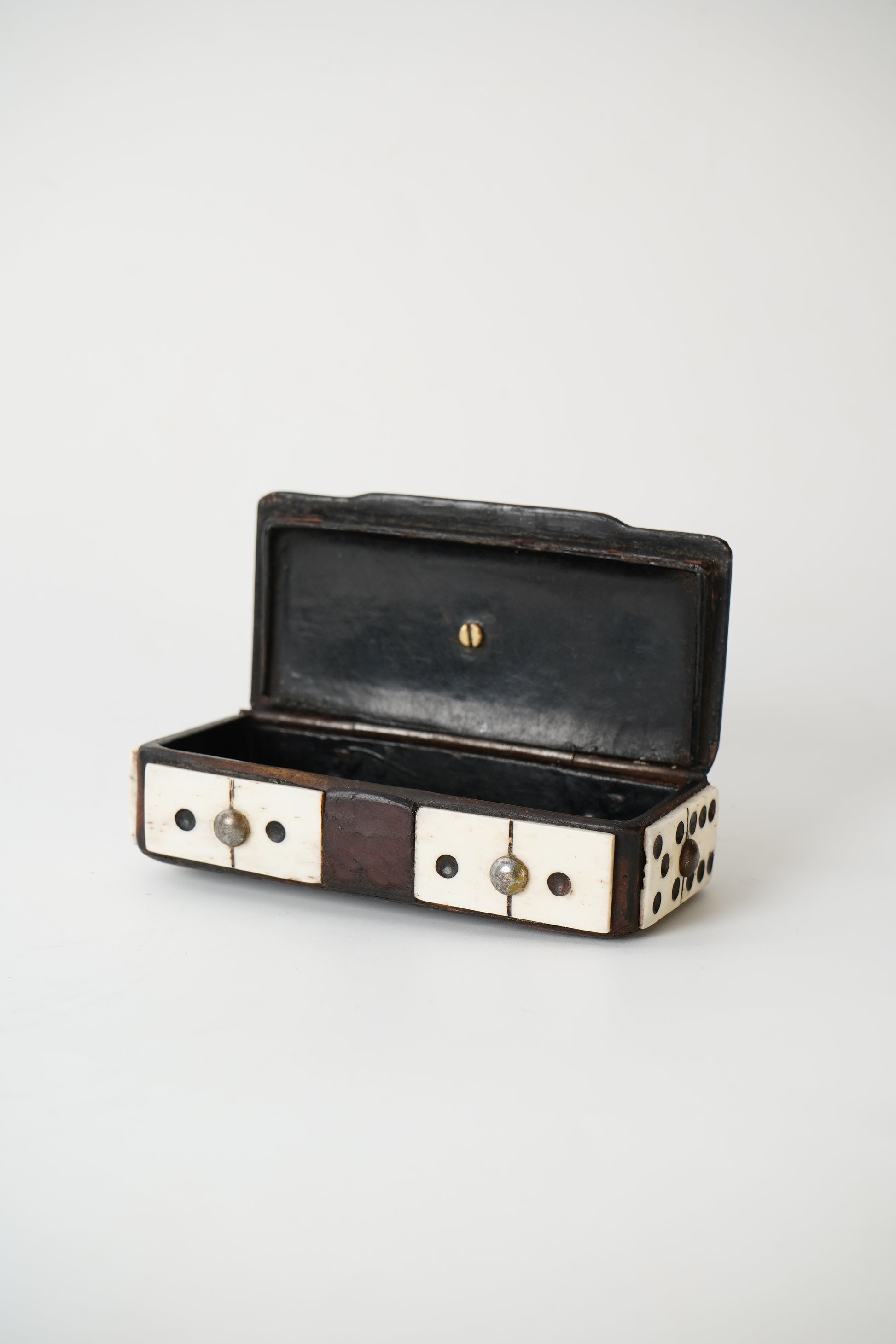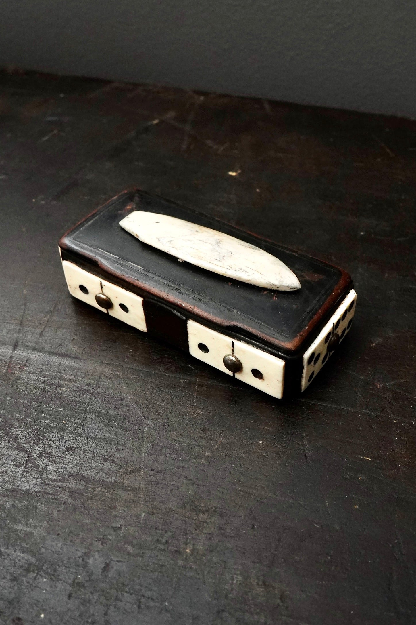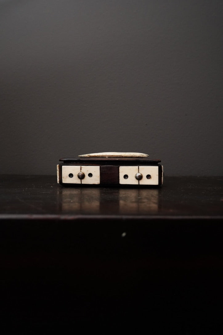 A wonderful miniature antique box originally made as a domino case, later perfect as a decorative trinket or keepsake box. The exterior features classic domino “pip” motifs inlaid in pale bovine bone, contrasted against a dark-stained body for that unmistakable Victorian look. A carved bovine bone finial tops the lid, adding a sculptural detail that makes this piece feel like a true curiosity-cabinet find.