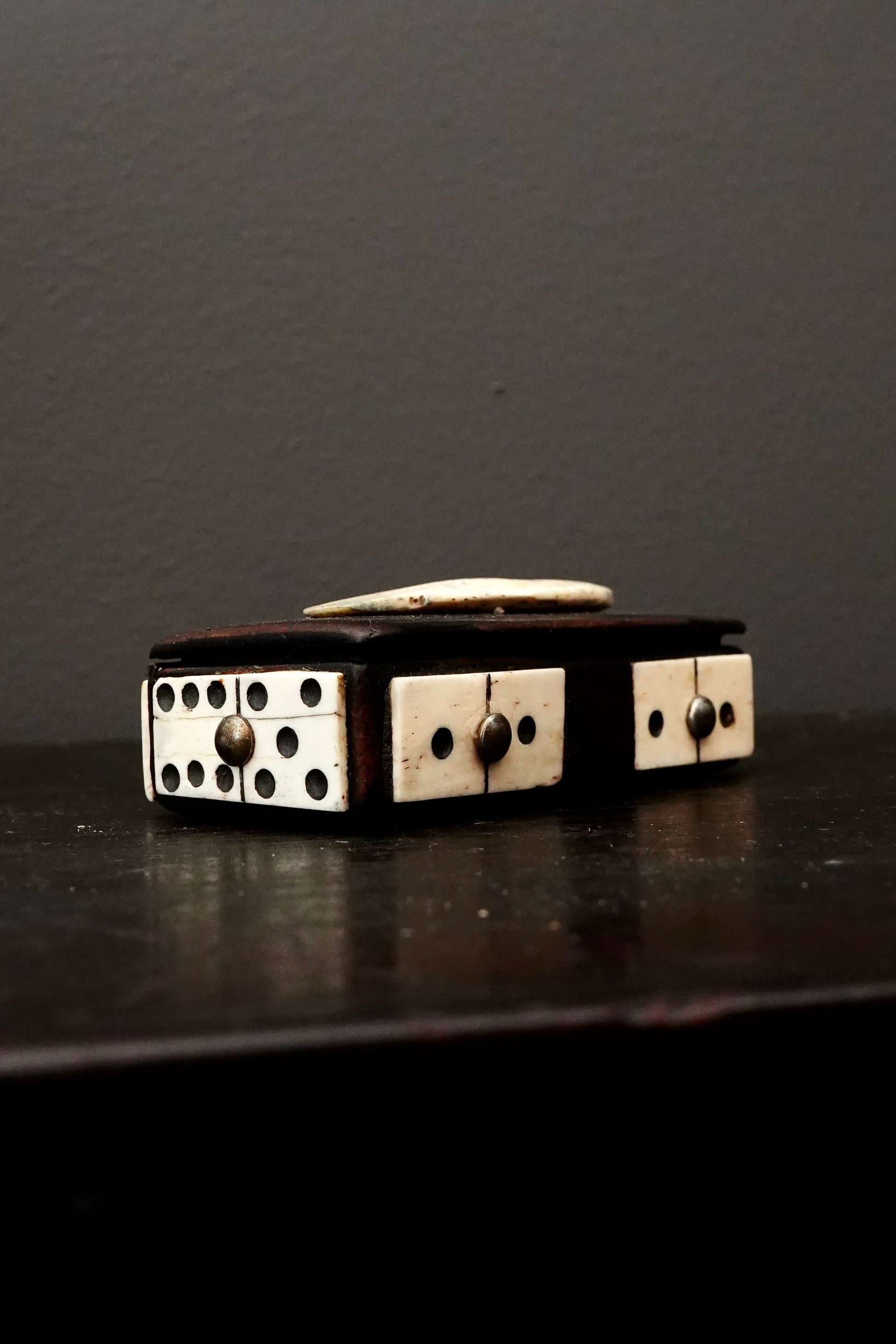 Objects like this were popular in late 19th-century homes for parlor games and travel, and many surviving examples were repurposed over time for small treasures like rings, snuff, seals, or desk essentials. Compact, tactile, and full of character, it displays beautifully on a desk, bookshelf, or styled vignette.