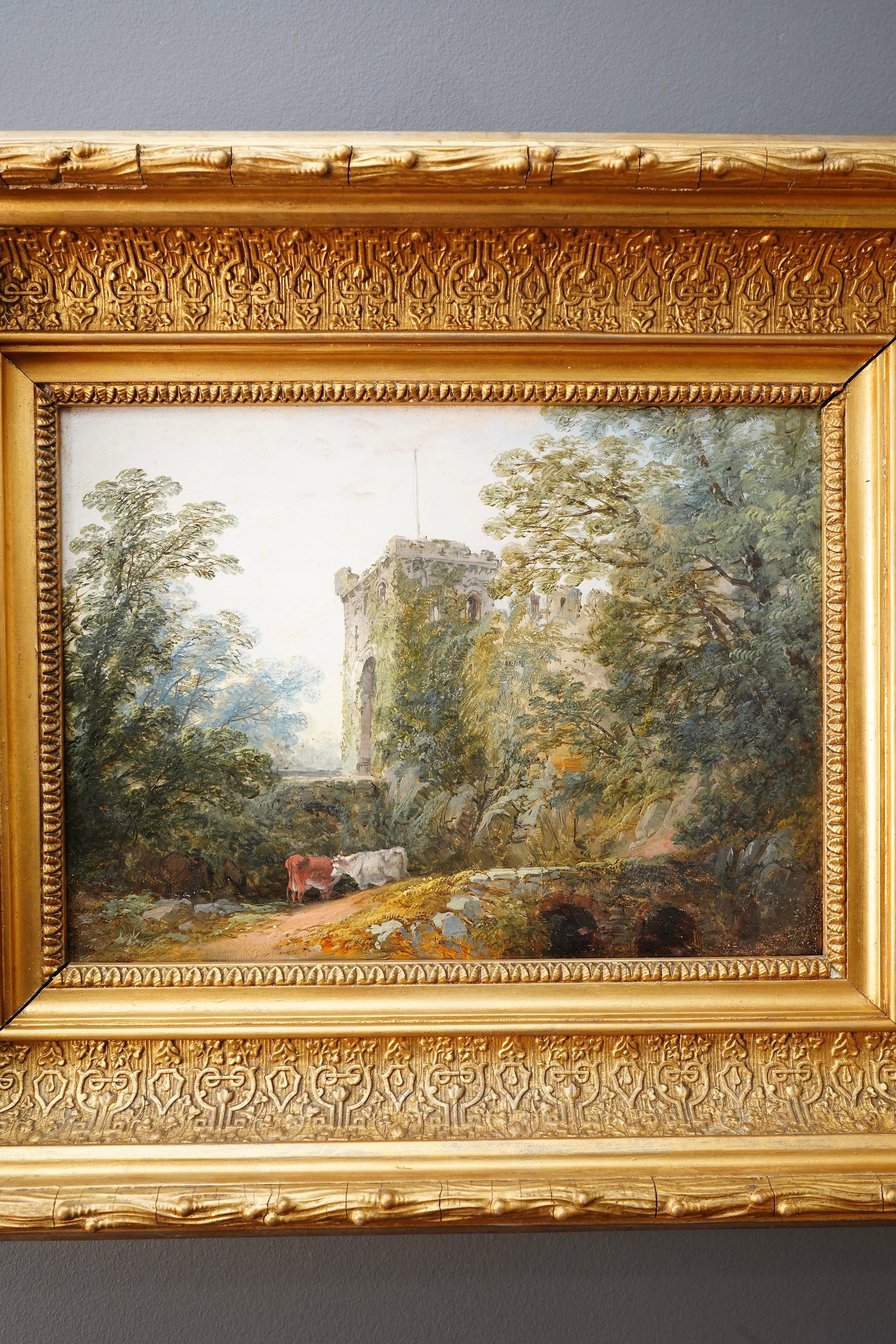 A beautifully atmospheric antique landscape painted in 1849, depicting Chepstow Castle in Monmouthshire, Wales. This piece captures everything collectors love about mid 19th century British scenery: a romantic ruin softened by trees and ivy, a winding path, and two cows in the foreground that give the scene a quiet, pastoral narrative.