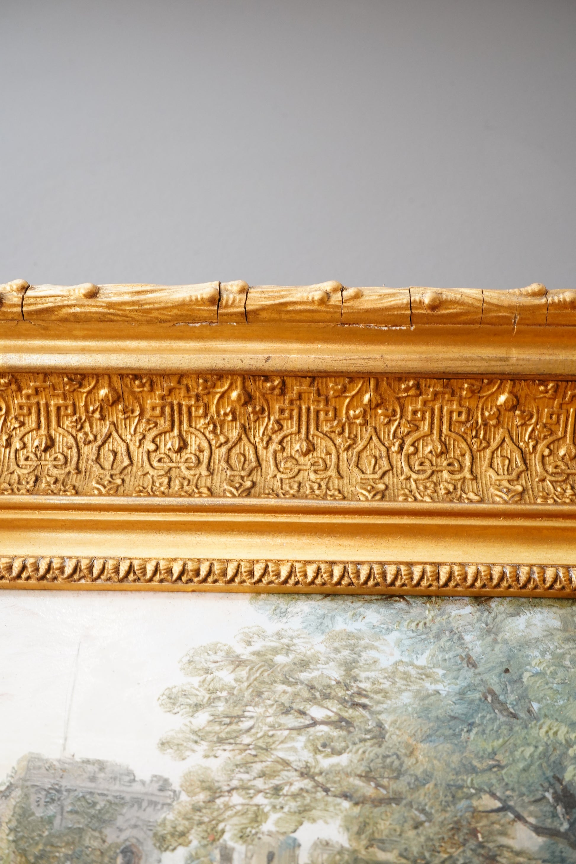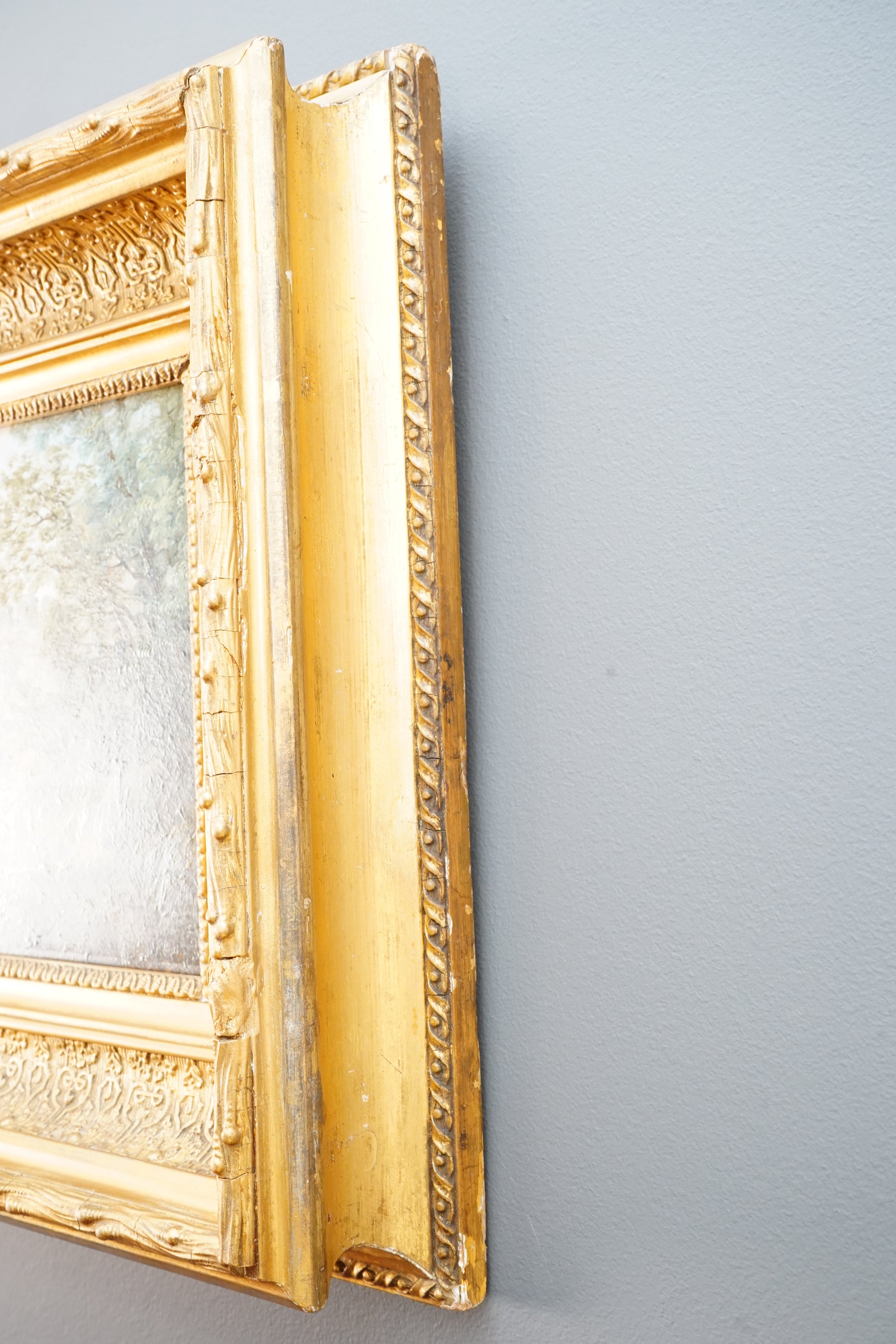 - Frame: Antique gilt frame with deep molded profile and ornate patterned liner