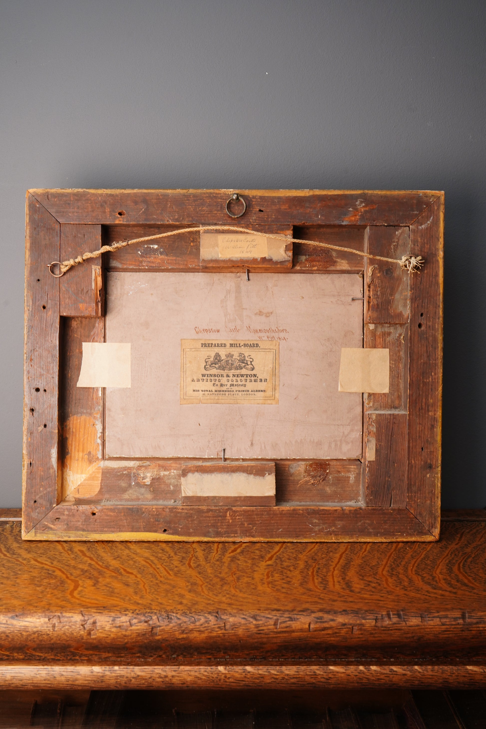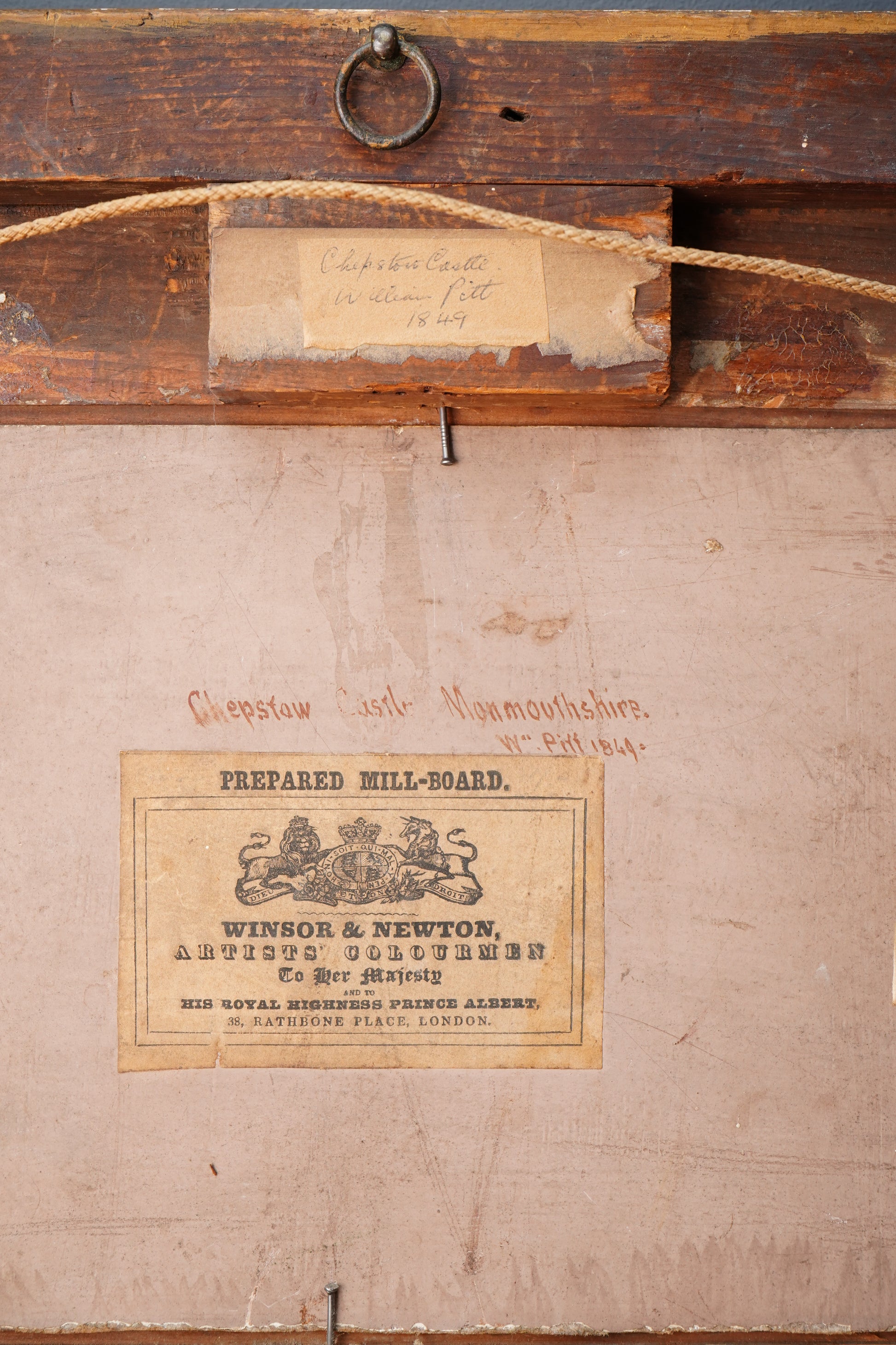 The reverse is inscribed “Chepstow Castle Monmouthshire” and signed W. Pitt 1849, and it retains an original Winsor & Newton prepared mill-board label. That detail is more than just charming ephemera. It is a strong period material clue that places the work firmly in the Victorian era and ties it to one of London’s most respected artist colourmen.