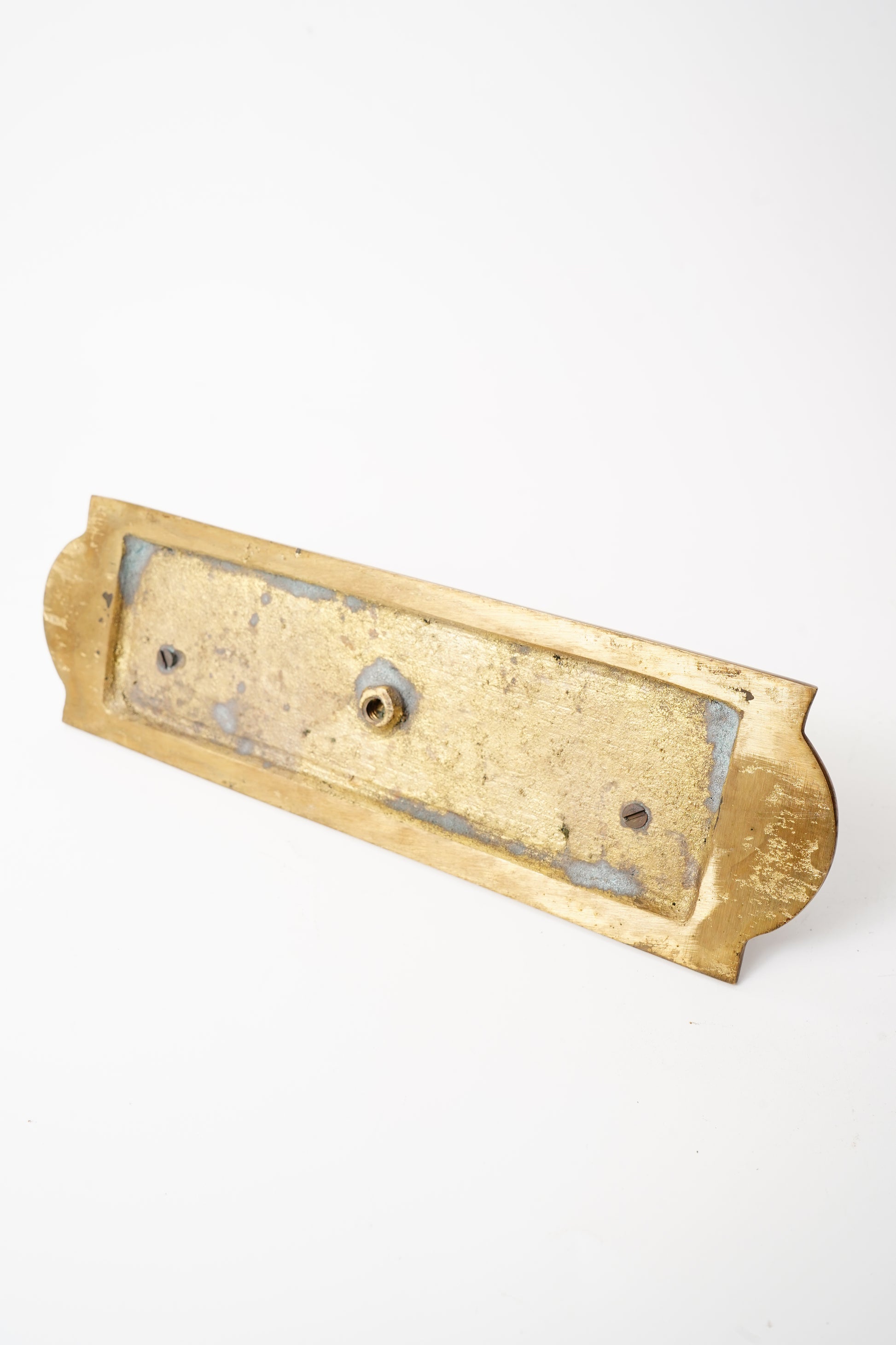 Good condition with age appropriate patina, surface wear, and finish variation consistent with brass of this age. Minor scuffs and small areas of darker oxidation are present, adding to the character. Underside shows mounting hardware and wear consistent with prior use. No major breaks or repairs noted.