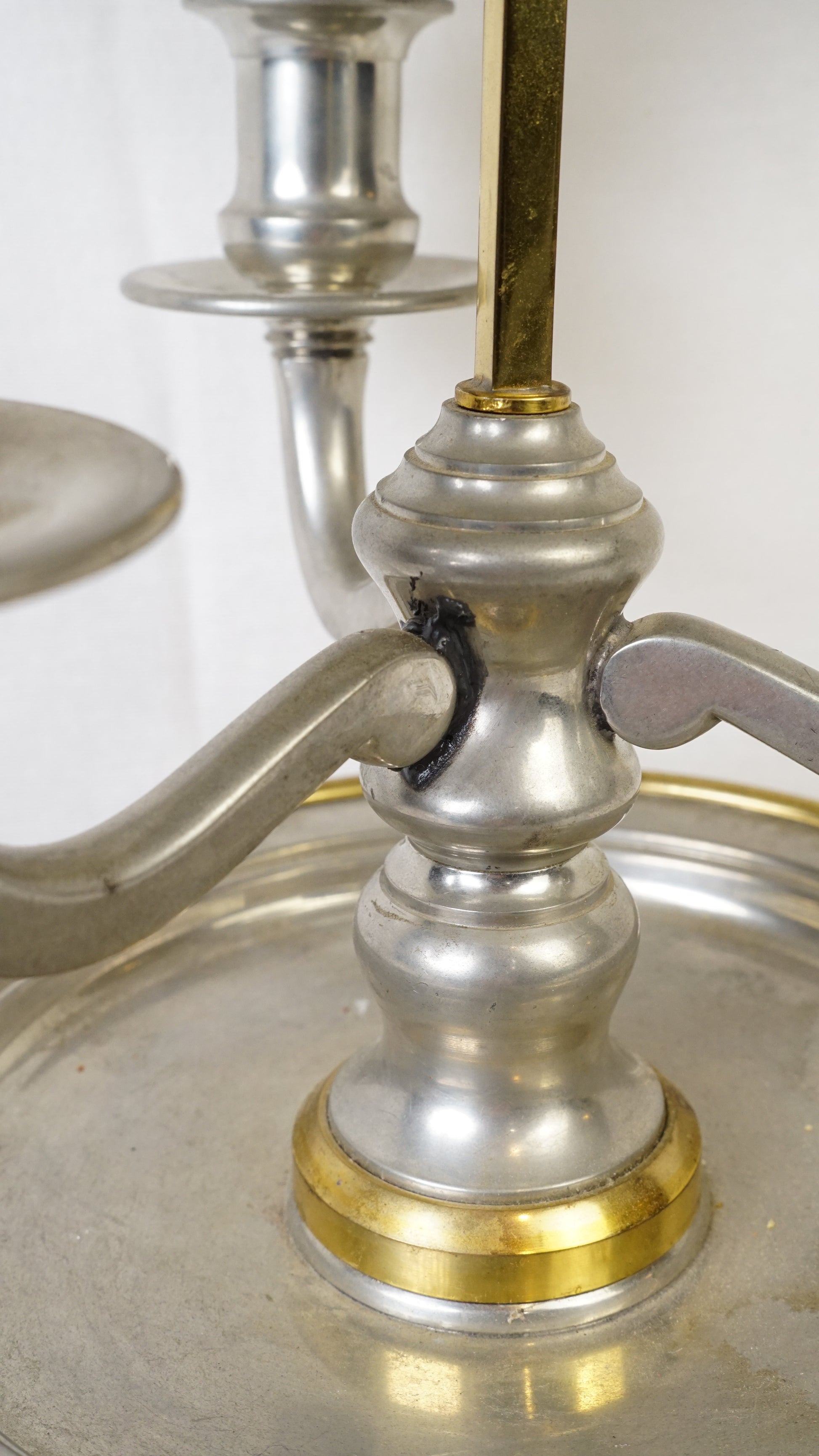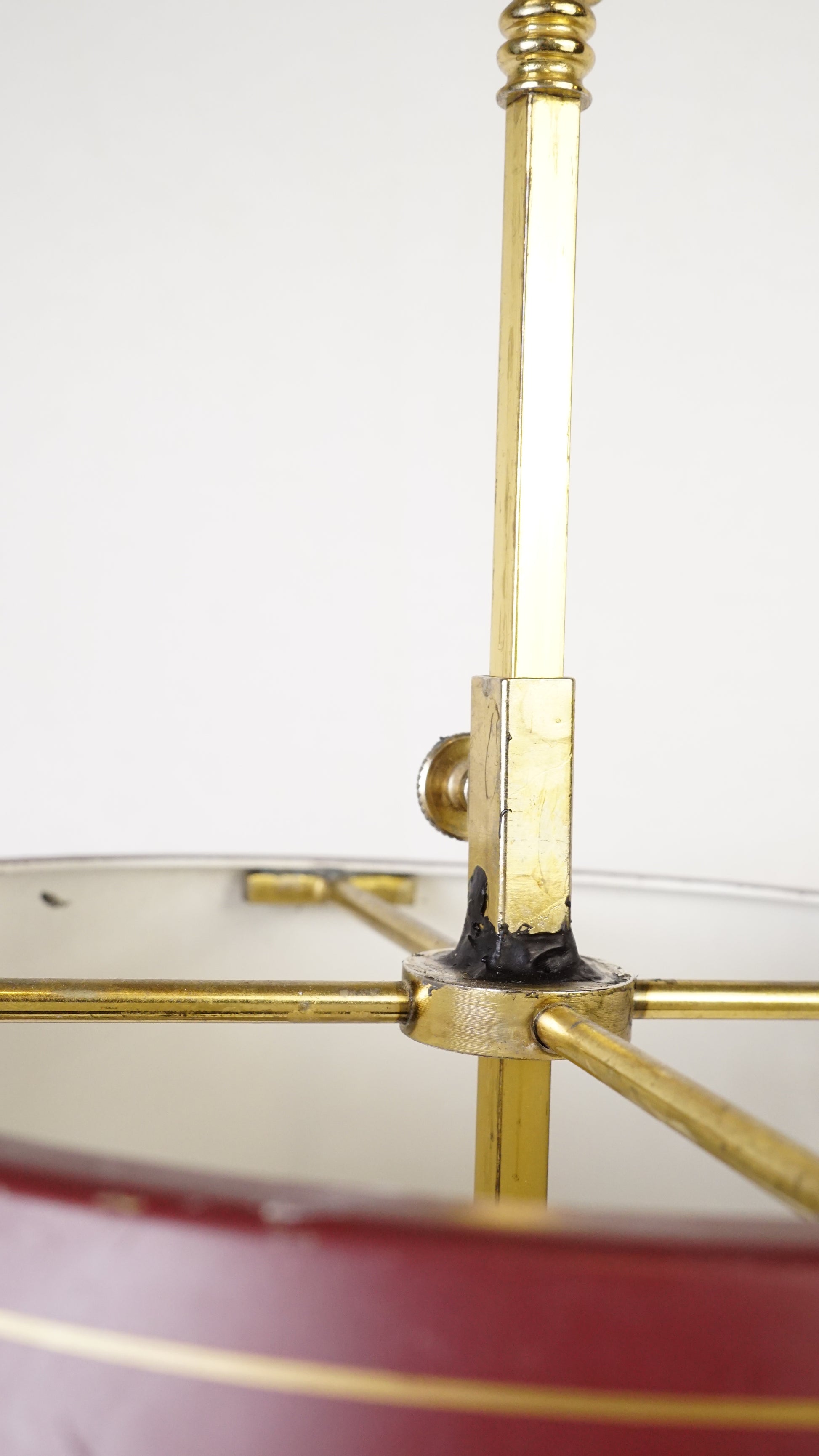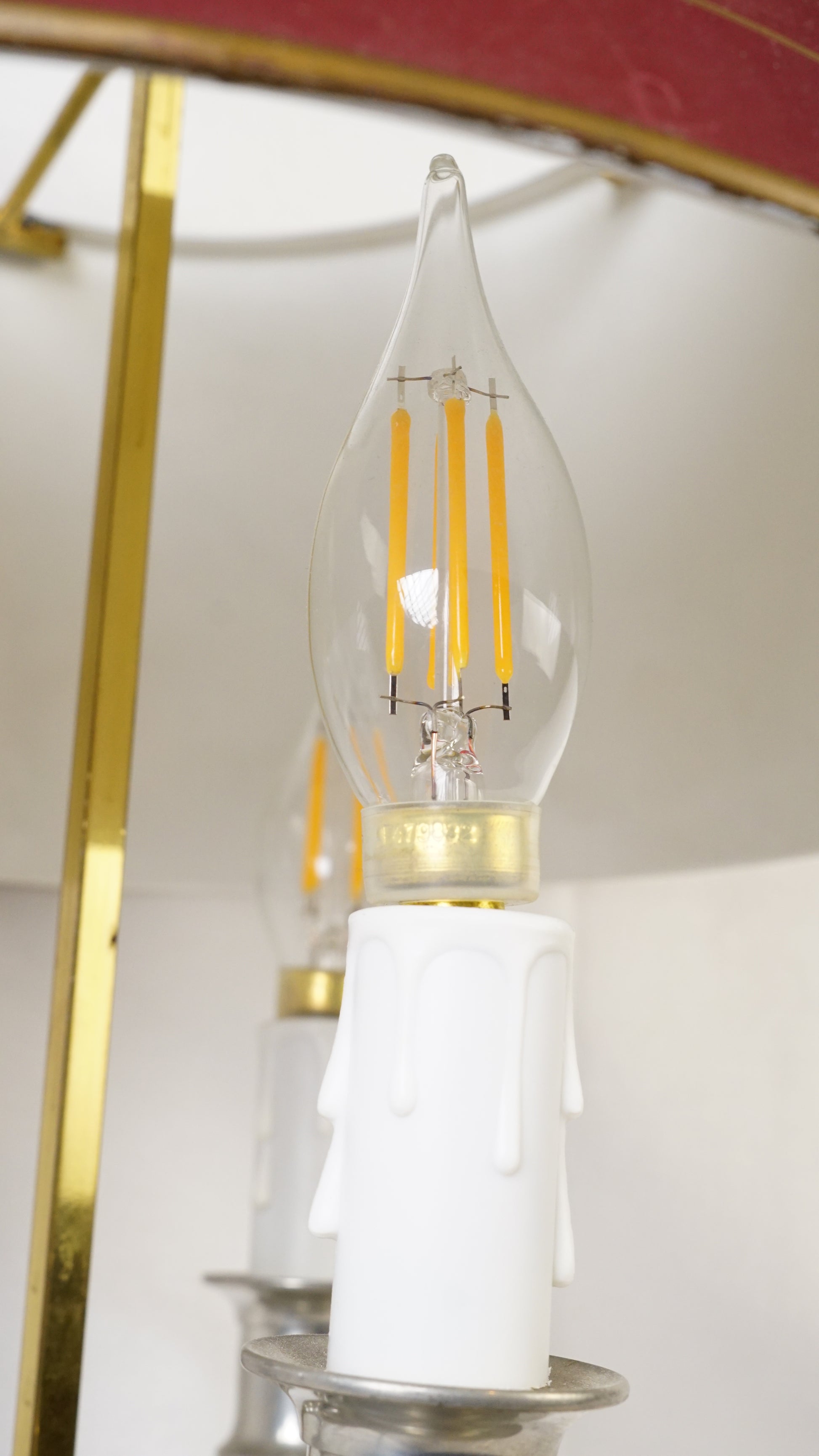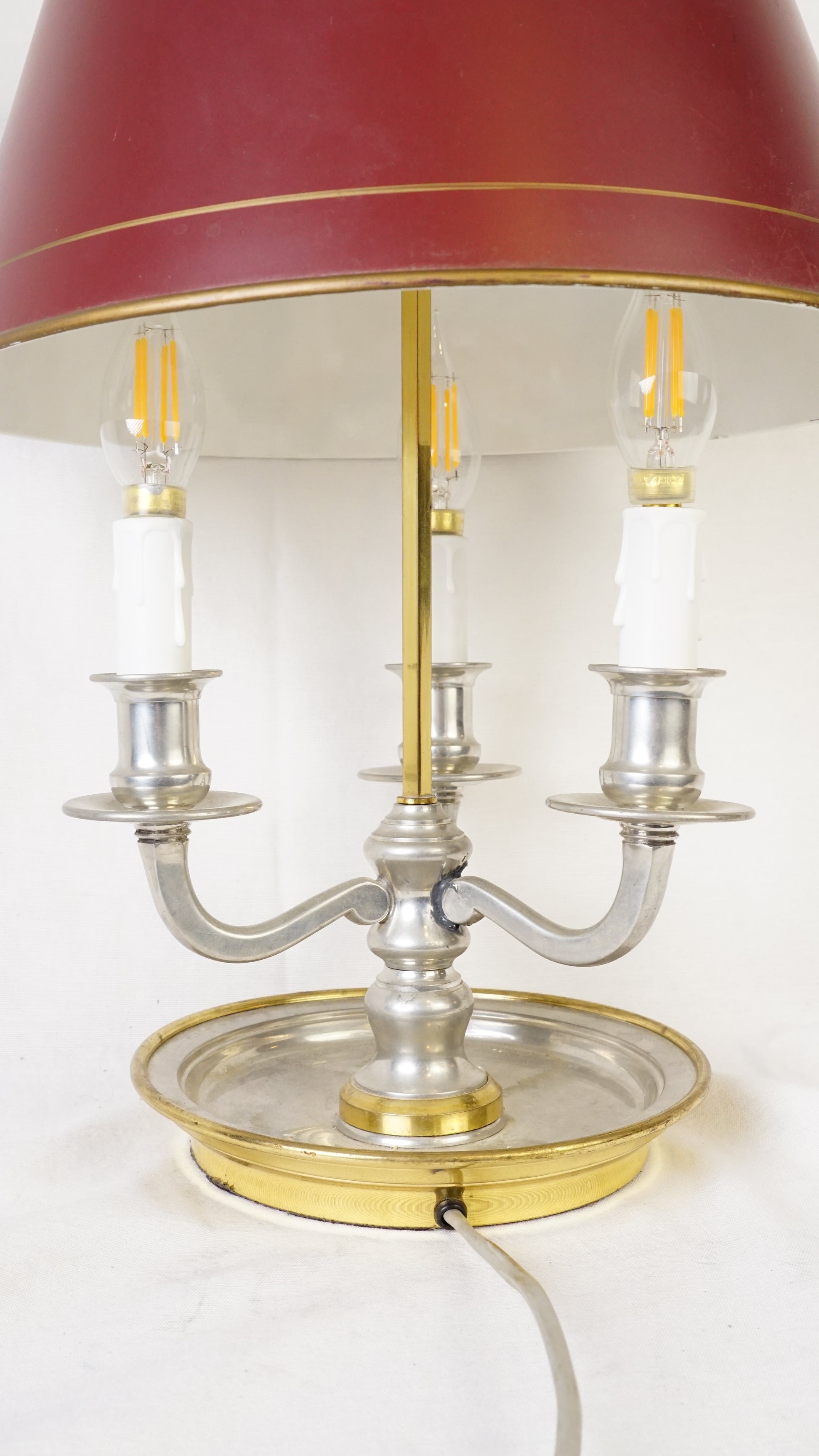 A classic bouillotte style table lamp with three candle-style lights and an adjustable burgundy tole shade, finished with fine gilt pin-striping. The mix of warm brass and silvery metal gives it that tailored, library-ready look, perfect on a desk, entry console, or beside a reading chair when you want softer, layered light with a little European attitude.