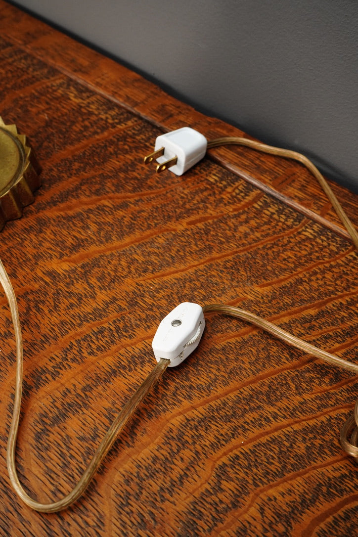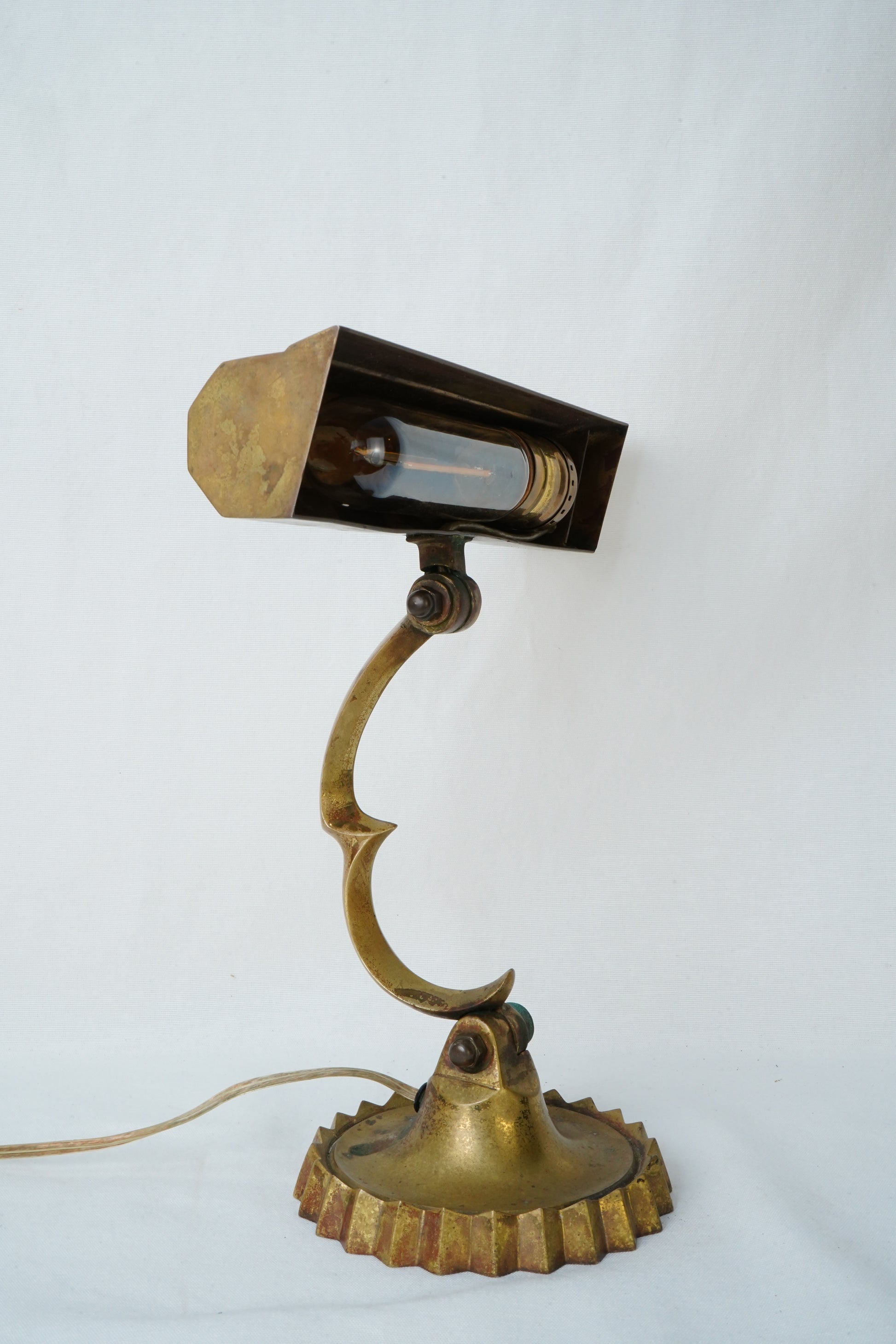 A compact brass desk lamp with a sculptural, Art Deco inspired curve and an adjustable head that throws a warm, focused pool of light. The stepped base and aged brass finish give it that perfectly collected look, ideal on a writing desk, bedside table, or styled into a bookshelf vignette where you want small scale character with big presence.