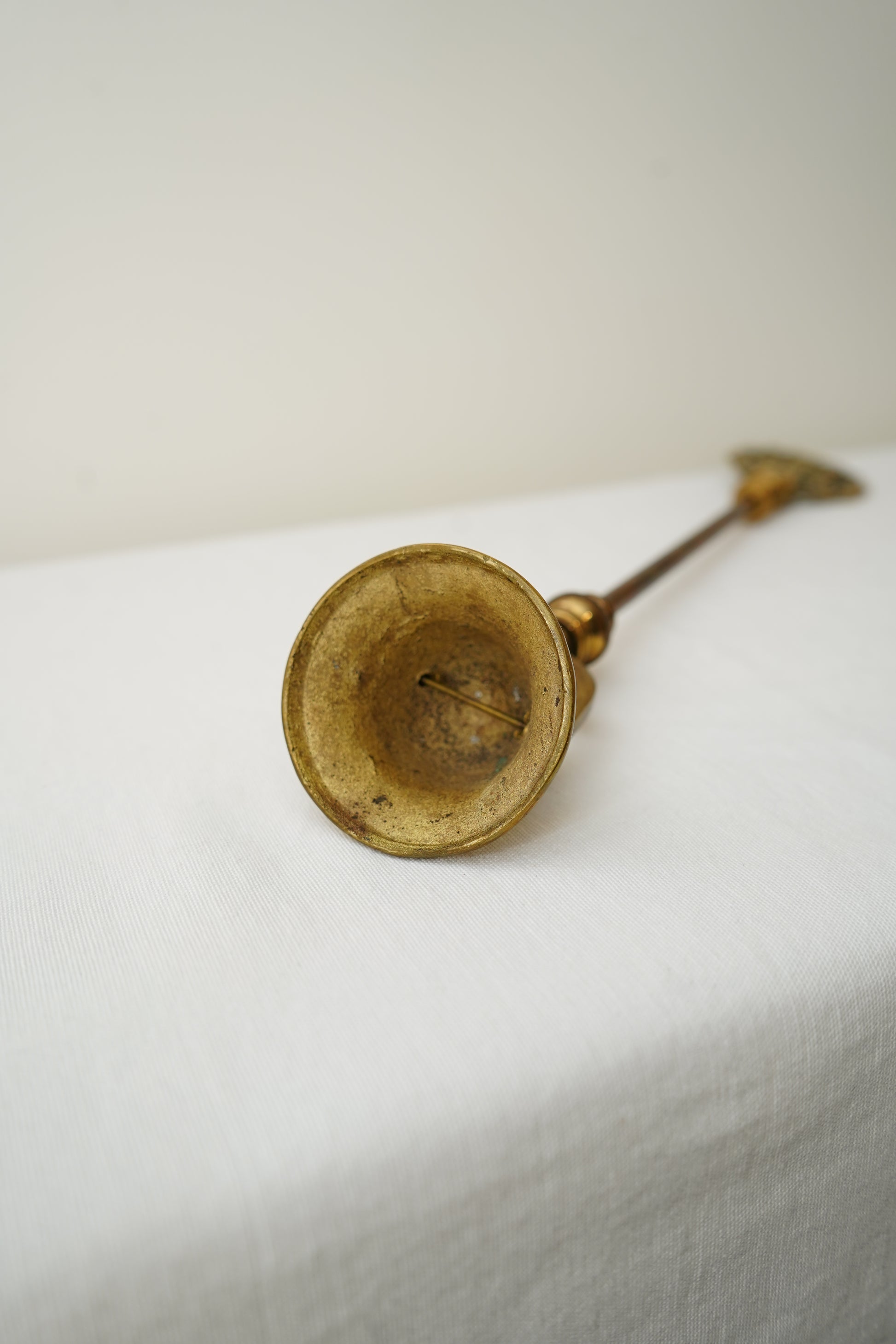 The brass shows scattered surface scratches and rub marks, with darker patina and oxidation in recessed areas. The interior of the bell shows soot residue and spotting consistent with prior use