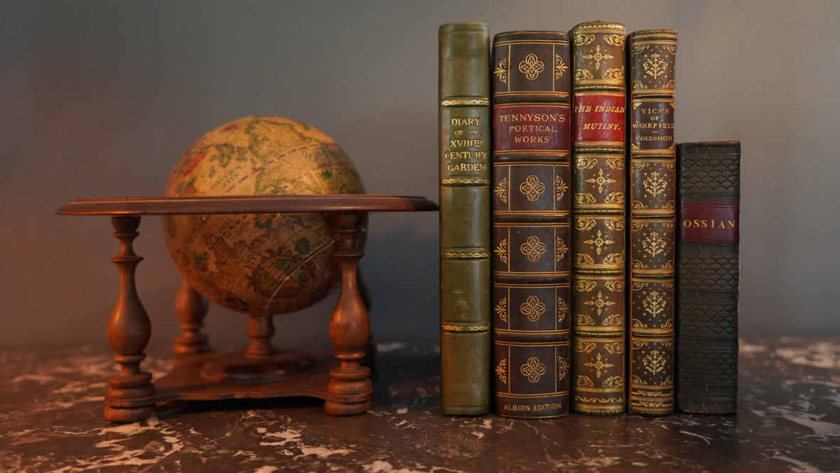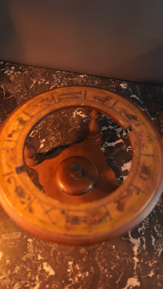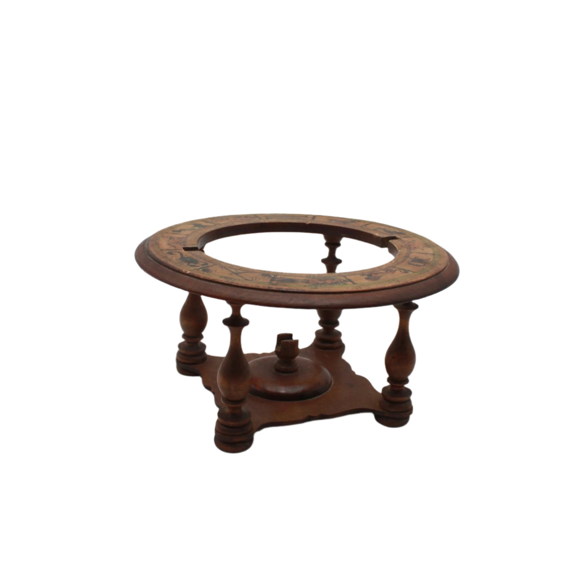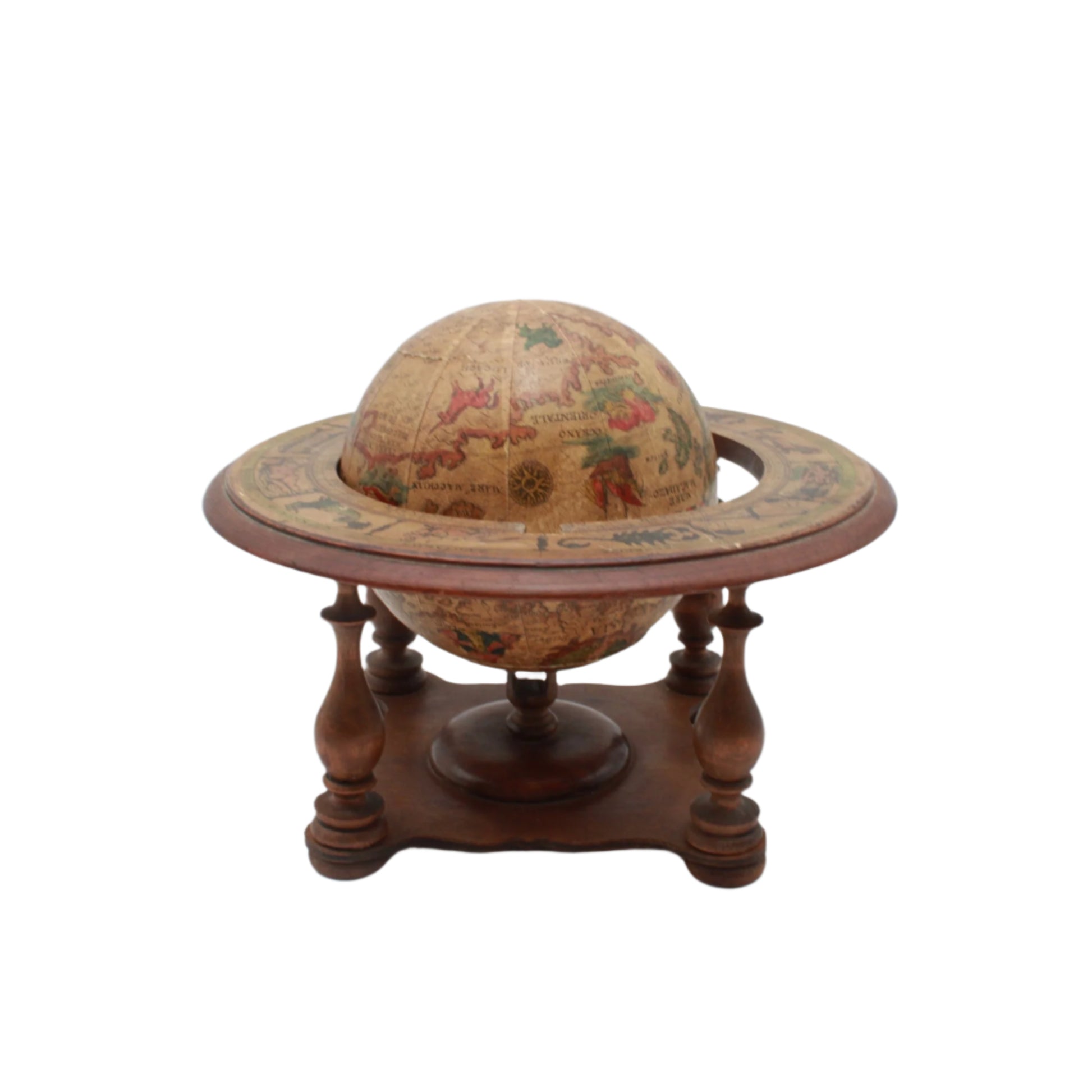 The globe is missing the pieces that would hold it securely into place and not move around. There is loss to the decorative details throughout.