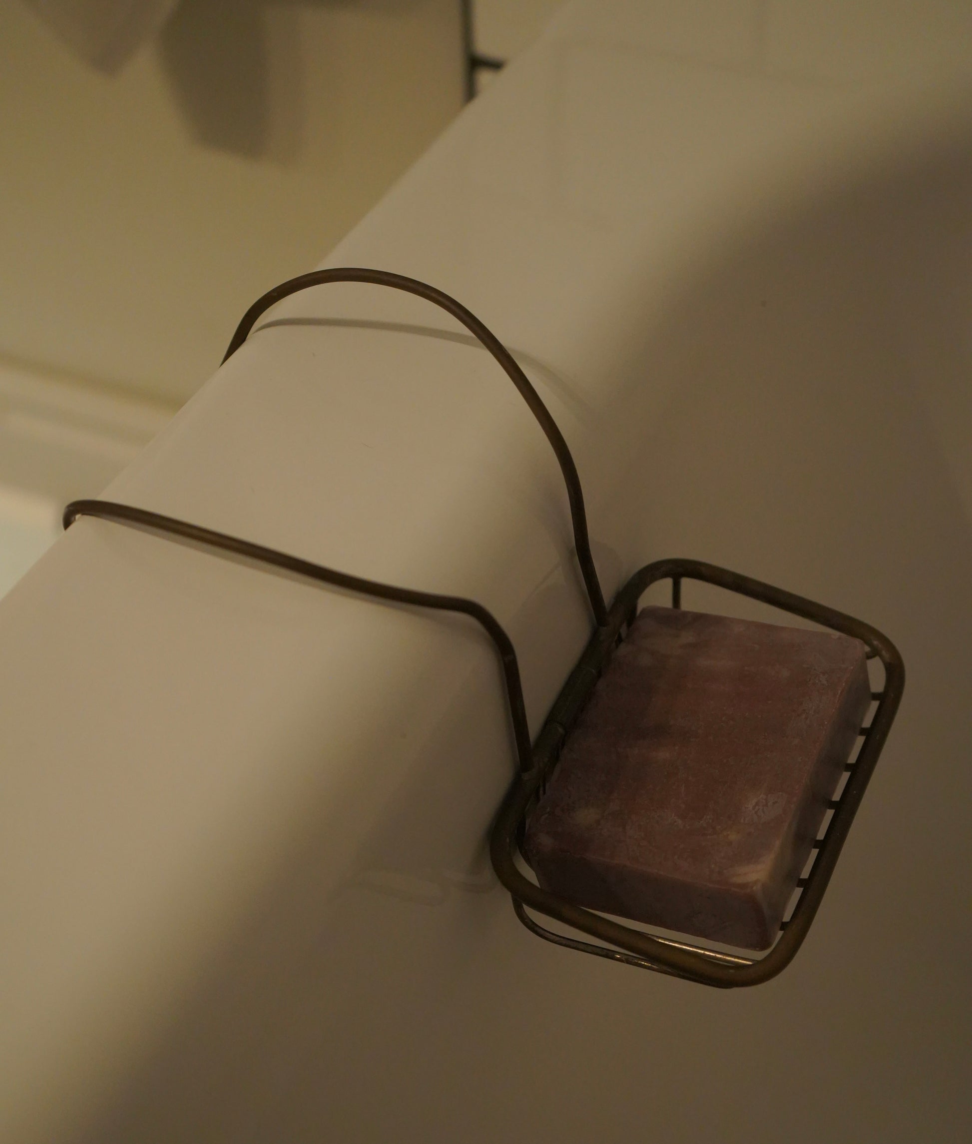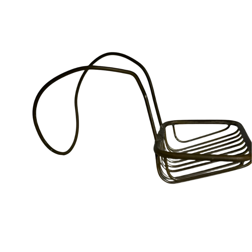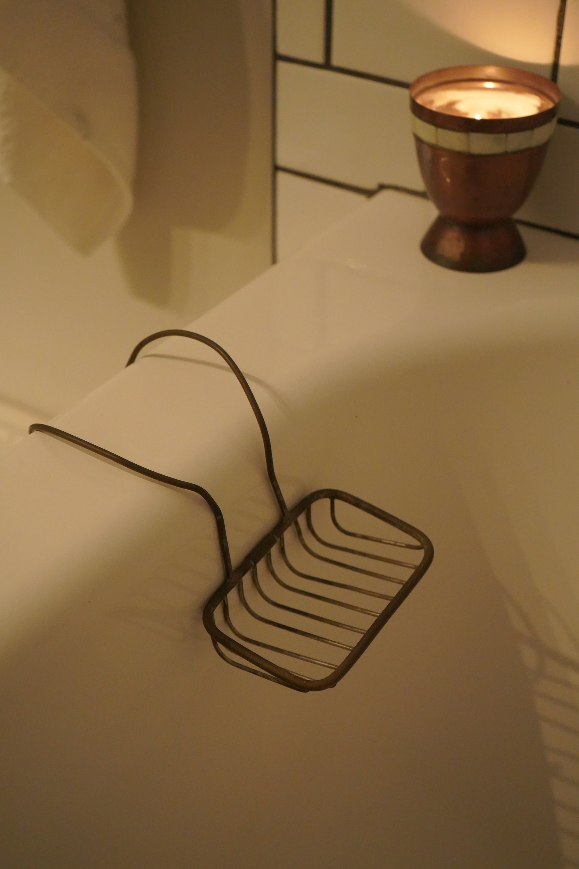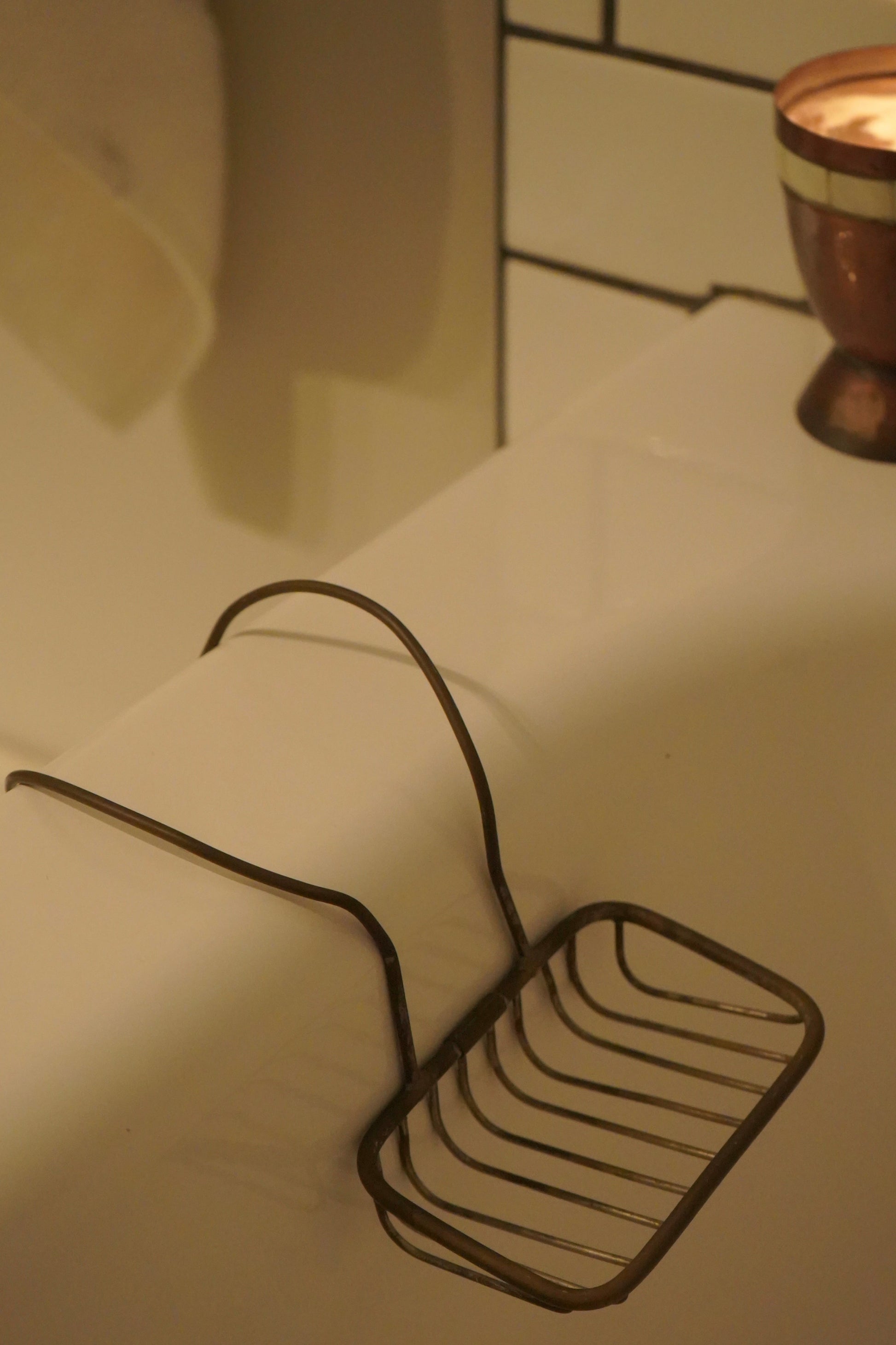 Meet your new favorite bathroom accessory: a genuine late-Victorian brass soap basket (circa 1890–1920) that simply hooks over the rim of your tub and gives your daily routine a dash of old-school charm. Crafted from solid brass wire and left with its mellow honey patina intact, it drains water beautifully so your soap stays firm and lasts longer. Compact enough for any bath—around 5″ wide and 3″ deep—this little basket was once a must-have in homes where soaking was as much about relaxation as getting clean. Originals like this are hard to find (most got swapped for chrome in the 1930s–’40s).