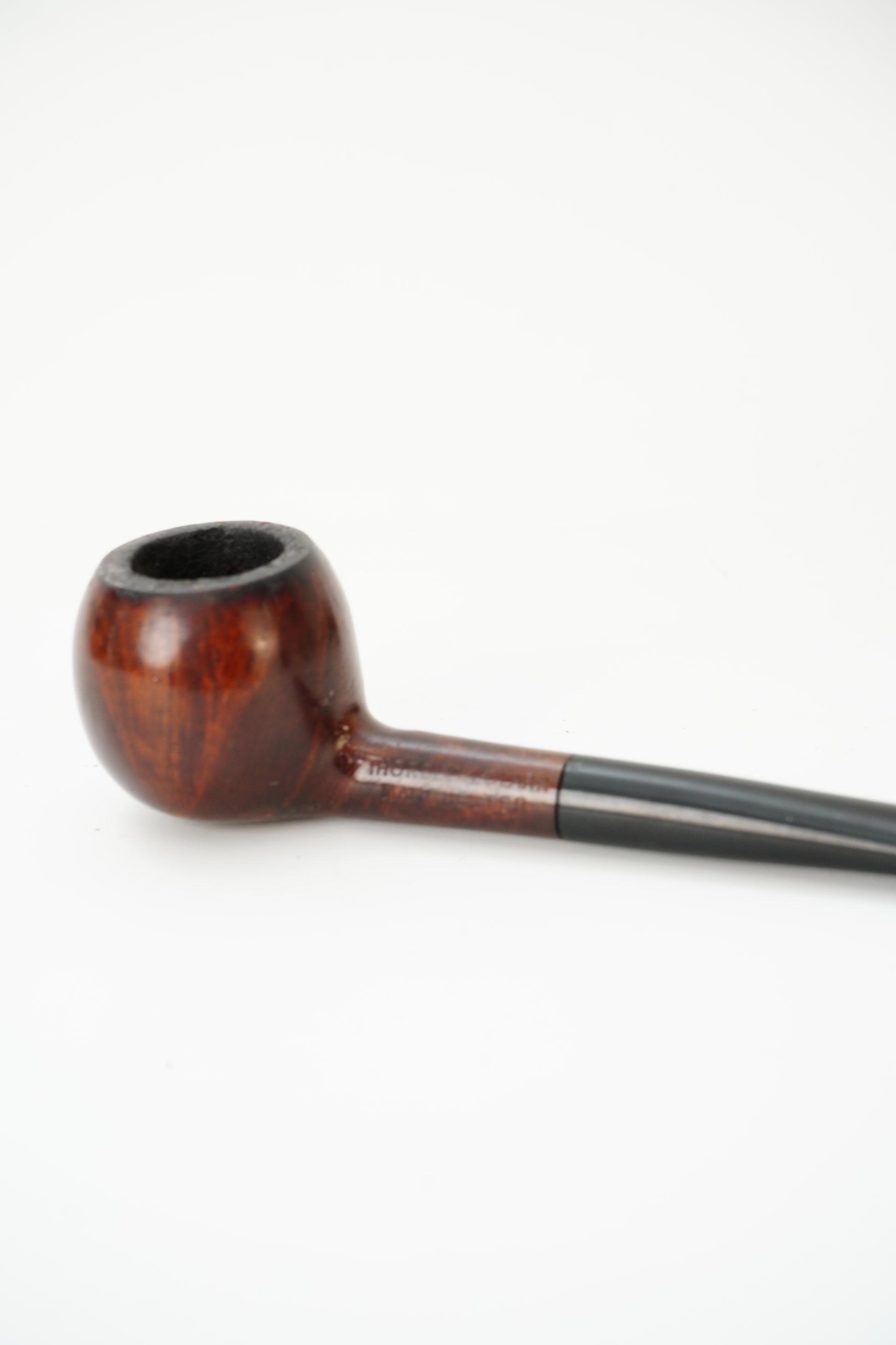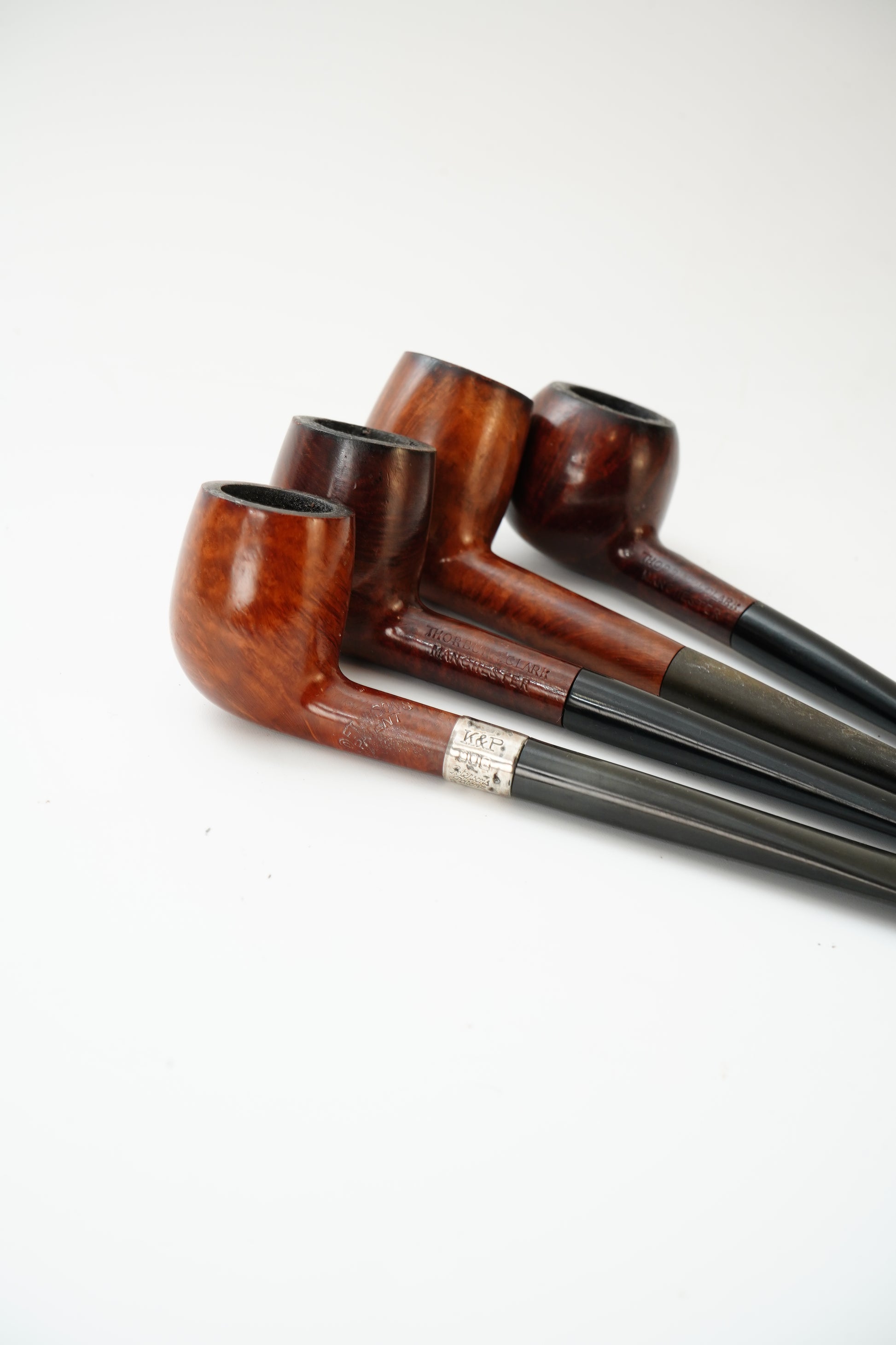 A handsome set of four vintage briar tobacco pipes with classic mid-century styling. This group includes a pipe with a K&P sterling silver mount associated with Irish pipe making traditions, plus an English tobacconist stamped example marked Thorburn Clark of Manchester. Each pipe features warm stained briar bowls and long tapered black stems for a clean, traditional profile that looks great displayed in a pipe rack, library décor, or on a desk.