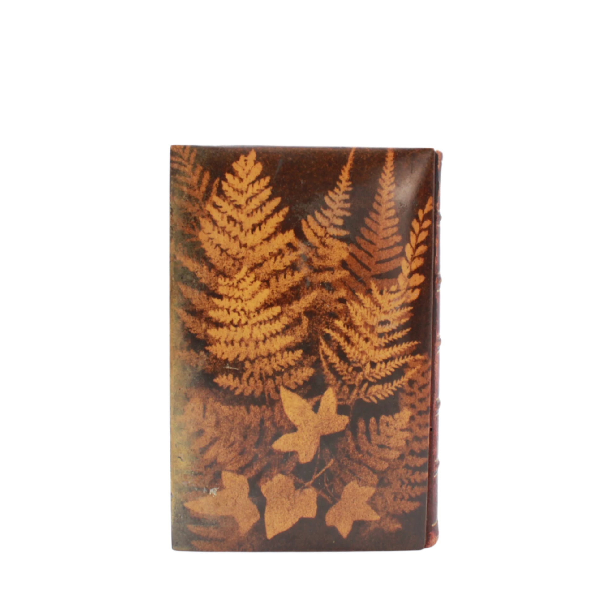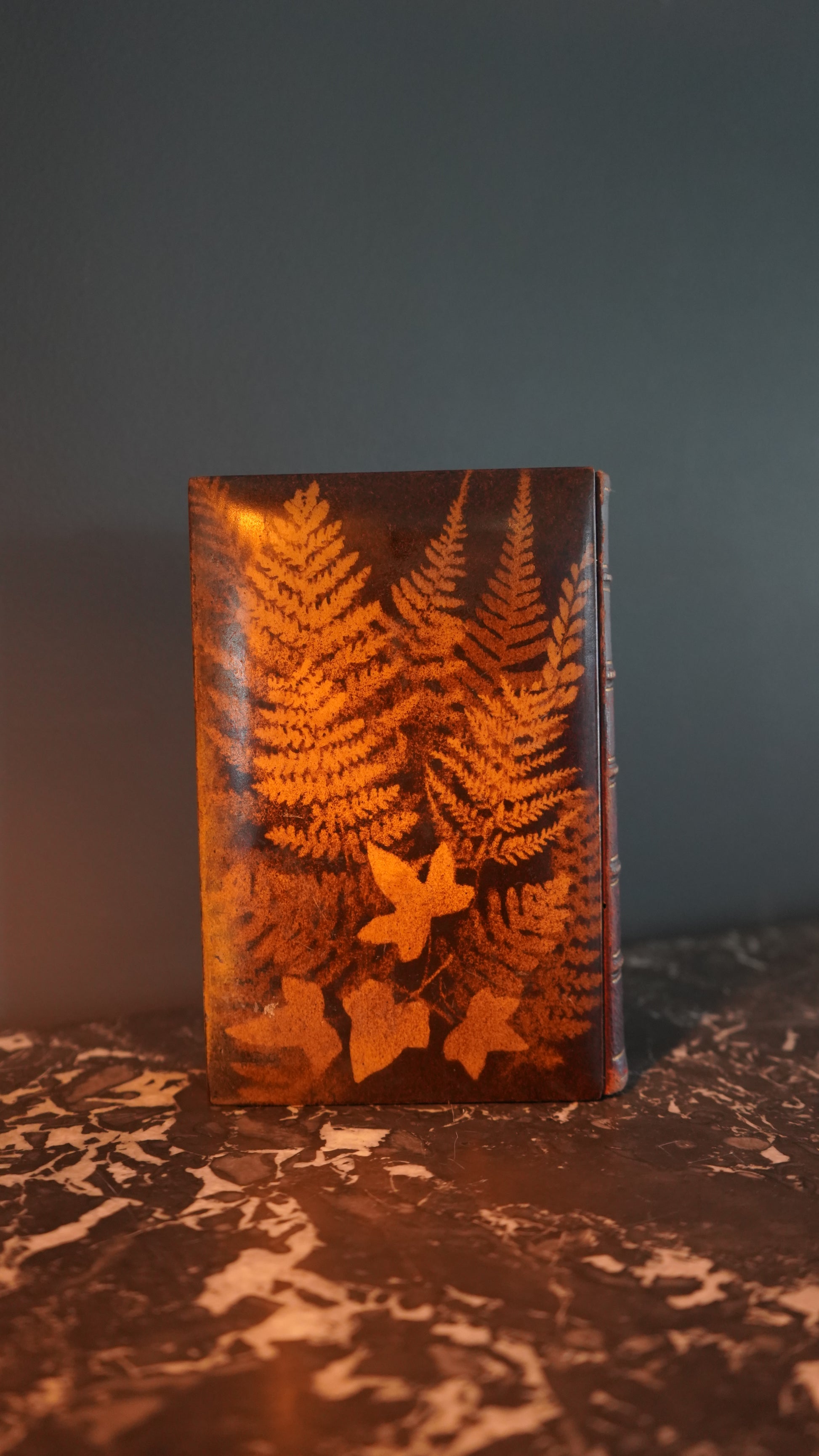 The volume is in good overall condition. The decorative leather boards show only mild rubbing at the edges and corners, though some wear is evident around the spine extremities. The gilt fern-and-ivy design remains generally bright and distinct, with only minor fading in spots. Internally, the binding is sound, and while the pages exhibit light foxing, particularly near the frontispiece and title page, the text and illustrations are largely clean.