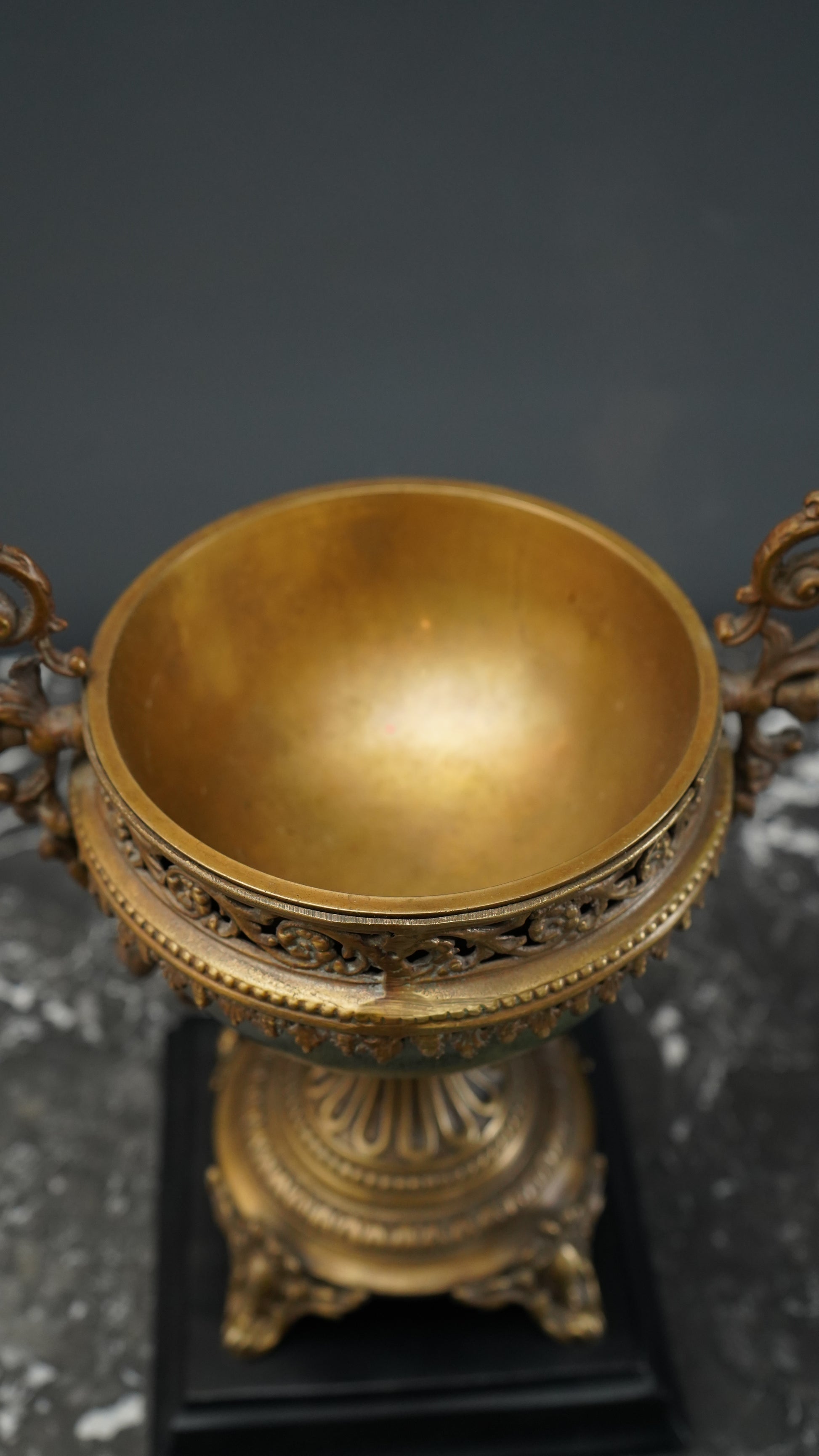 This neoclassical-style decorative urn brings that rich, old-world presence to a space without feeling overly formal. Made for Castilian Imports in the late 20th century, it was created in the spirit of European salon décor, drawing from French Empire and Italian Renaissance influences. The form echoes classical two-handled libation urns, finished with ornate pierced detailing, scrolled handles, and a beautifully weighted gilt metal base.