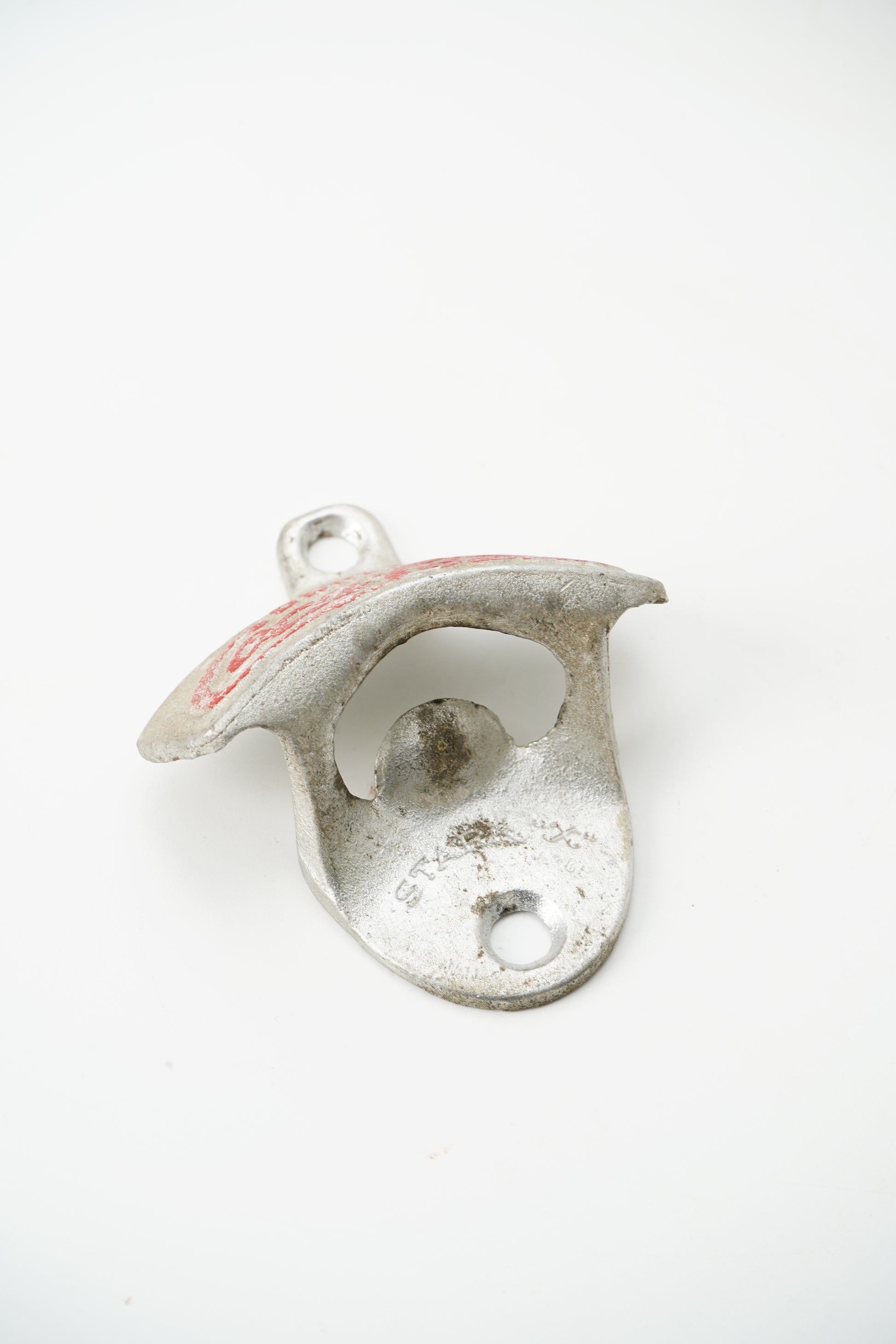 A classic piece of Coca Cola barware and advertising hardware, this wall mounted bottle opener features the iconic Drink Coca Cola script in red. Made in cast metal with two mounting holes, it is designed to be permanently installed on a wall, bar rail, cabinet, cooler surround, or outdoor drink station. The arched cap lifter form is the well known Starr style opener shape, a staple of soda shop counters and home bars for decades.