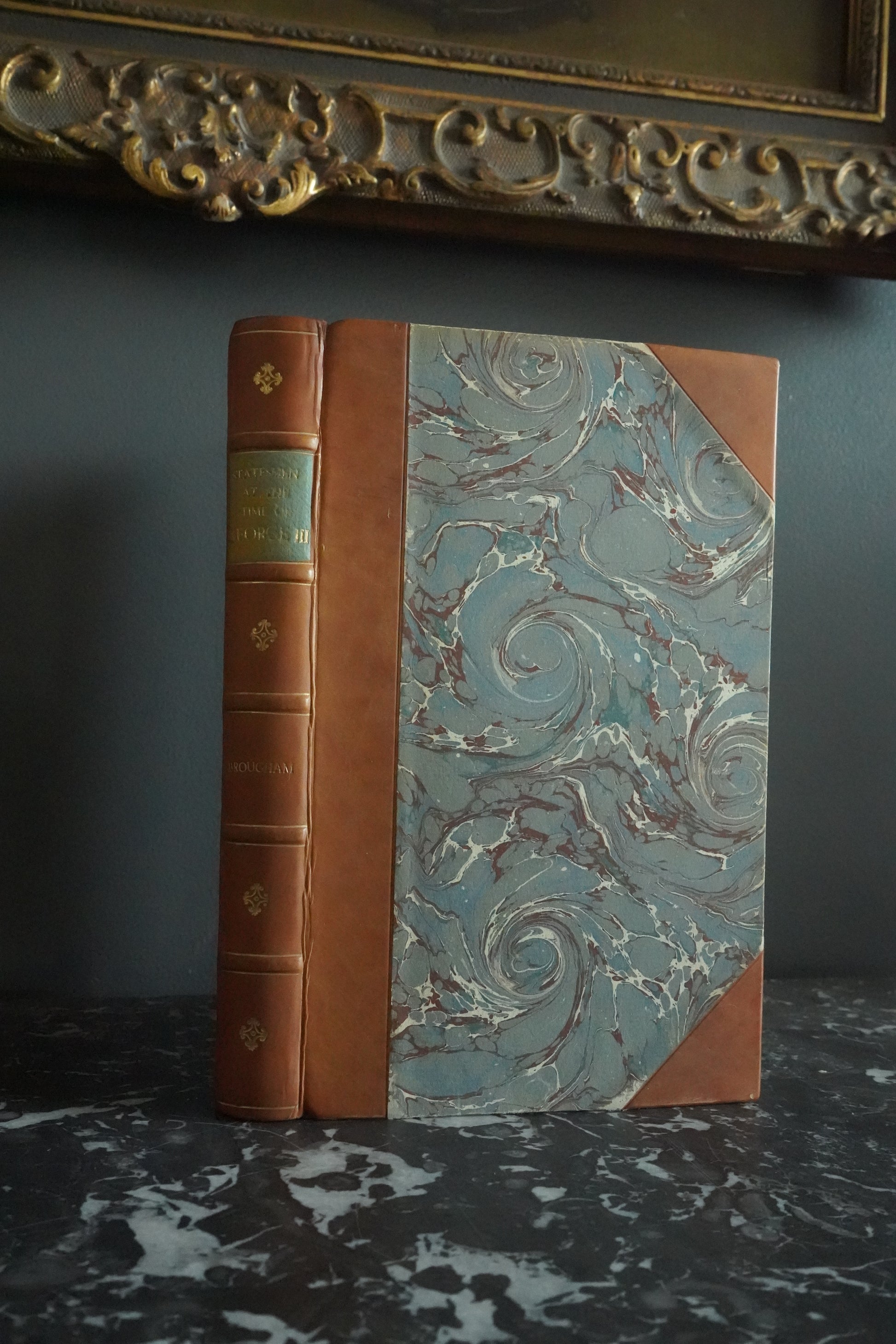 Set against the backdrop of one of the most tumultuous periods in British history, this work serves as a bridge between Georgian and Victorian political thought, offering modern readers a glimpse into both the personalities and the philosophical struggles that defined the late 18th and early 19th centuries. What makes this copy even more exciting is its binding: a beautifully preserved period-style half leather binding with rich marbled paper boards, featuring vibrant swirling patterns that give the piece a lively, dynamic feel. The tan leather corners and spine are enhanced with delicate gilt embellishments, and the title label on the spine still shows traces of its original green hue. Adding a touch of distinguished provenance, the inside cover bears an elegant Ex Libris plate from Paul de Ville Hosier, suggesting a noble or scholarly prior owner.