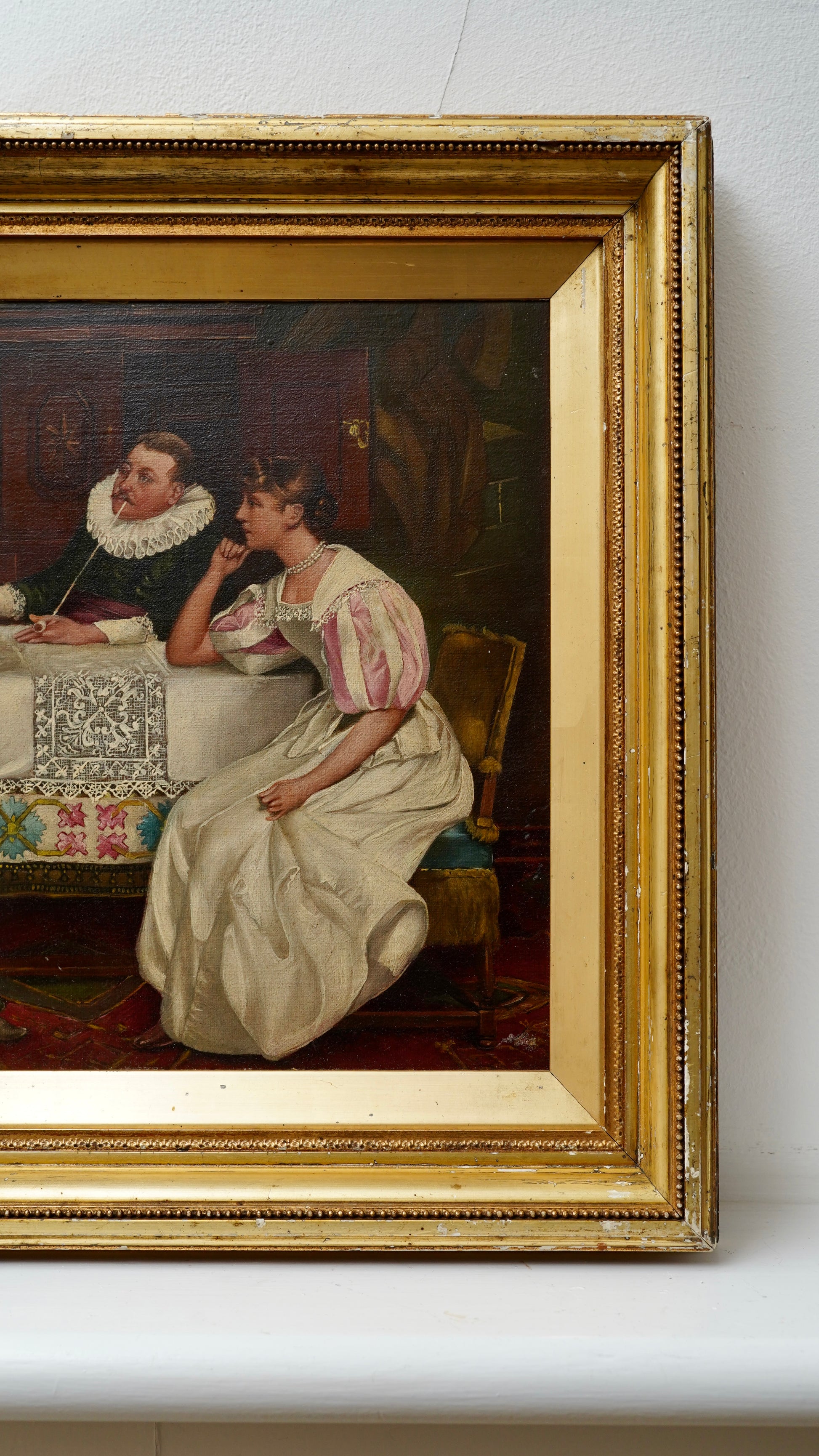A beautiful example of the revivalist genre that bridged past and present, this piece is set within its original giltwood frame with a beaded inner border. The varnish has mellowed to a warm amber tone, enhancing its soft interior light and painterly depth.