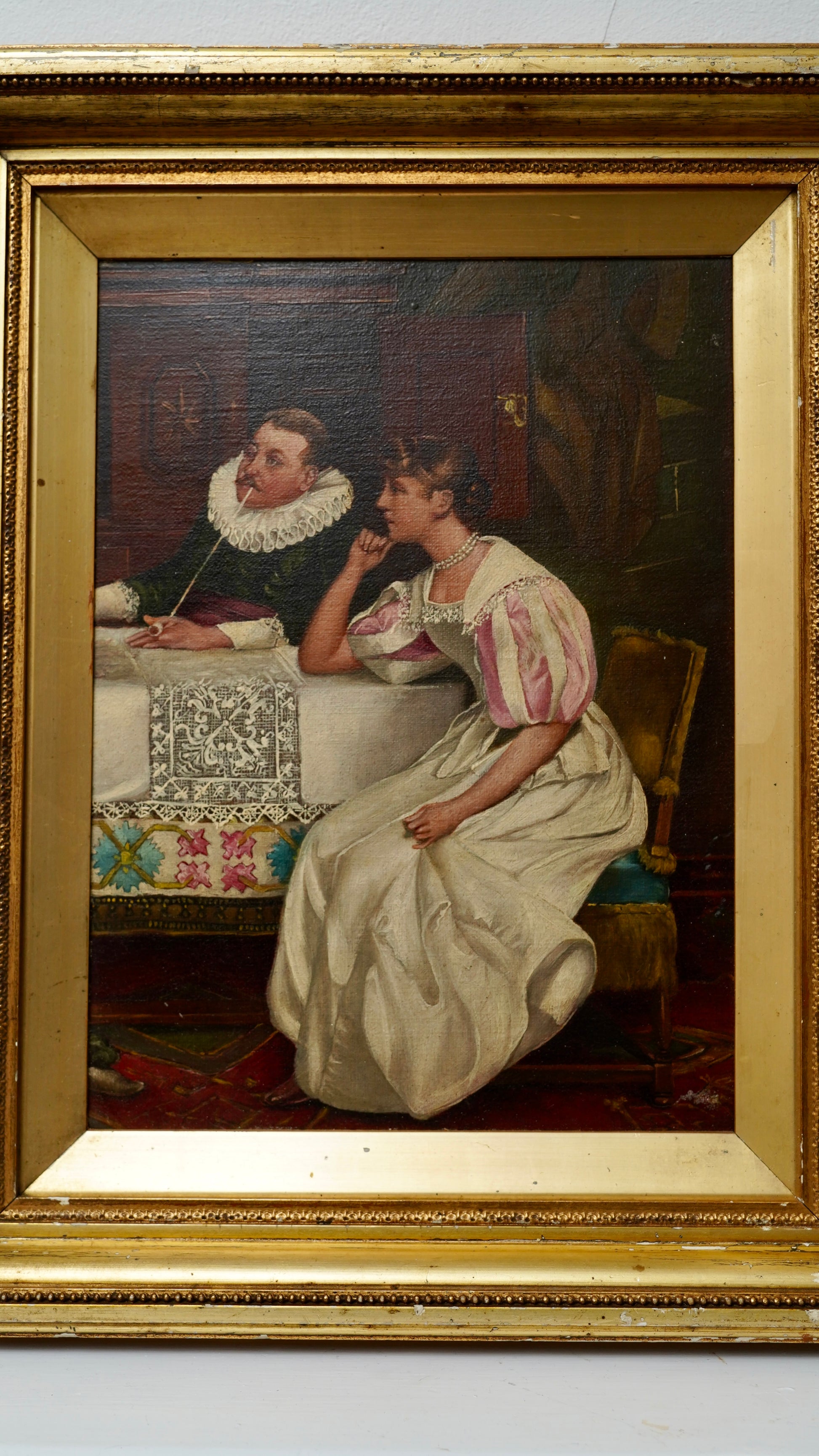 A late Victorian oil on board attributed to London artist Henry S. Cook, circa 1890s. Painted in the refined academic style of the English genre tradition, this work captures a moment of quiet reflection between two seated figures, a gentleman pausing mid-pipe and a young woman leaning forward in thought.