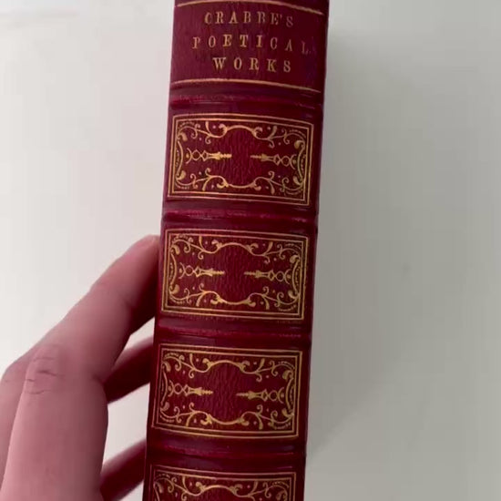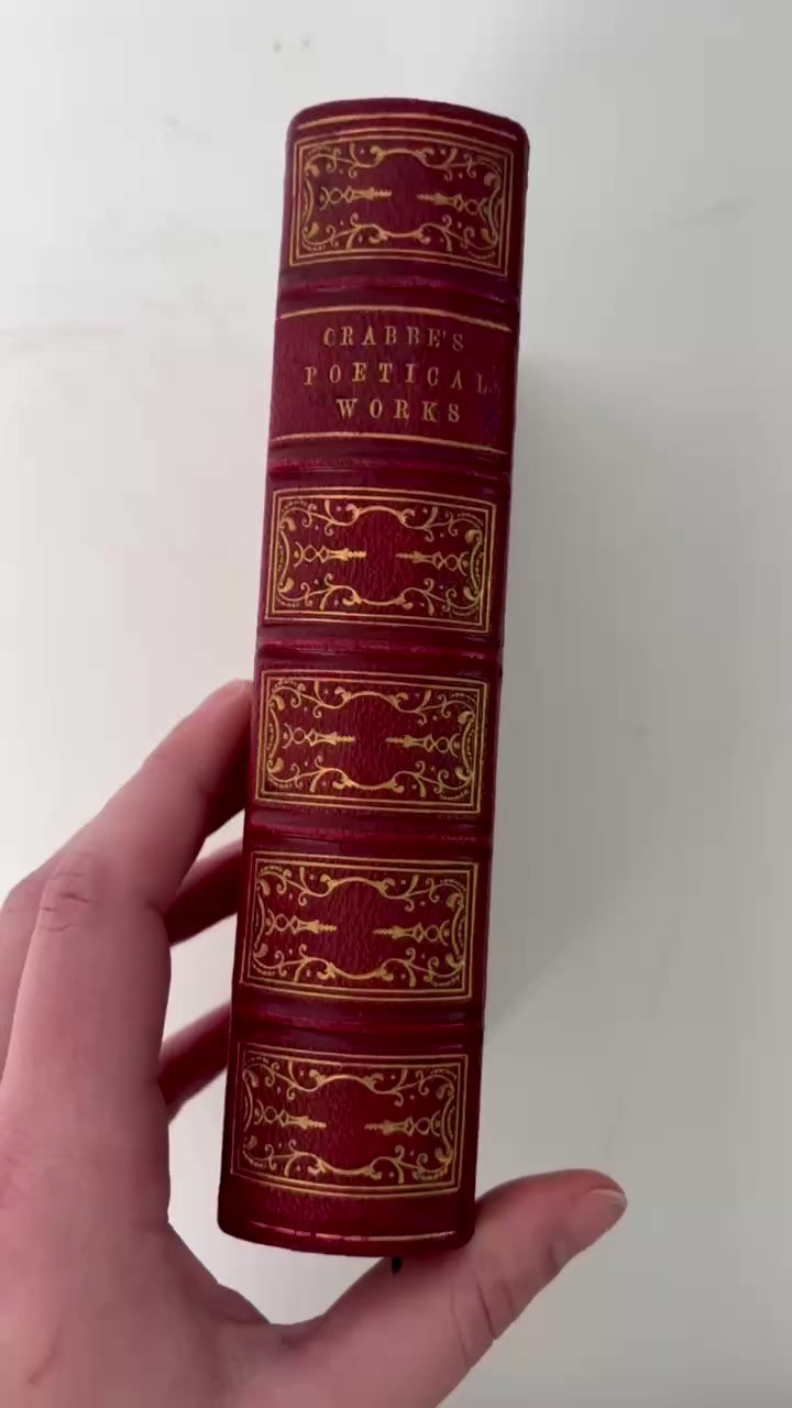 A richly bound Victorian edition of George Crabbe’s Poetical Works, published in London by Charles Daly and dated closely by the prize label to 1858. This copy has real shelf presence with its deep red decorative binding, bright gilt tooling, raised bands, and fully gilt page edges. It also includes engraved illustrations throughout, including a portrait of Crabbe and scene plates that give the volume the look collectors want in a mid-Victorian gift or school prize book.