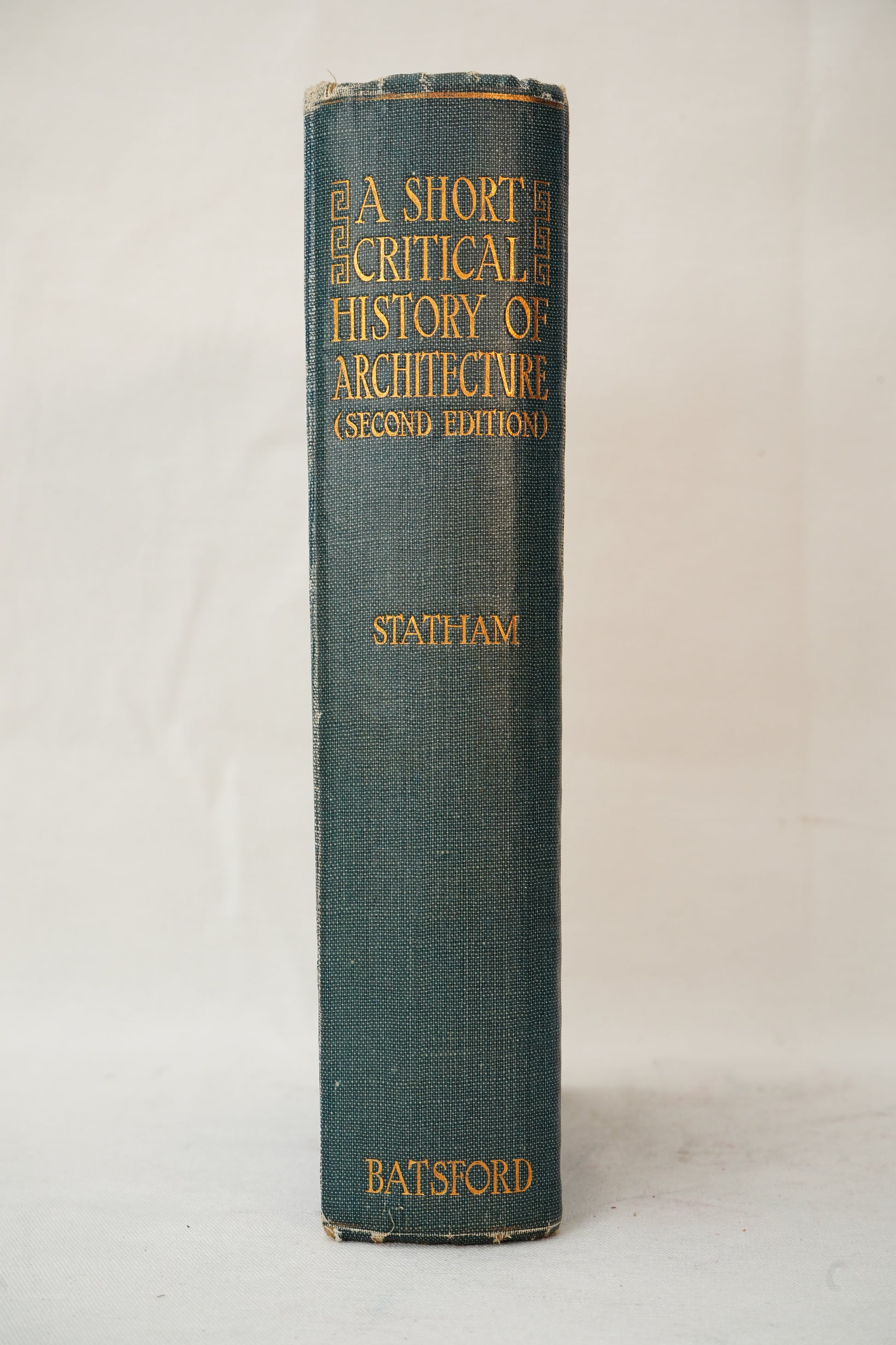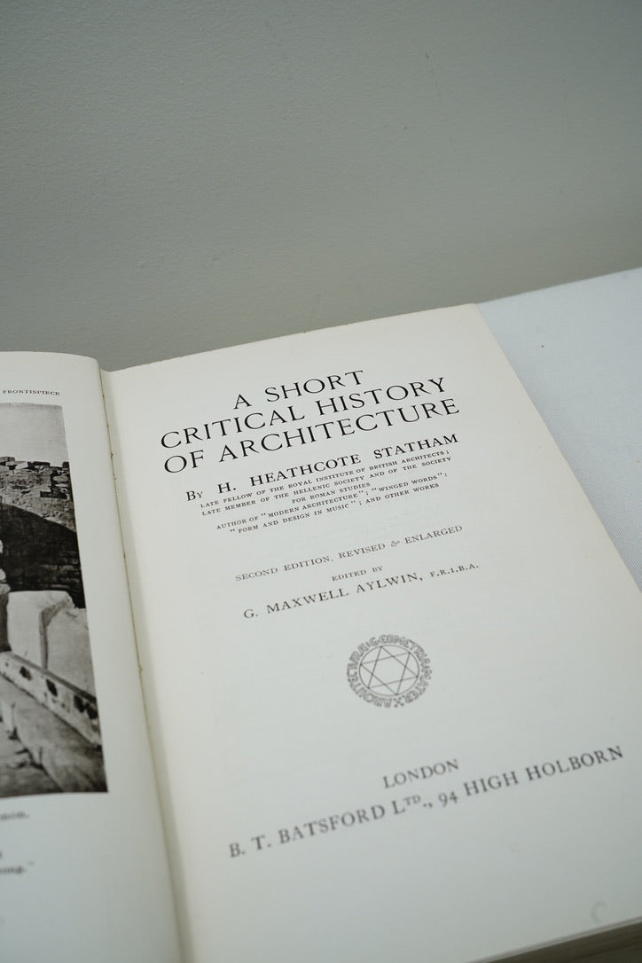 Step into the world of temples, cathedrals, and early modern design with A Short Critical History of Architecture (Second Edition) by H. Heathcote Statham, revised and enlarged, and edited by architect G. Maxwell Aylwin. Published in London by B. T. Batsford Ltd., this is the 1927 second edition, a classic early 20th century overview written at a moment when architecture was rapidly changing and “modern” design was beginning to challenge centuries of tradition. The book moves through major eras in a clear, storylike progression, from Egyptian and Greek foundations to Roman engineering, Romanesque and Gothic grandeur, Renaissance balance, and into the modern world, making it a fantastic starter reference for architecture lovers and a handsome decorative object for shelves and styling. The deep blue cloth binding is beautifully gilt stamped, featuring a vertical “timeline” of architectural styles on the front board and bold gilt lettering on the spine, the kind of design that looks instantly smart in a library, office, or studio. A photographic frontispiece adds period character and sets the tone for a thoughtful, critical survey rather than a dry textbook.