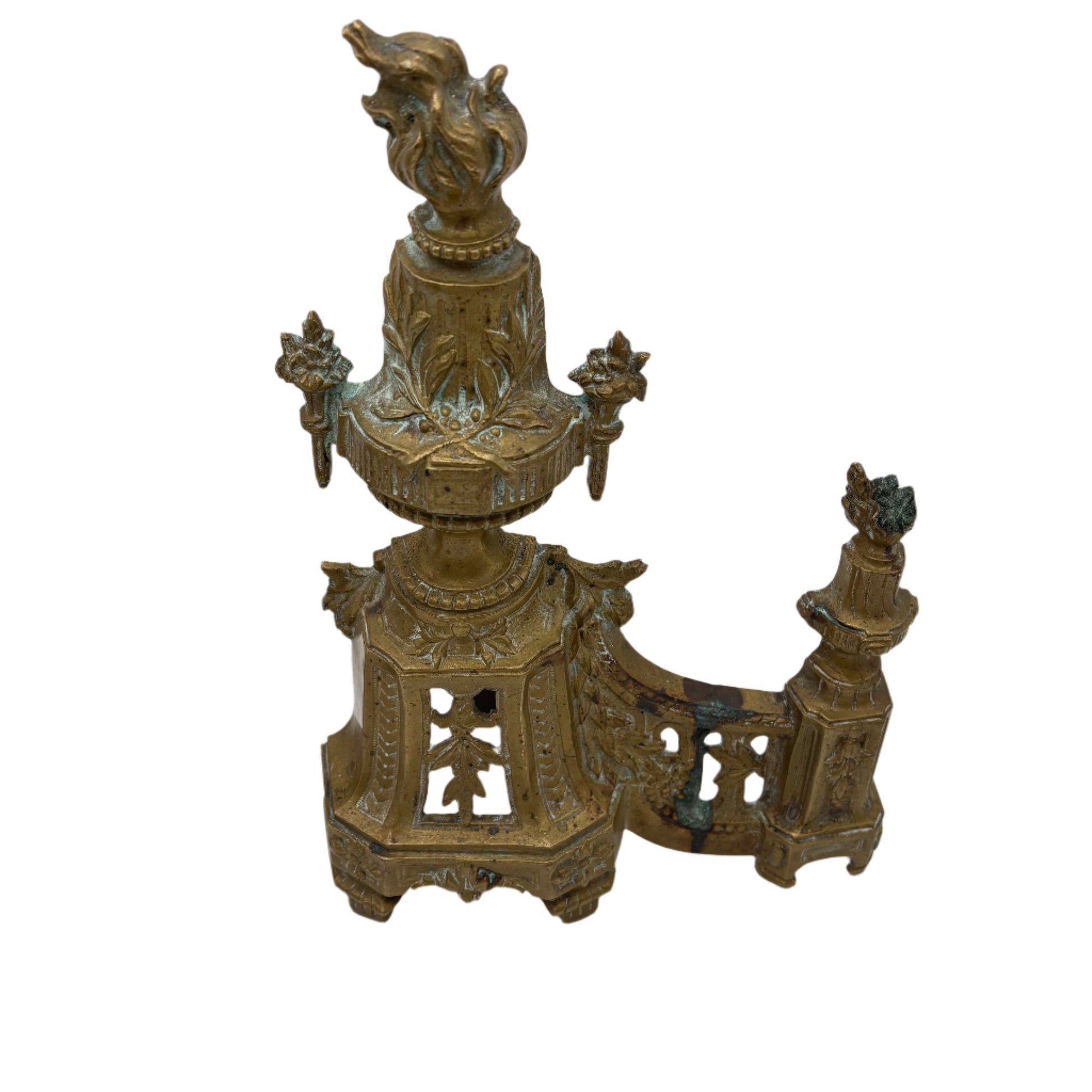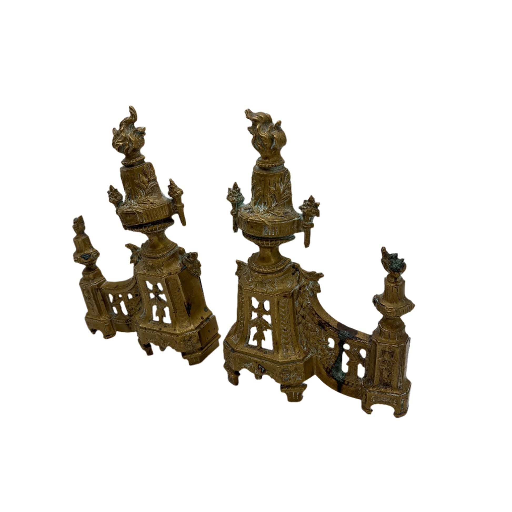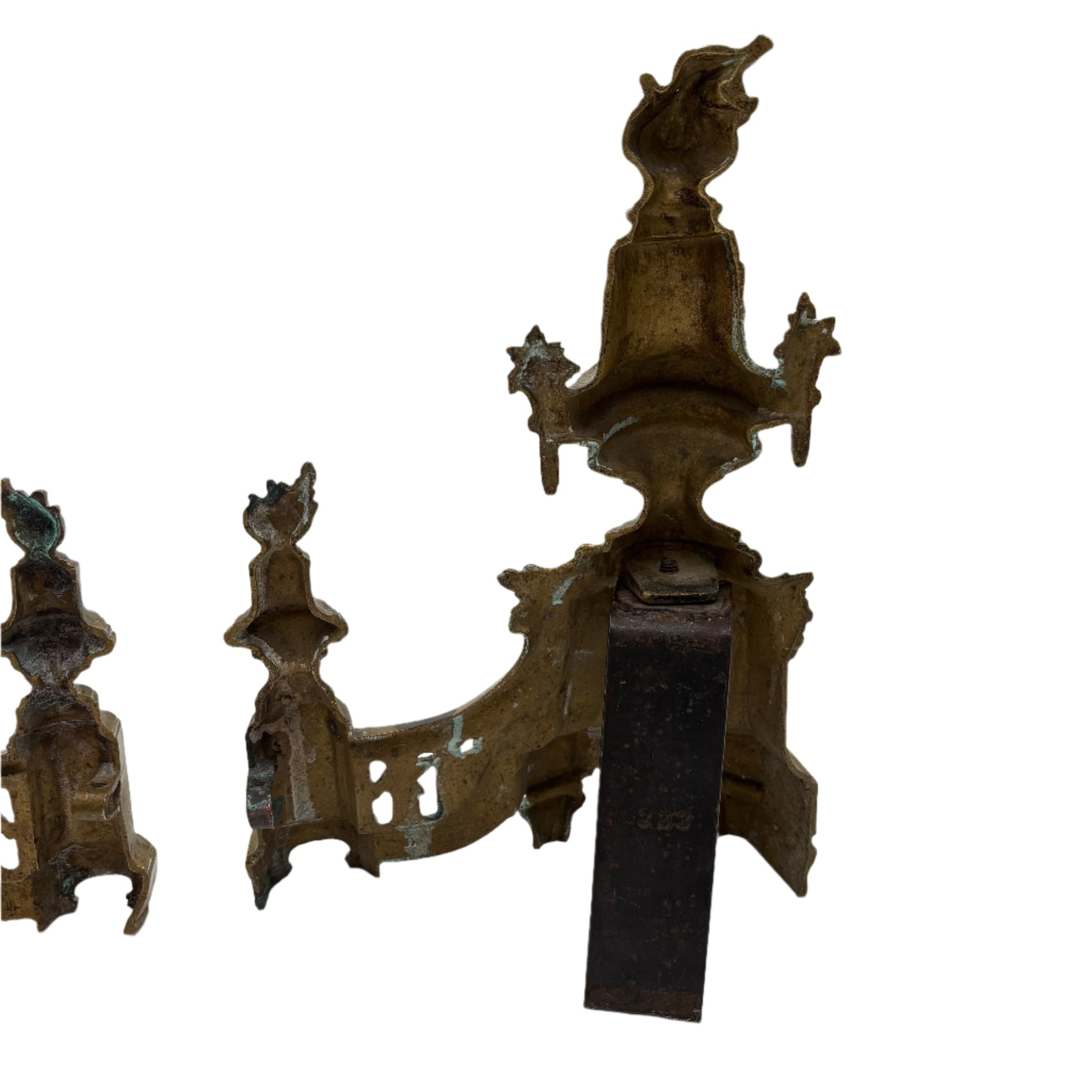 In good antique condition with visible patina and oxidation consistent with age. The brass surface shows areas of greenish verdigris, especially in recessed and detailed sections, which adds to their authenticity and charm. One andiron shows slightly more wear and darker patina than the other, suggesting they’ve aged naturally as a pair over time. No structural damage noted, and all cast elements are intact. Minor surface irregularities are original to the casting process.
