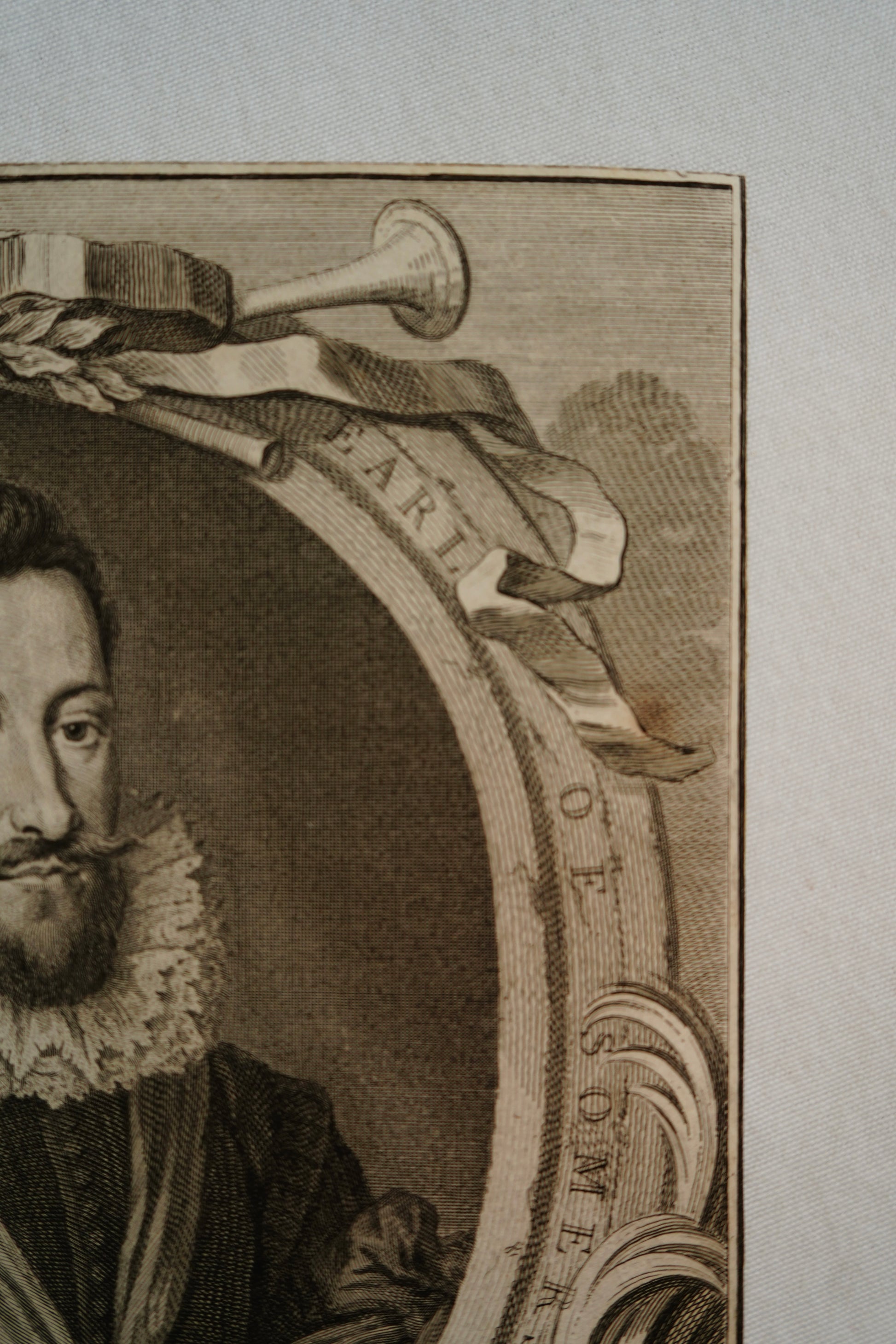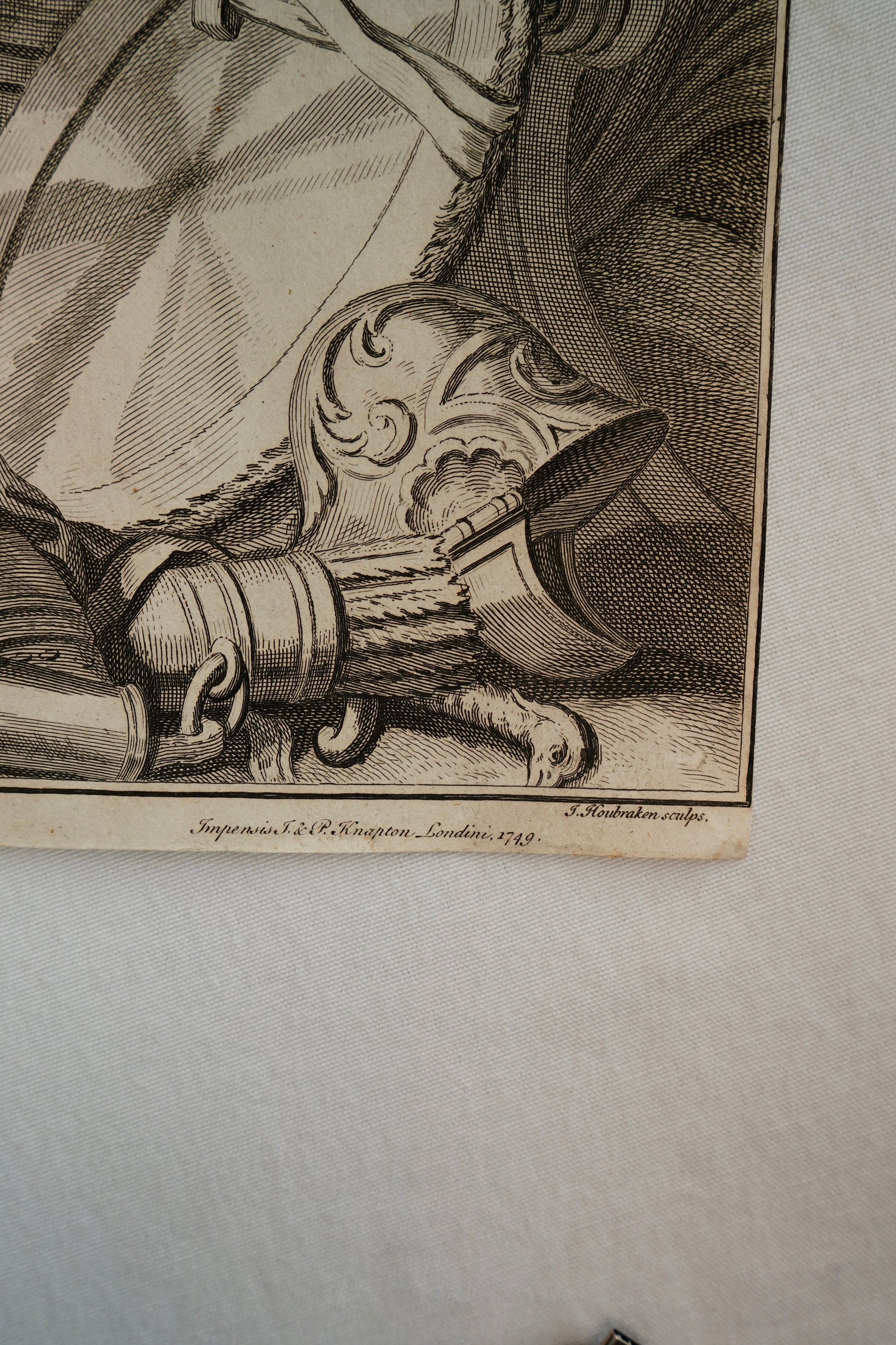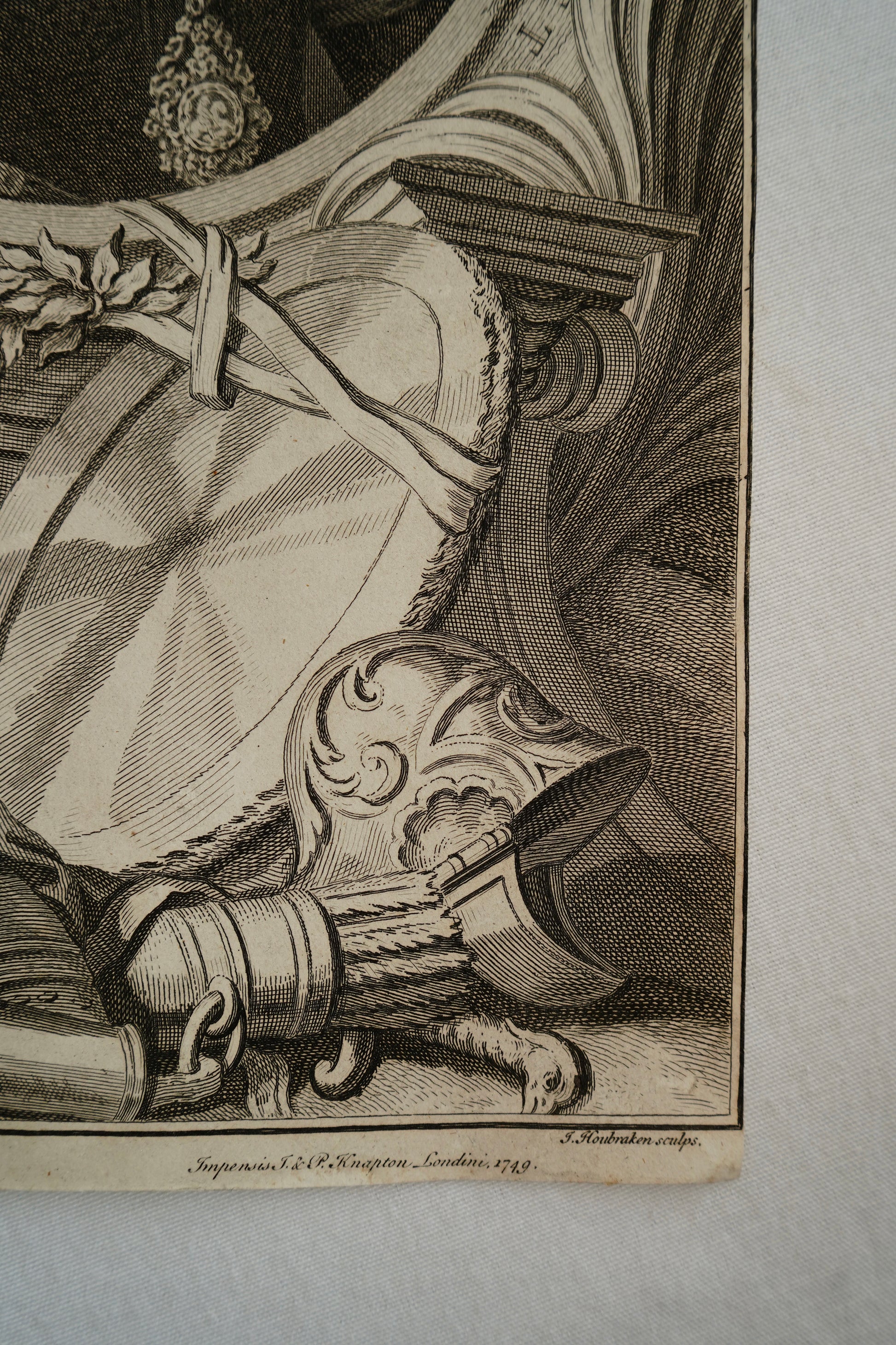 Jacobus Houbraken (1698-1780) was a Dutch engraver, apprenticed under his father, Arnold Houbraken (1660-1719). Houbraken’s style was similar to the portrait engravers of the great seventeenth century French school, most notably, Nanteuil, Drevet and Edelinck. He surpassed these masters in his ability to capture textures and tones. The Italian engraver, Raphael Morghen said, “No engraver has ever equalled, and probably will not equal, the Dutchman Jacobus Houbraken, in the manner of imitating the flesh and the hair by means of the graver.” He was sought after by both English and Dutch publishers. His most famous engravings for English publication were those for the historical series, "The Heads of Illustrious Persons of Great Britain", published in parts in London between 1734 and 1752. He worked alongside George Vertue (1684-1756), but most of the great portrayals were left to Houbraken, including those of Newton, Pope, Dryden, Shakespeare and Milton. Under the framed portrait of each individual, he designed and engraved the vignettes and objects associated with each person. Jacobus Houbraken's most important set of original portrait engravings, The Heads of Illustrious Persons of Great Britain, required almost twenty years to complete. The set contains one hundred and eight portraits of British luminaries dating from the 14th to early 18th centuries including Kings, Queens, noblemen, politicians, writers, scientists and philosophers.