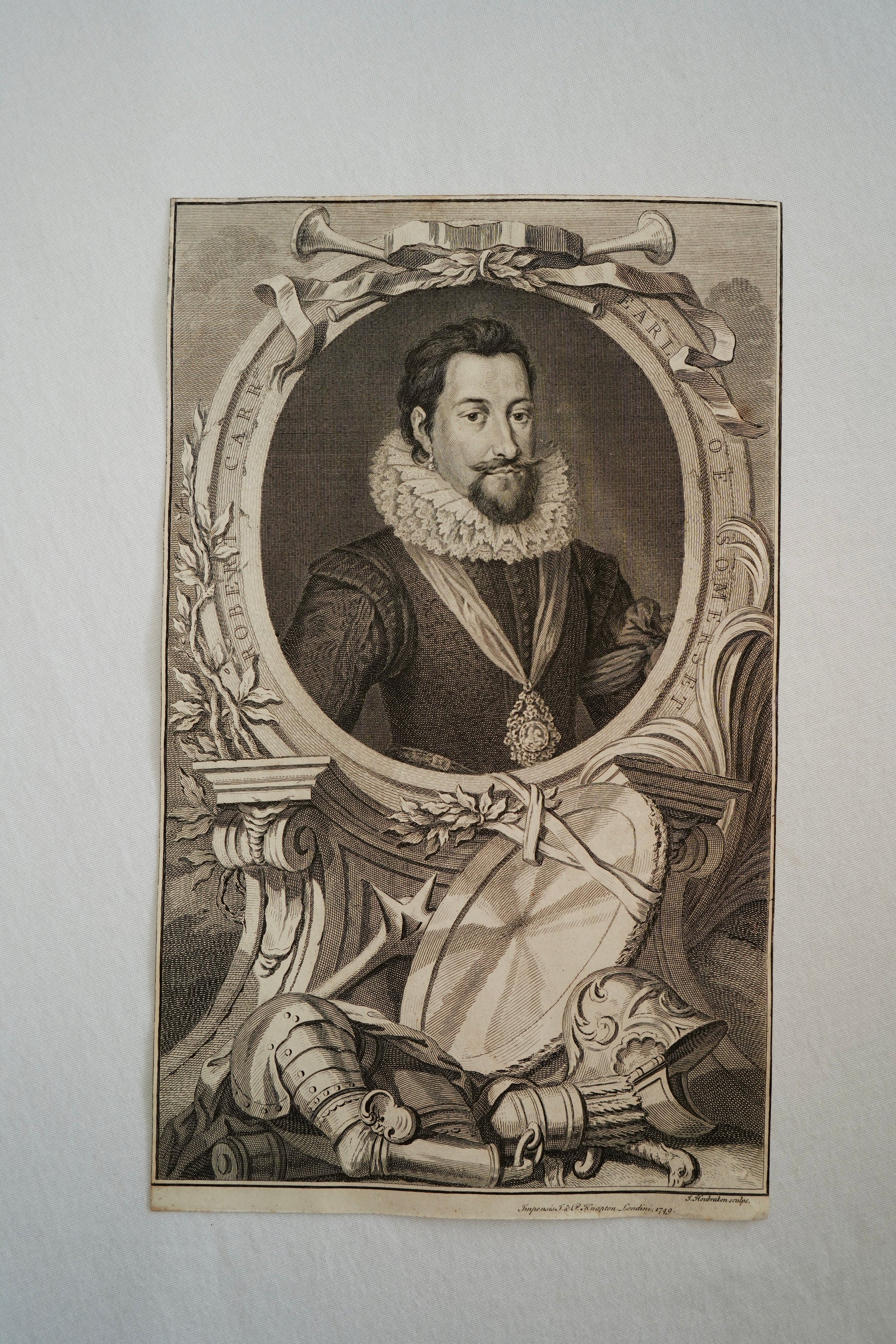 A late 18th or early 19th Century restrike engraving by Jacobus Houbraken (1698-1780), depicting Robert Carr, Earl of Somerset. Signed in plate. On wove.