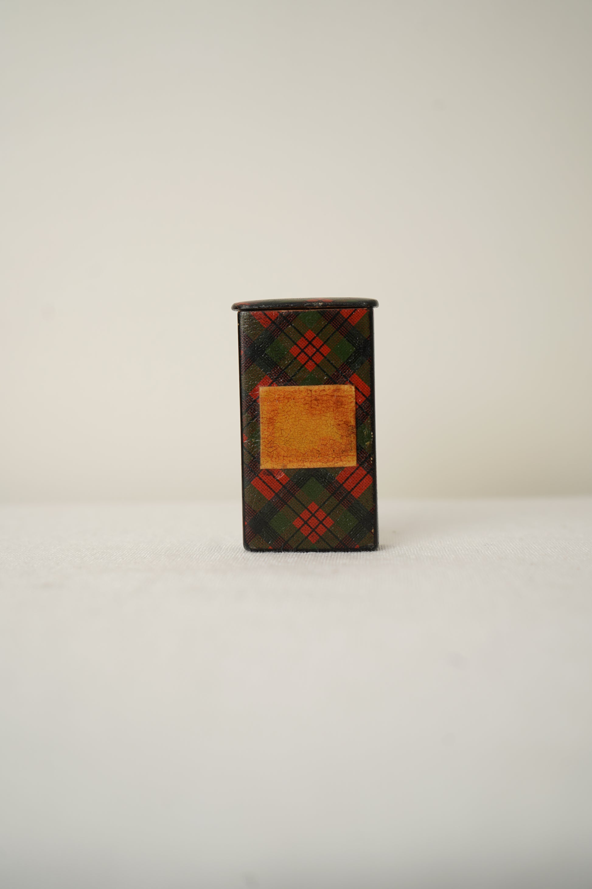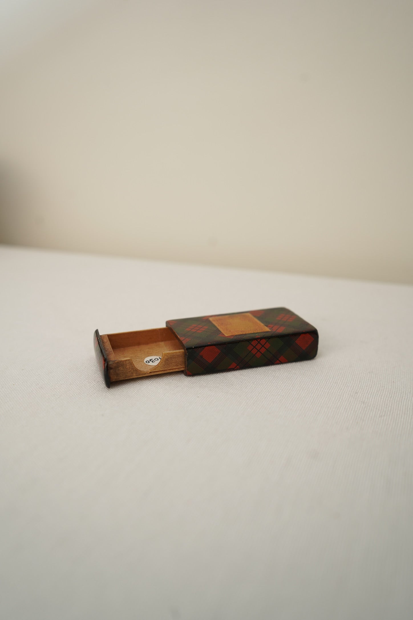 The box features a pull-out wooden drawer with a thumb notch, allowing easy access while maintaining a compact, elegant form. A blank cartouche on the front was intended for a monogram or retailer label, though many examples were left unmarked, as seen here. The rich green and red tartan palette remains visually striking and pairs beautifully with writing desks, silver accessories, or curated shelves.