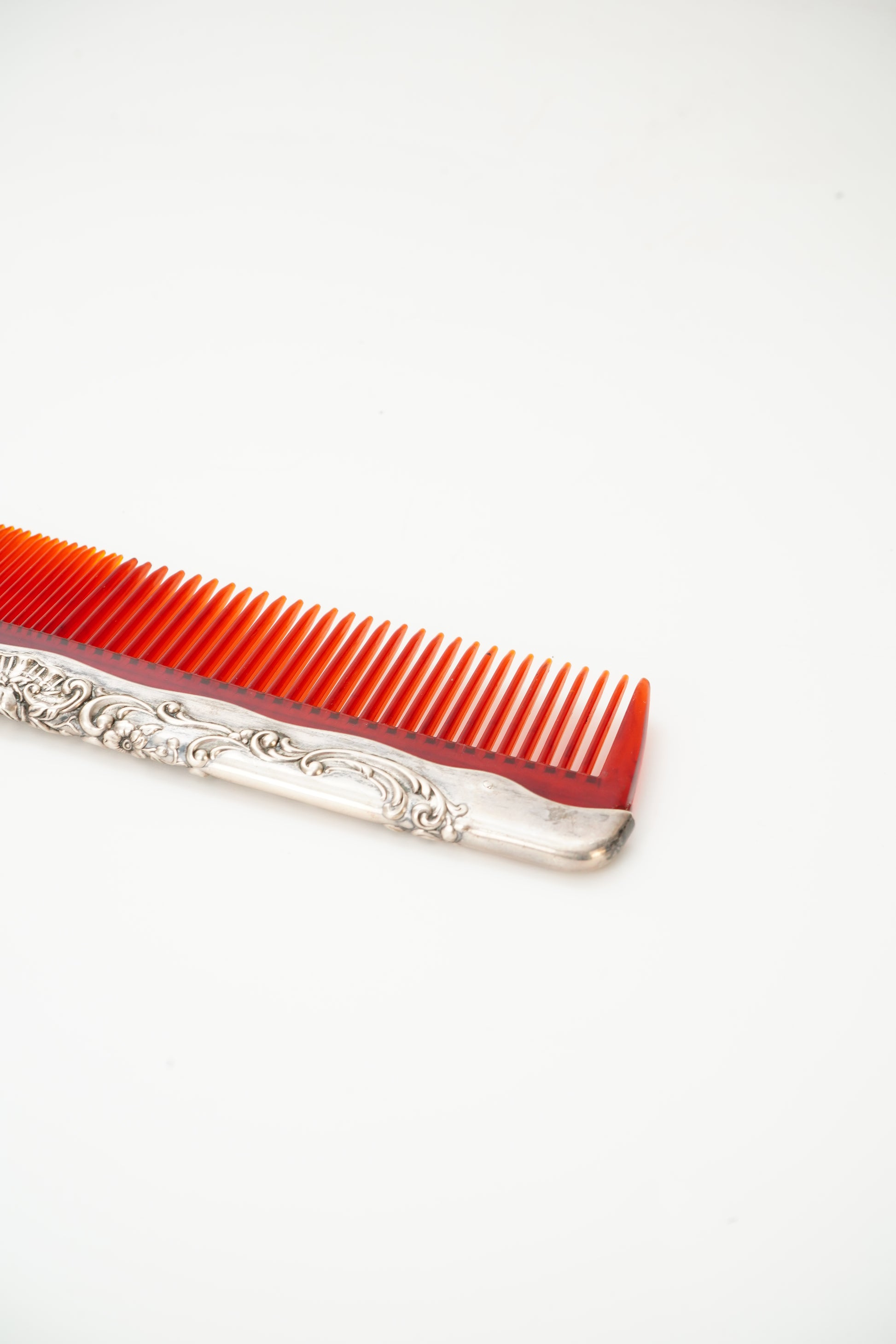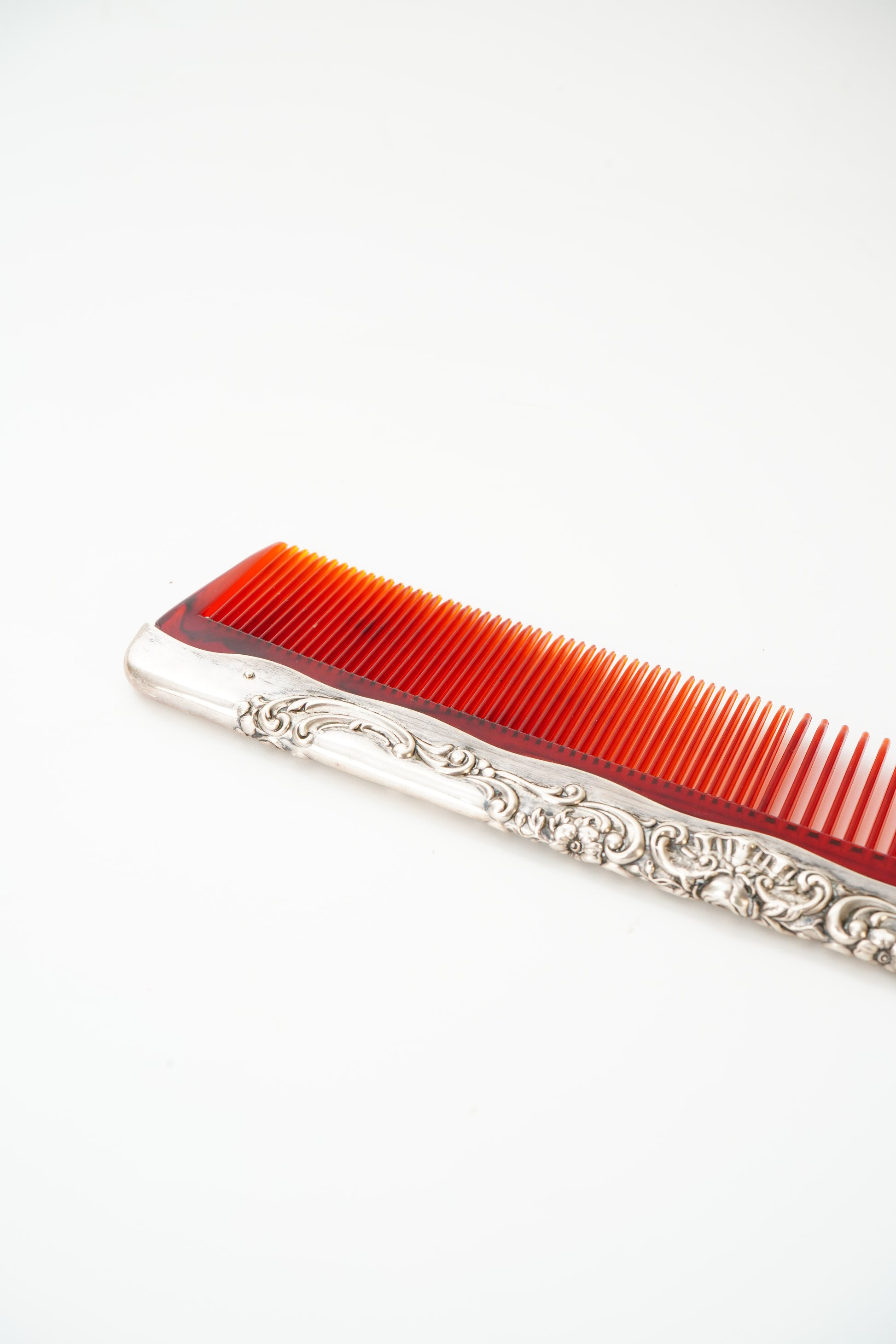 Light patina and minor surface marks to the silver mount, especially in the decorative relief. Comb teeth appear intact with minor wear. Please review photos closely for small scratches and signs of handling typical of an antique grooming accessory.