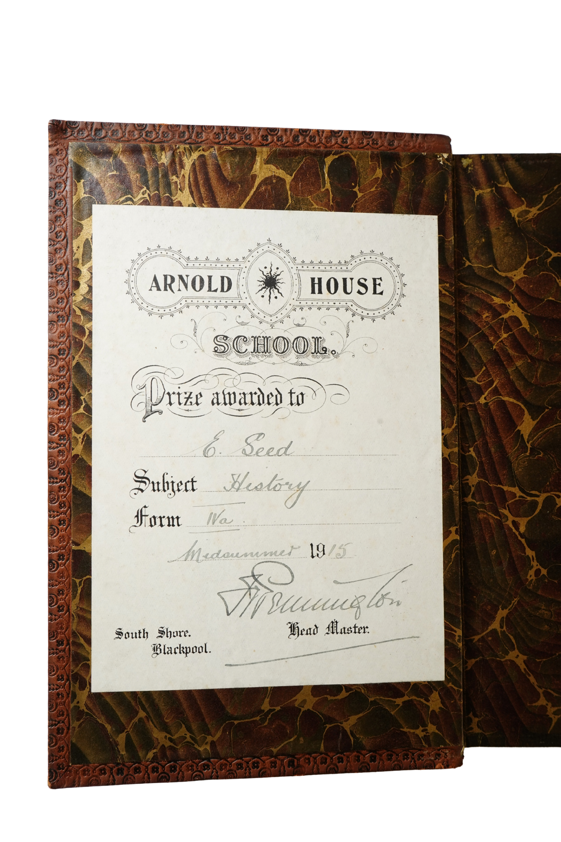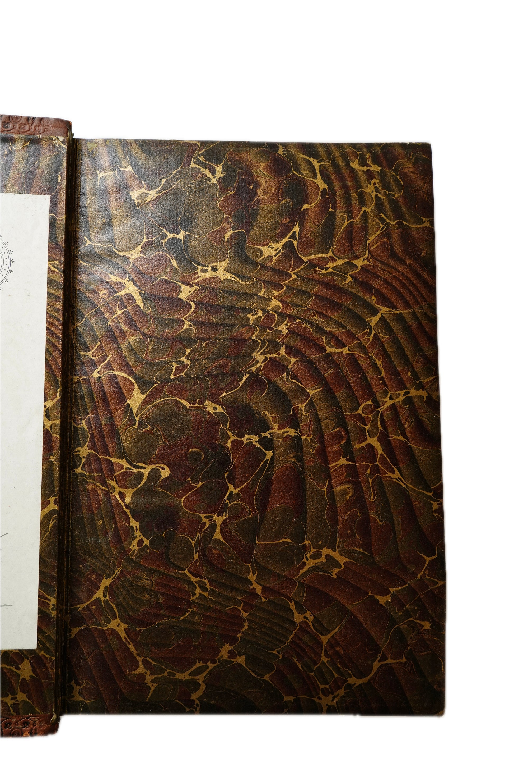 - Special Features: Gilt-stamped armorial crest on front board with motto “Honor Virtutis Praemium,” decorative gilt border to boards, marbled endpapers, marbled text block edges
