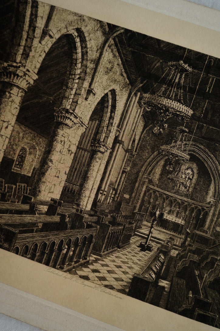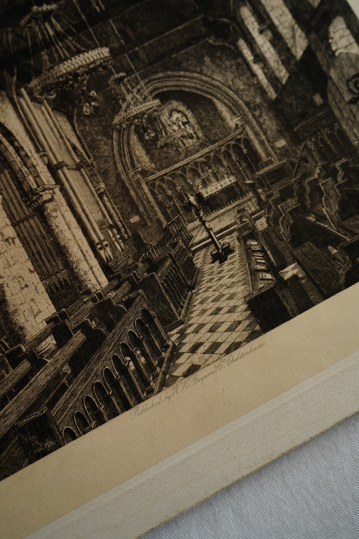 A fine late 19th Century etching of an English chapel interior. The artist shows her skilled hand in the striking shadow and light and attention to architectural detail. The artist has initialed in plate to the lower left and the publisher's details are inscribed along the lower edge. On chine colle laid to board.