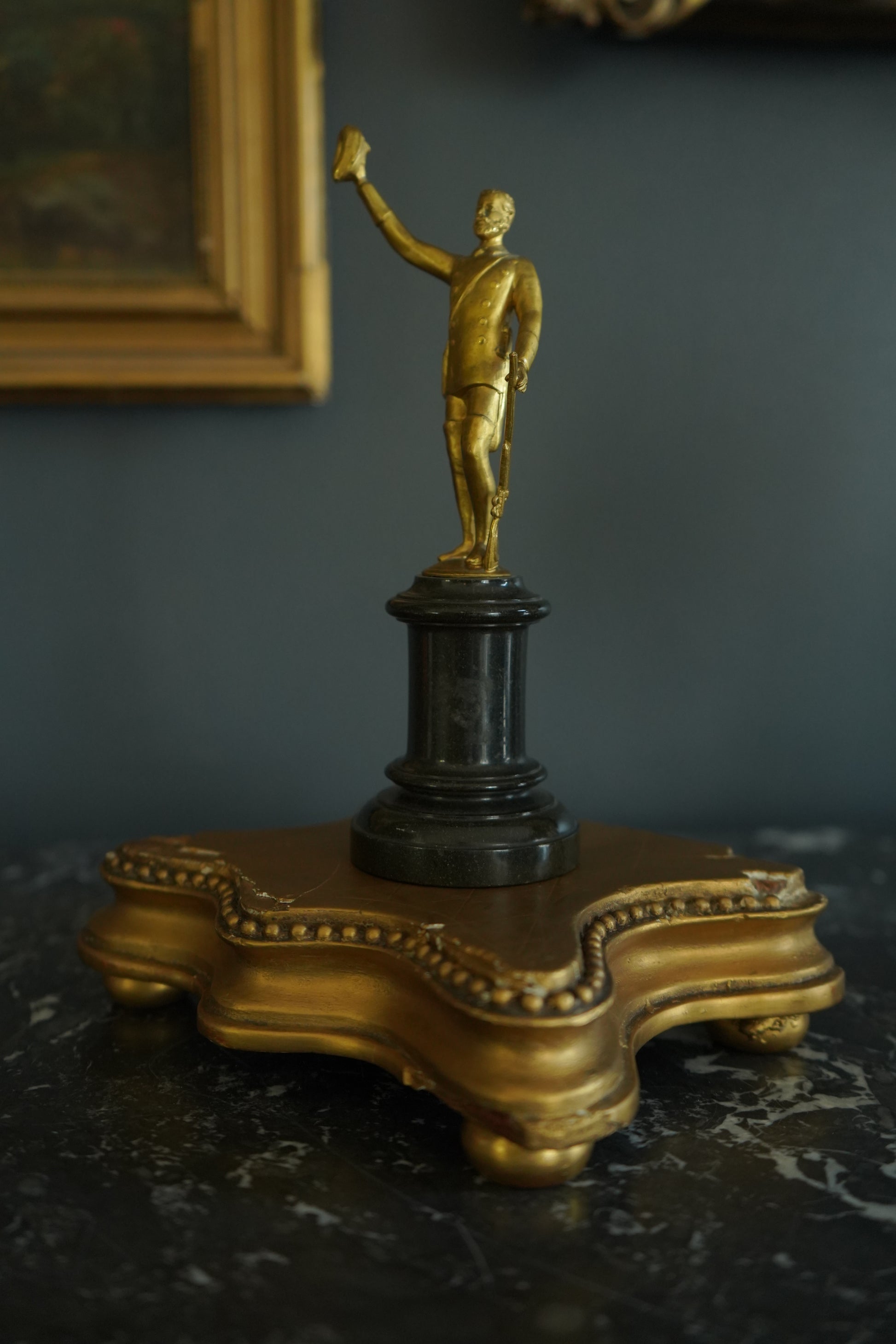 Overall very good vintage condition with character consistent with gentle display over many decades. The gilt finish is even and bright across the figure with light rubbing to high points including the hat brim, cuff edges and sword hilt where the gilding has softly mellowed to a subtle patina. The bronze is solidly mounted to the marble base and there is no looseness at the join. The black marble base is intact with no chips or structural cracks; close examination of your photos shows two faint hairline surface lines on the back rim and very minor scuffing around the underside edge consistent with normal handling and placement. There is no visible repair or restoration and no significant corrosion.