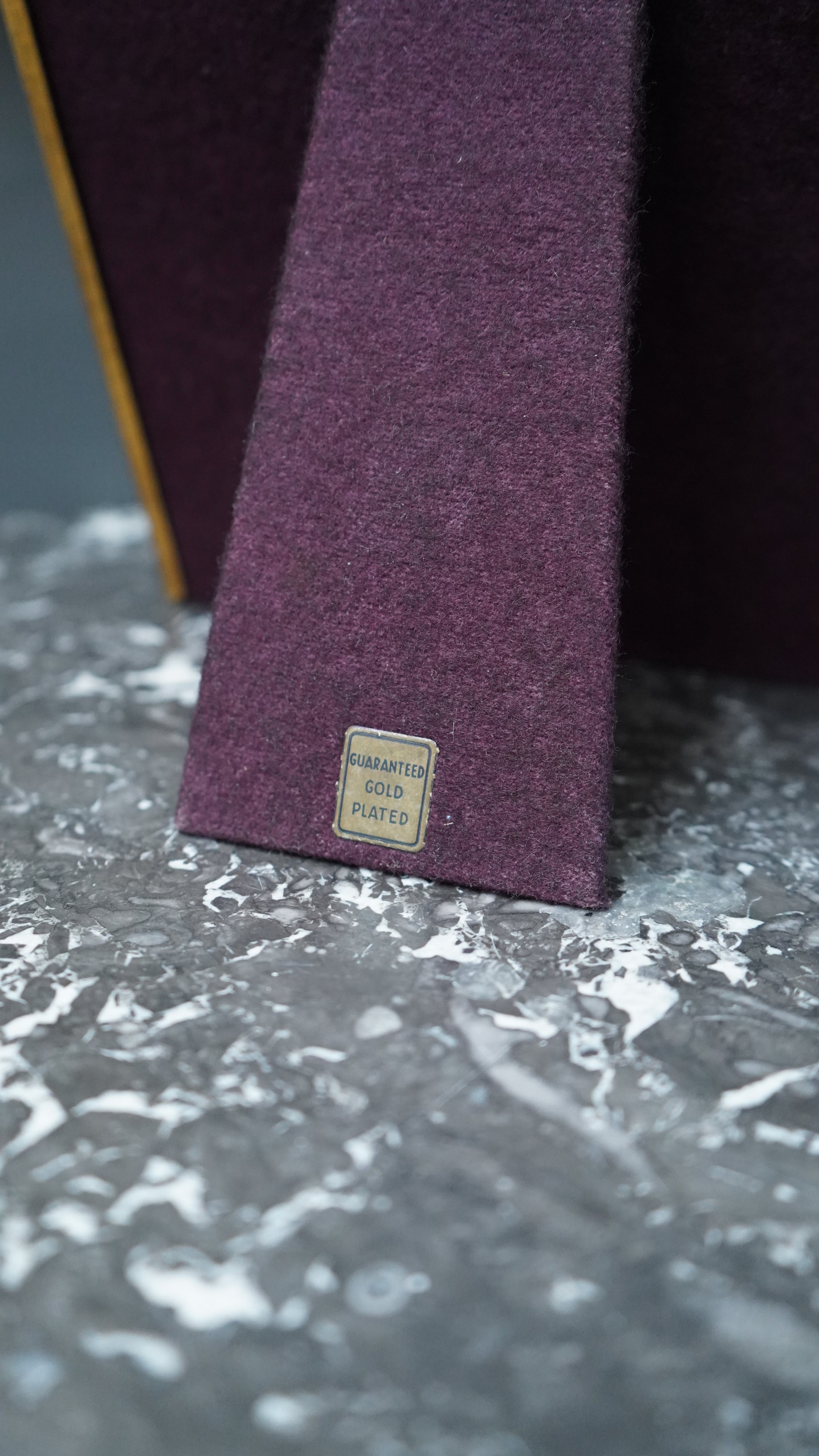 The frame is in good vintage condition with light surface wear consistent with age. The gold plating retains a warm, even tone with minor natural patina. The glass front is intact. The felt backing shows slight wear but remains sturdy and functional, with the original Guaranteed Gold Plated label still present. The easel stand and wall hanging attachments are secure and usable.