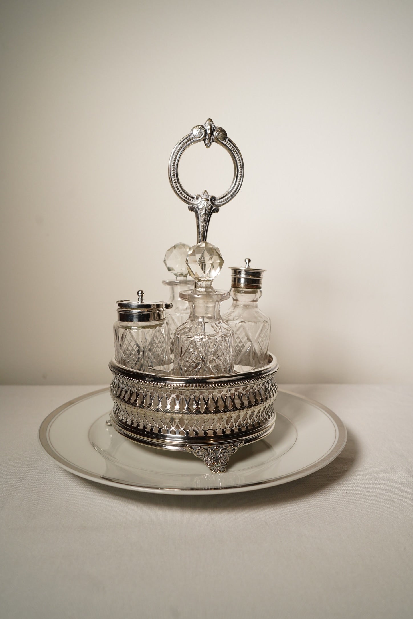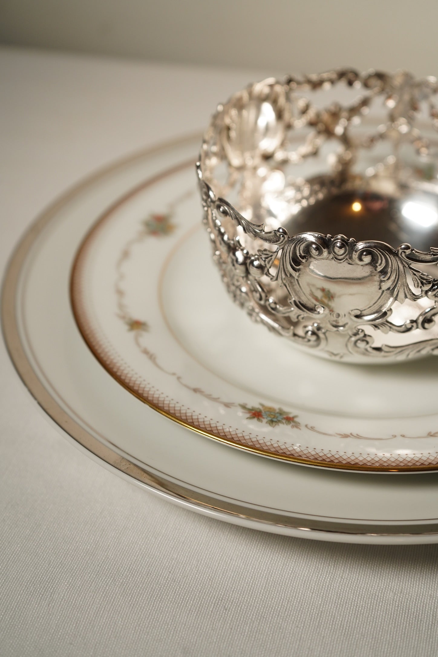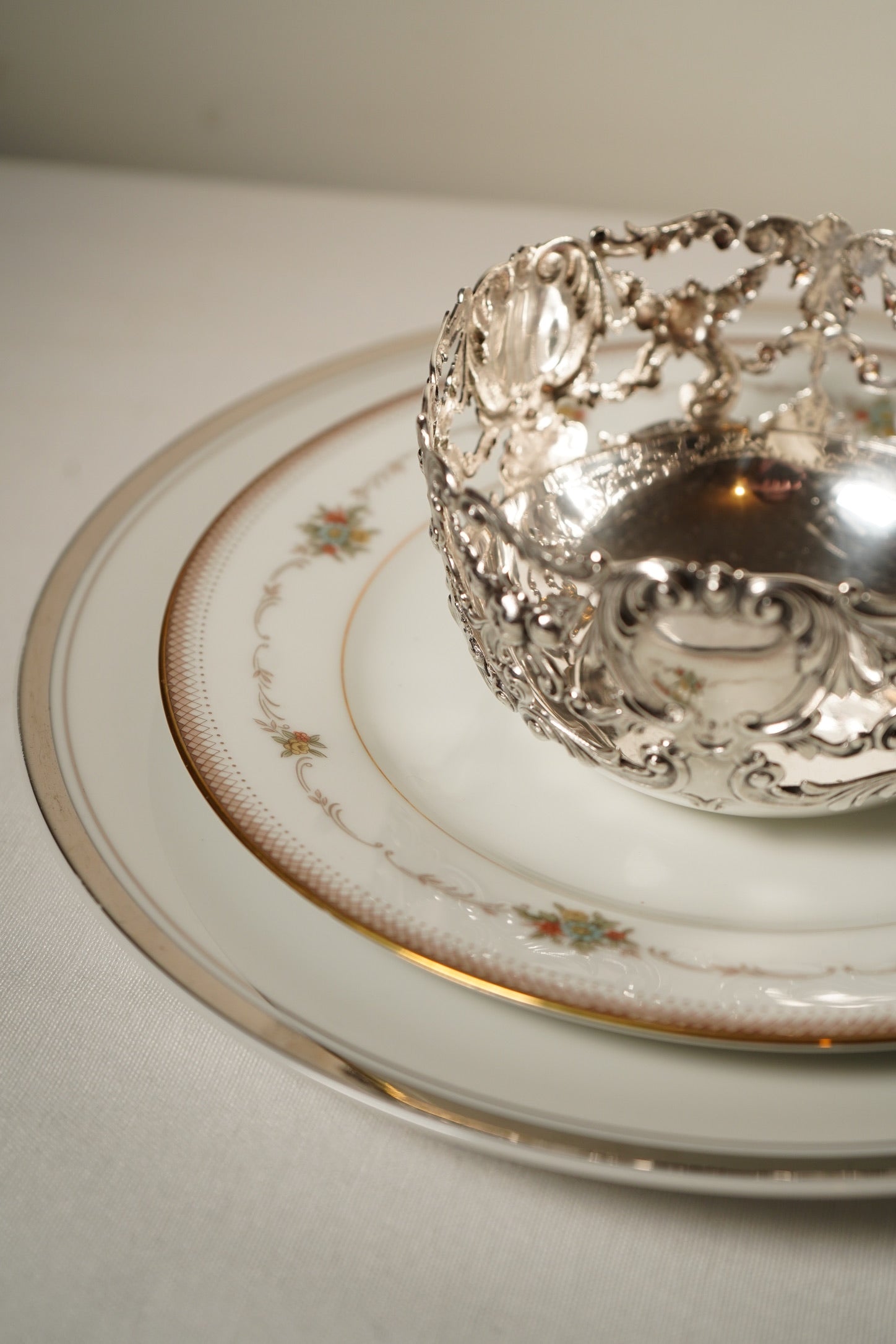 Plates are in good vintage condition with light signs of age including minor utensil marks and subtle surface wear normal for porcelain of this period. Silver rims remain intact with gentle wear from use. No chips or cracks observed. Backstamps are clear and legible.