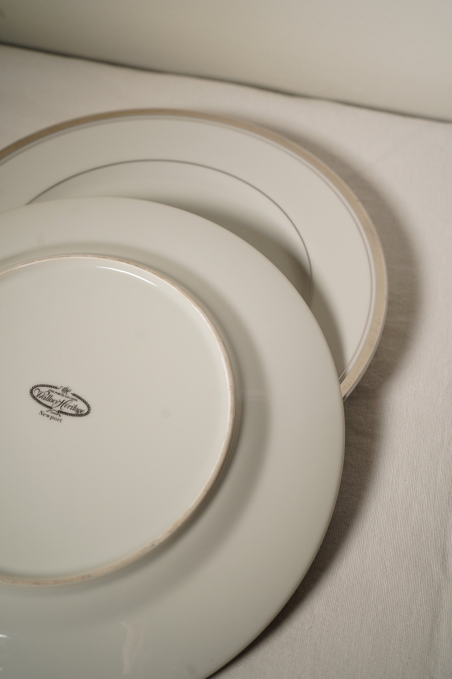A timeless classic for an elevated table, this set of 2 Lenox Wallace Heritage Newport dinner plates features a crisp white porcelain body finished with a refined silver rim. The clean double banding and minimalist silhouette reflect mid century American design trends that valued understated luxury and hotel level refinement. Crafted in Japan for Lenox’s Wallace Heritage line, the Newport pattern became popular for its quiet sophistication and compatibility with both formal and modern table settings. These plates pair beautifully with sterling silver flatware, monochromatic linens, or a layered Ralph Lauren inspired tablescape. Whether you use them for special occasions or for daily elevated dining, they bring an elegant, timeless presence to any collection.
