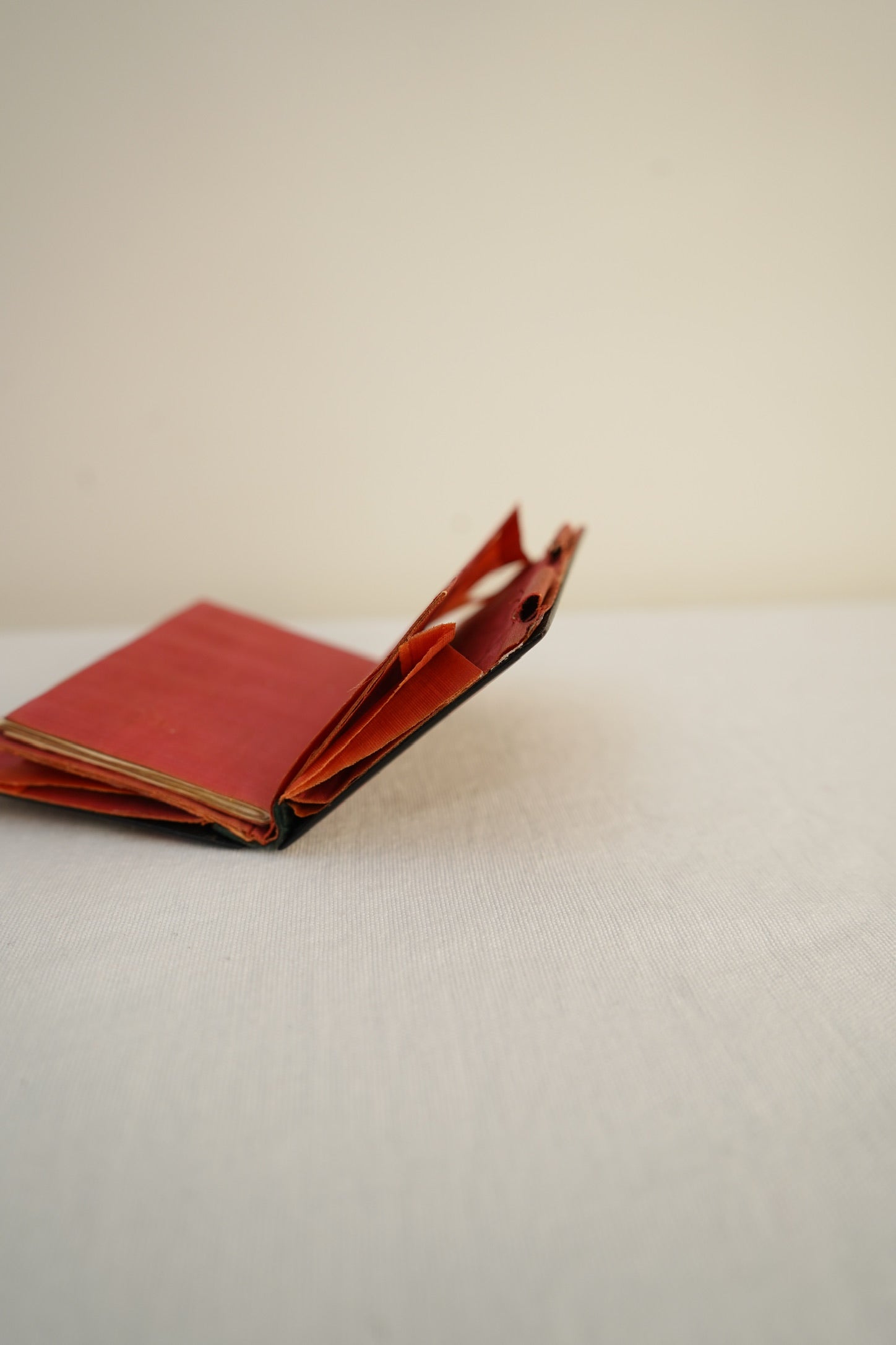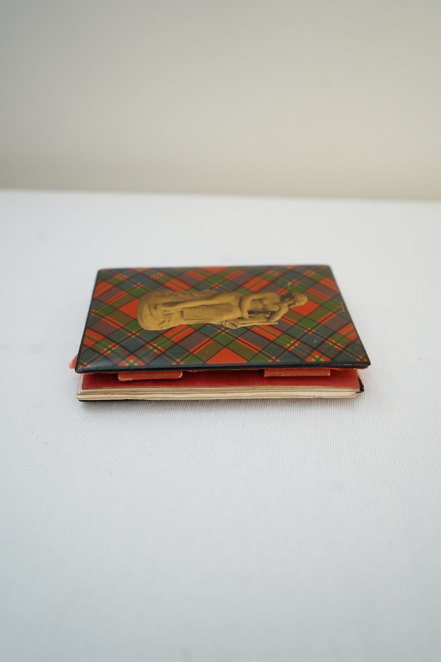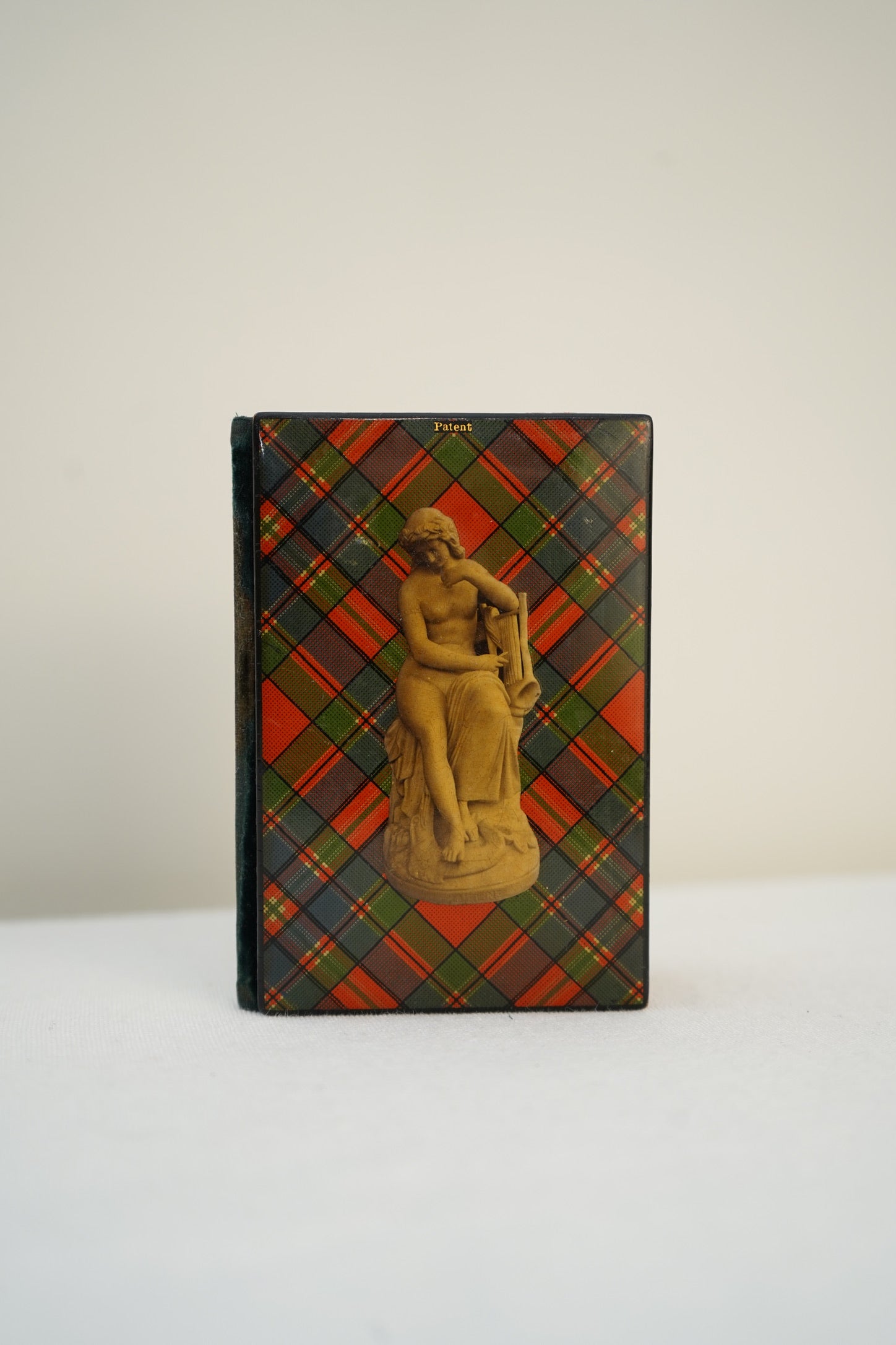 The exterior features a classic tartan pattern with a neoclassical figure to the cover, reflecting Victorian ideals of learning and memory. Inside, the original red silk-lined compartments and paper pages remain, offering a beautiful glimpse into how these objects were constructed and used. The survival of the silk interior and paper elements is especially notable given their fragility.