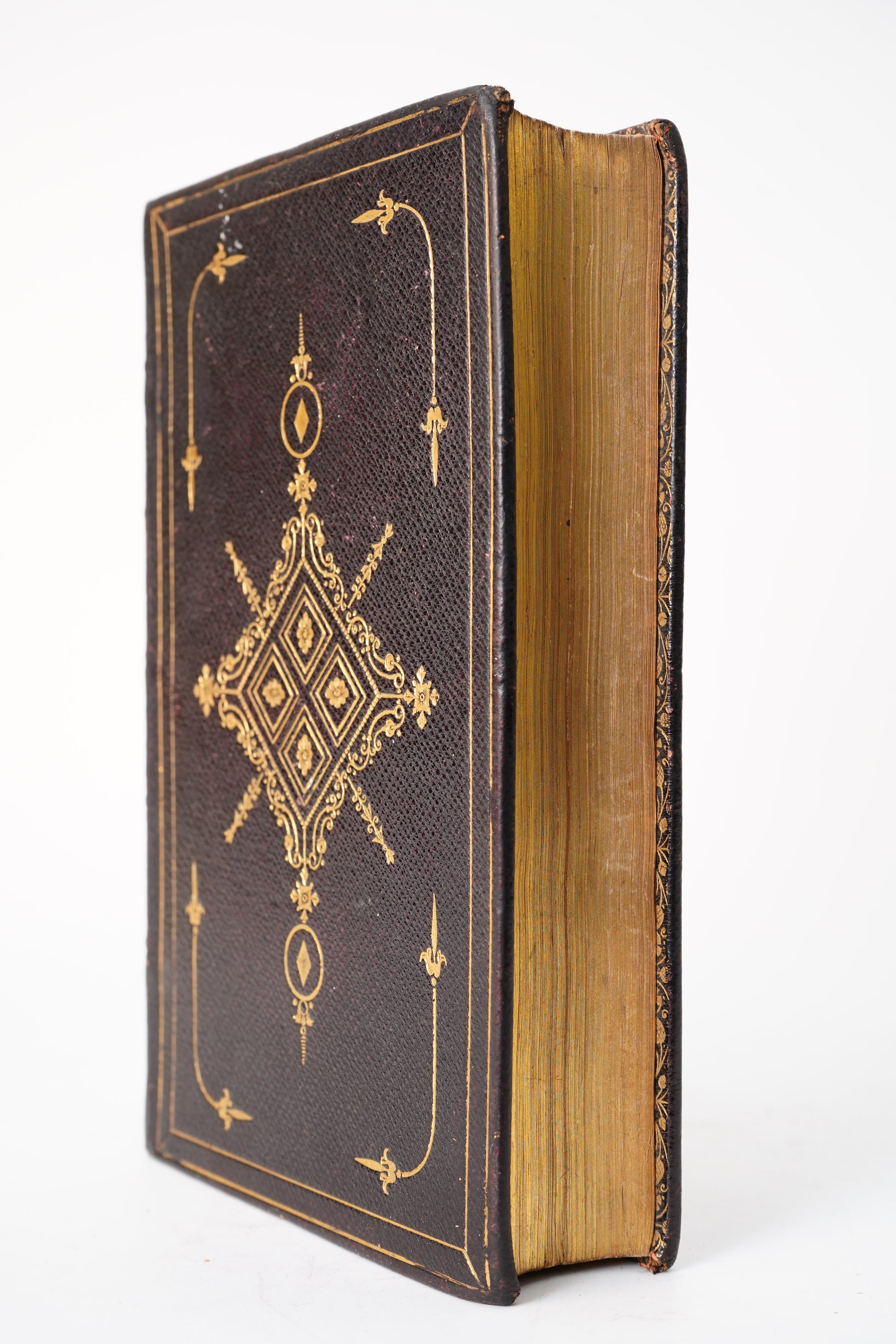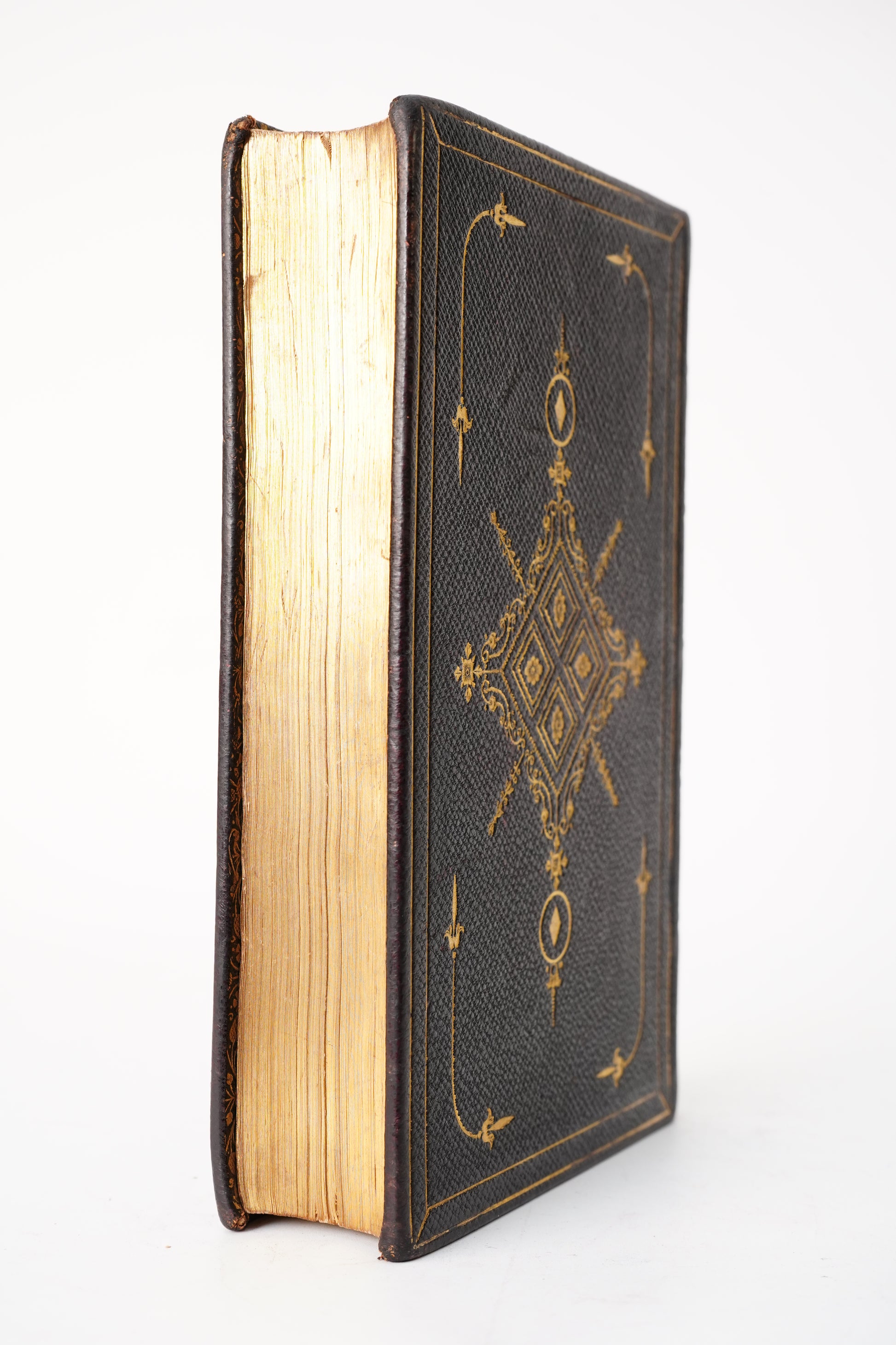 Full black pebbled leather binding with elaborate gilt decoration to both boards and spine, raised bands, and gilt edges. The binding remains attractive and structurally sound, with light general rubbing and handling wear consistent with age. Gilt remains bright and crisp overall. Interior is complete as photographed, with engraved plates present. There is scattered foxing throughout, heaviest on some illustrated leaves and preliminary pages, along with light age toning. A faint pencil ownership inscription or signature appears on the front endpaper. A solid and handsome mid nineteenth century copy that presents very well.