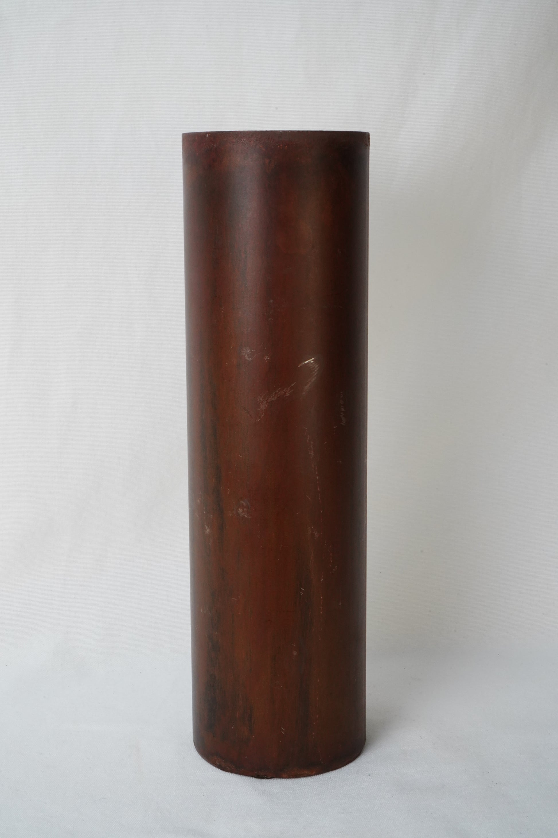 This striking mid-century modern sculptural metal vase features a minimalist cylindrical form with a beautifully weathered painted finish, reminiscent of aged copper or corten steel. Likely produced in Japan or Italy during the 1950s–1970s, the piece embodies the Brutalist influence with its industrial material and form, while maintaining the clean elegance of modernist design.