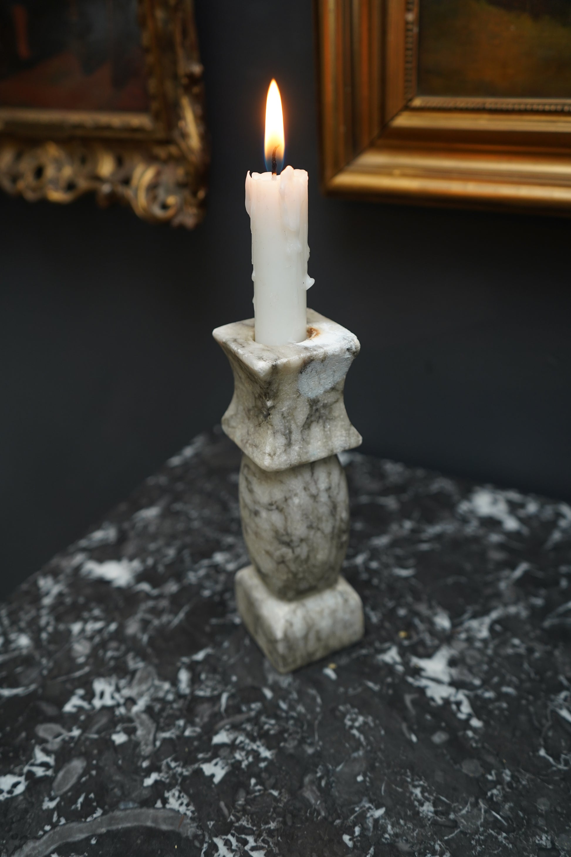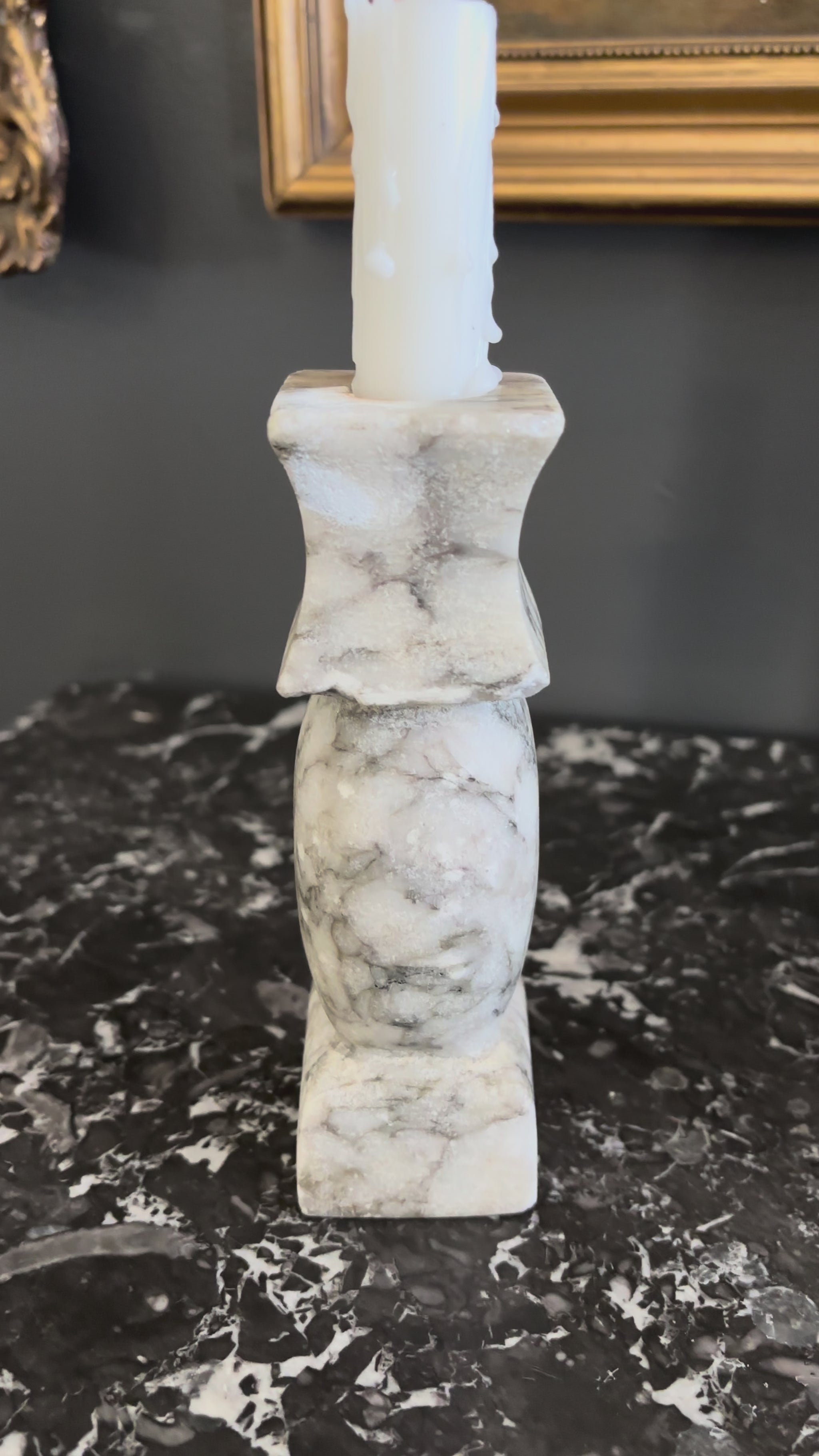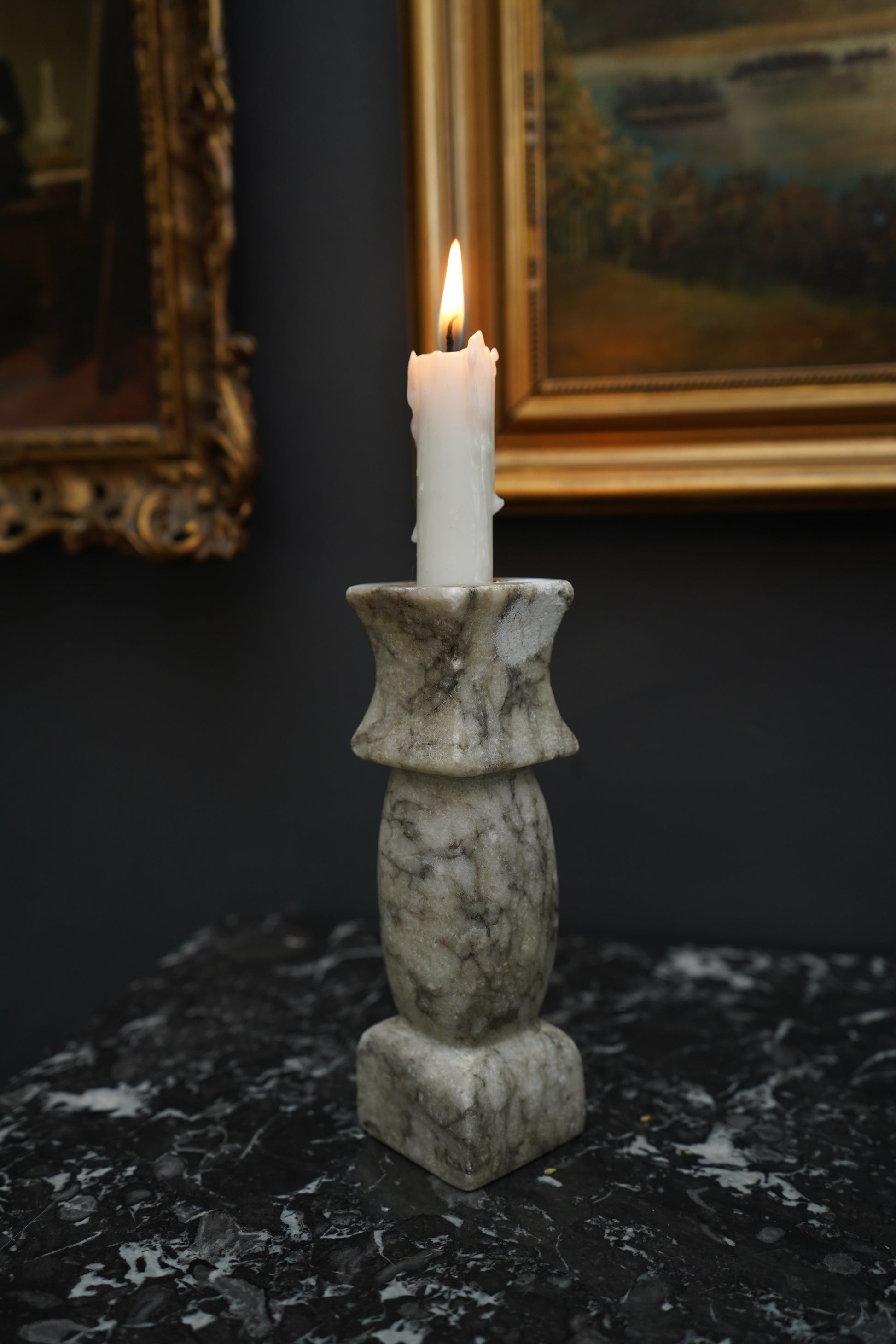 This vintage candlestick is hand-carved from solid Carrara marble. This design features a squared base, a baluster-shaped stem, and a flared top made to hold a taper candle securely.