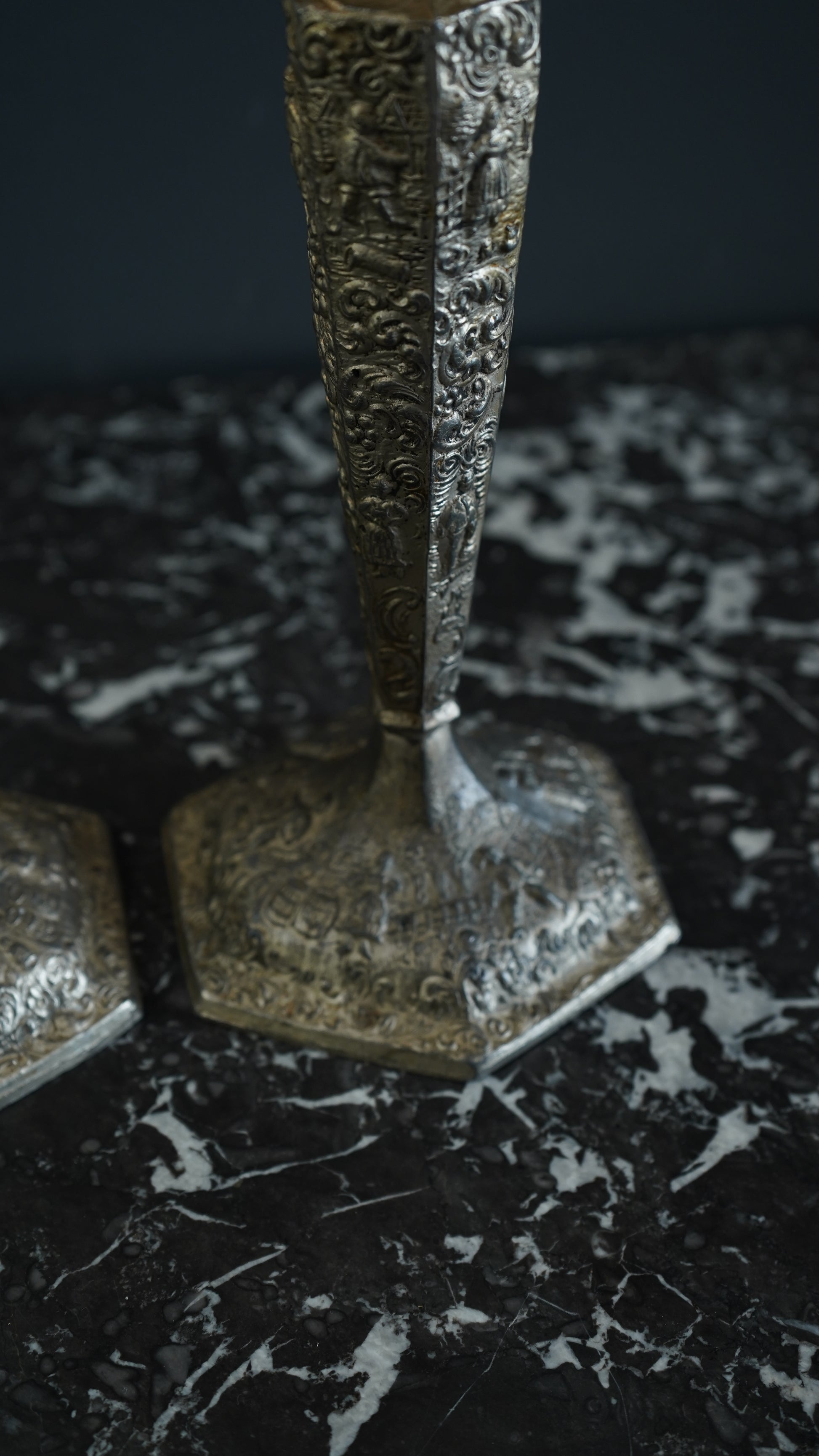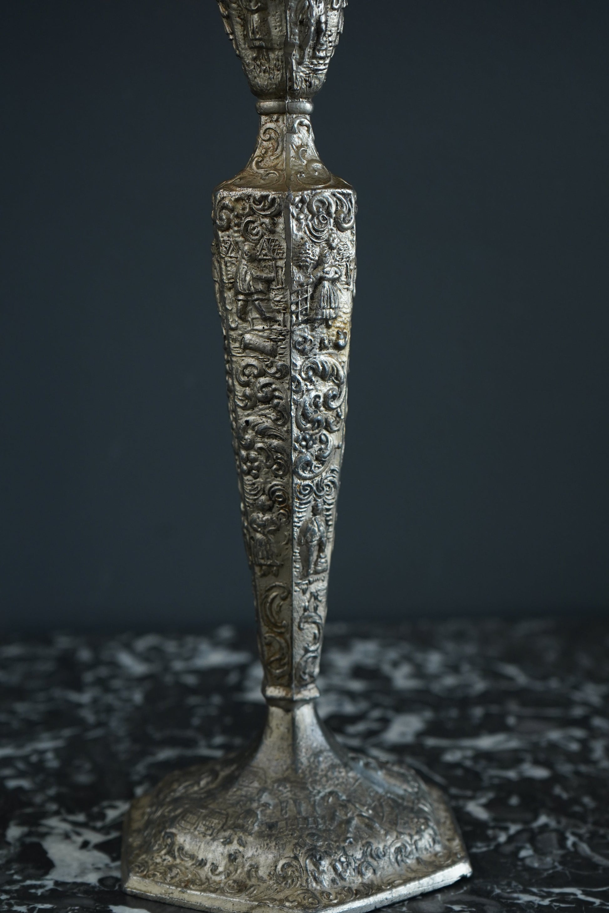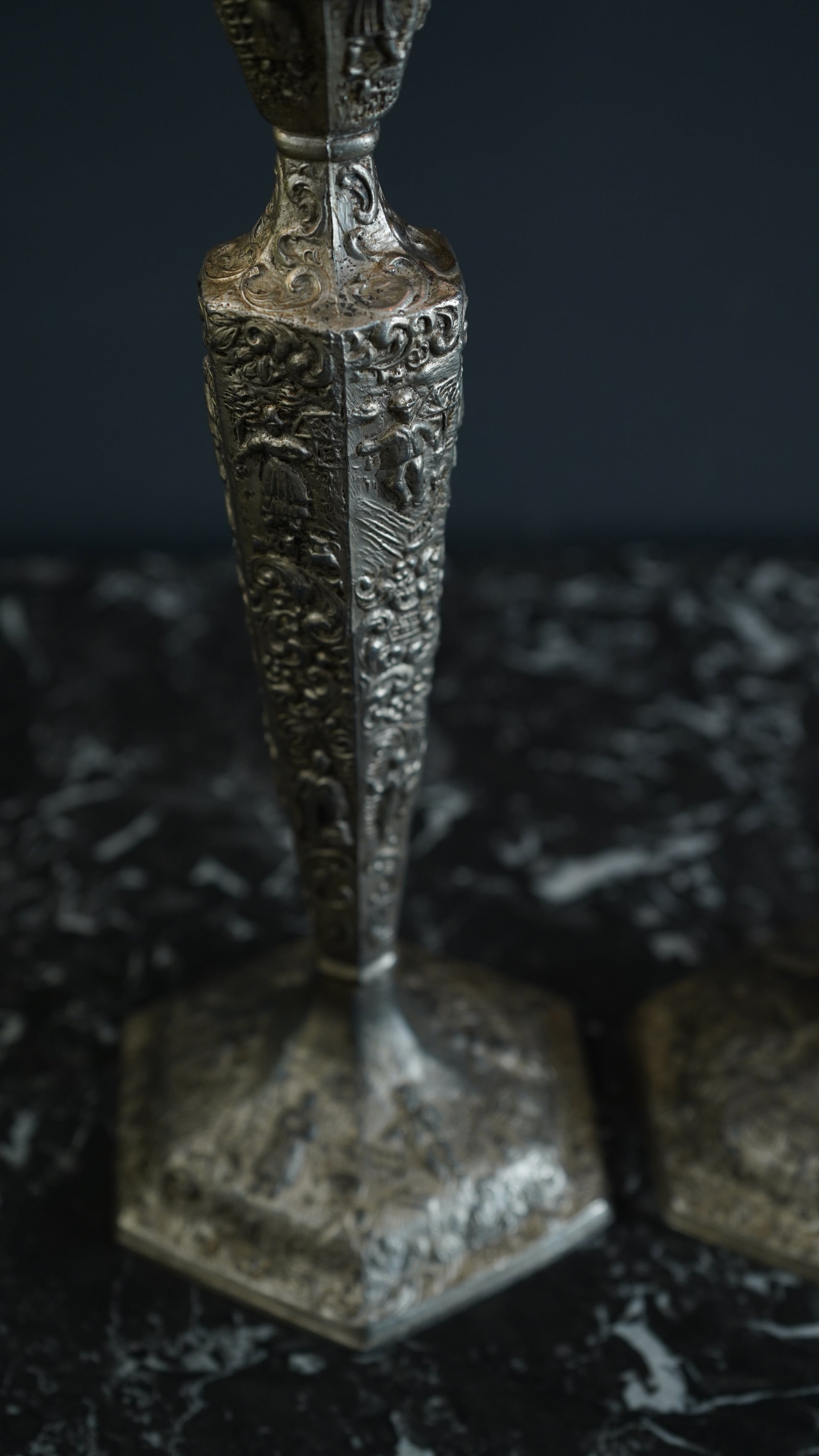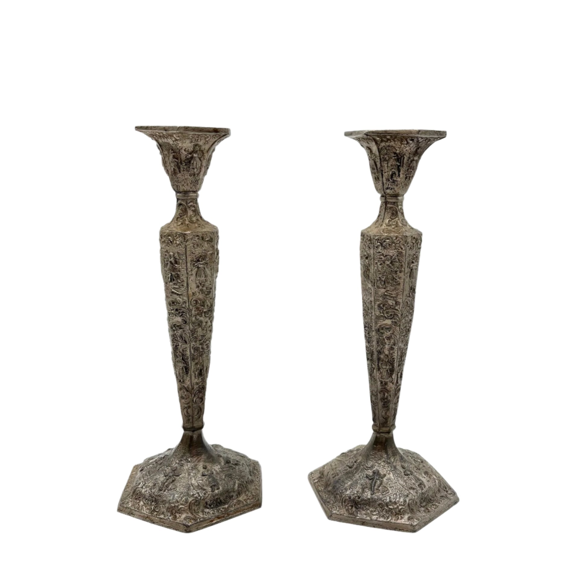 Pair of Weidlich Brothers Dutch Windmill Repoussee Silver Plated Candleholders, Pair of Vintage Silver-Plated Candlestick Holders