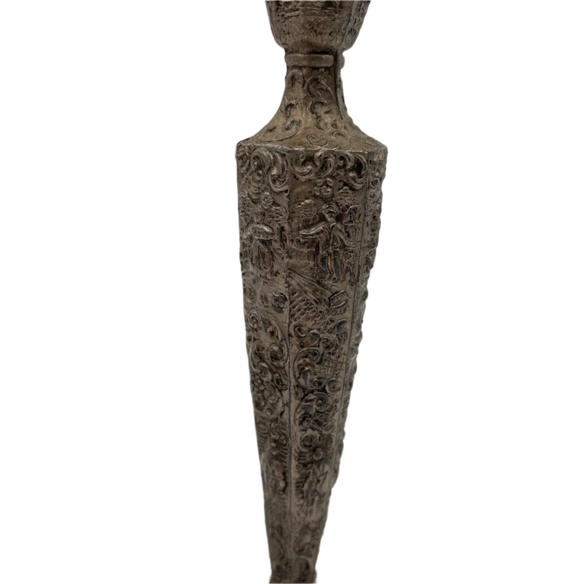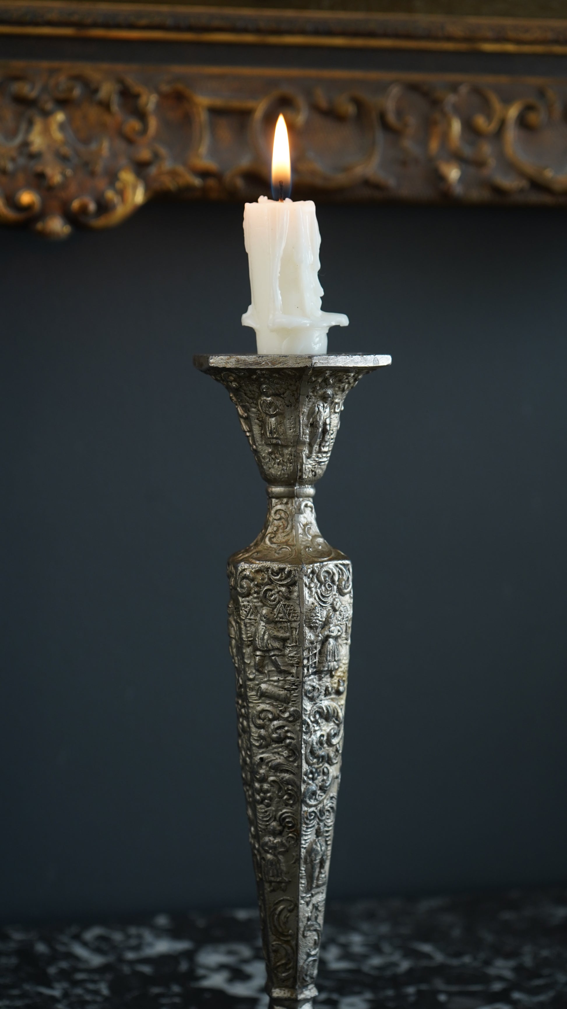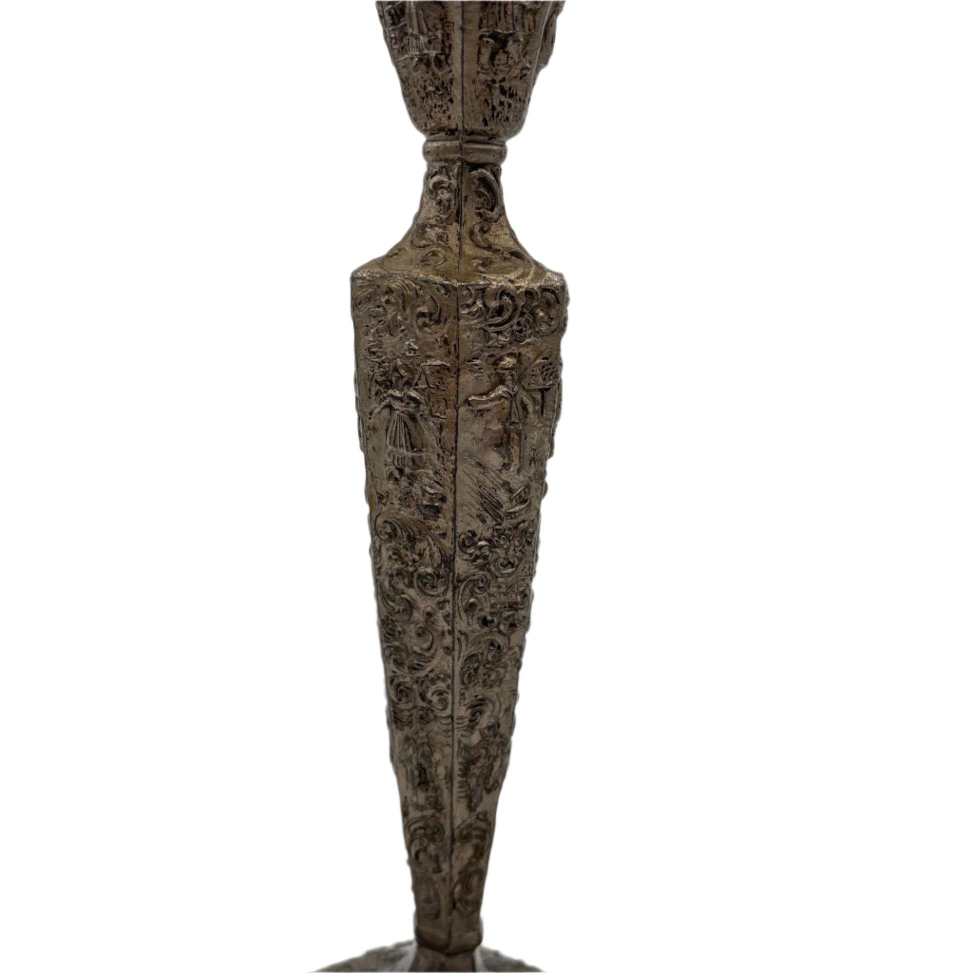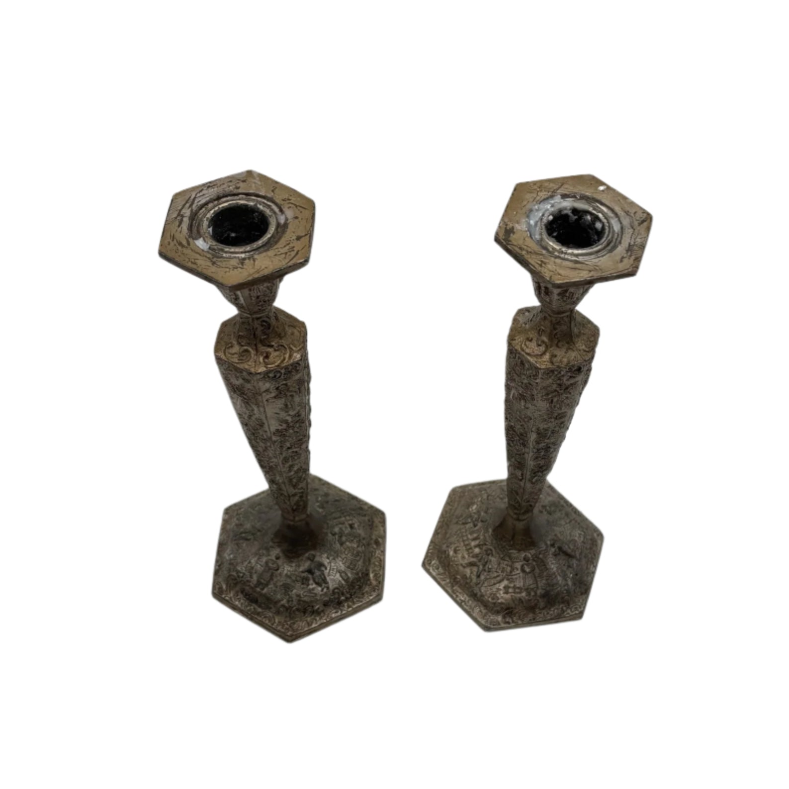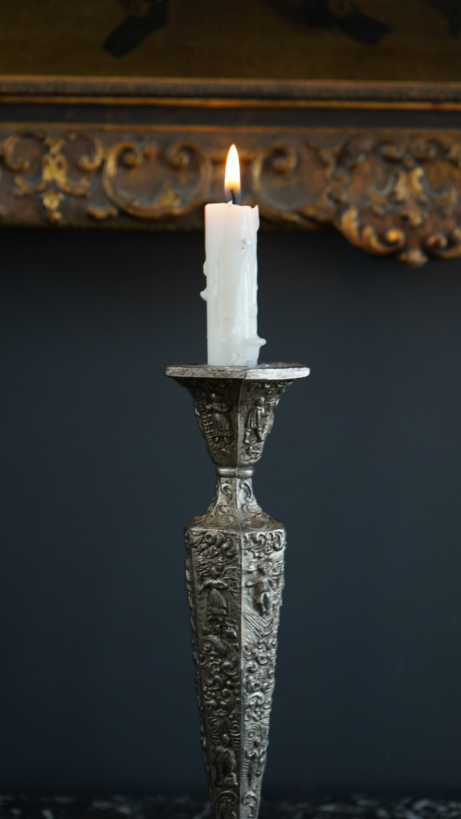 Pair of Weidlich Brothers Dutch Windmill Repoussee Silver Plated Candleholders, Pair of Vintage Silver-Plated Candlestick Holders