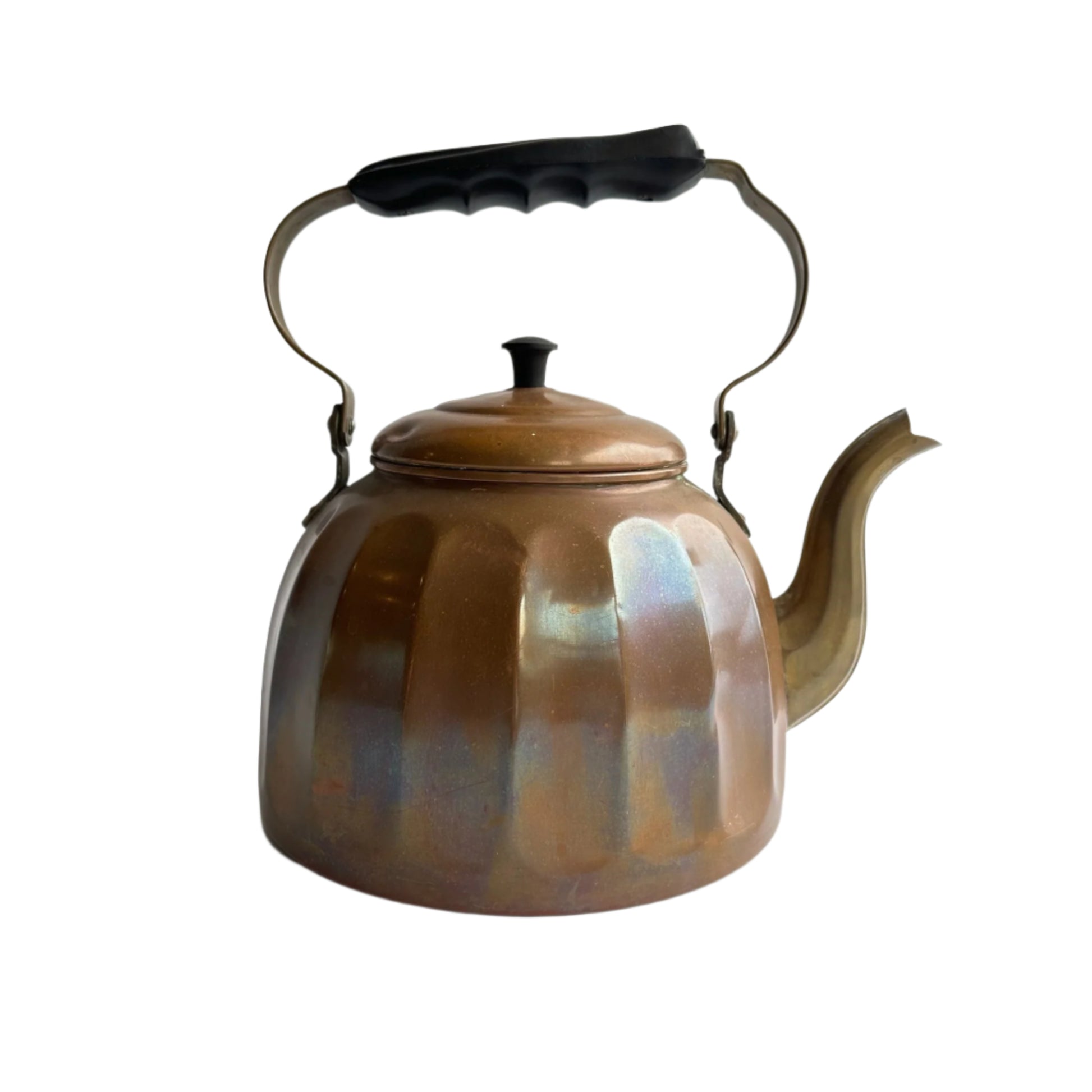 Overall, this mid-century copper kettle is in good condition, with a warm, iridescent patina and light surface wear, intact Bakelite handle and brass spout, and would only need a fresh interior re-tinning to restore full functionality.