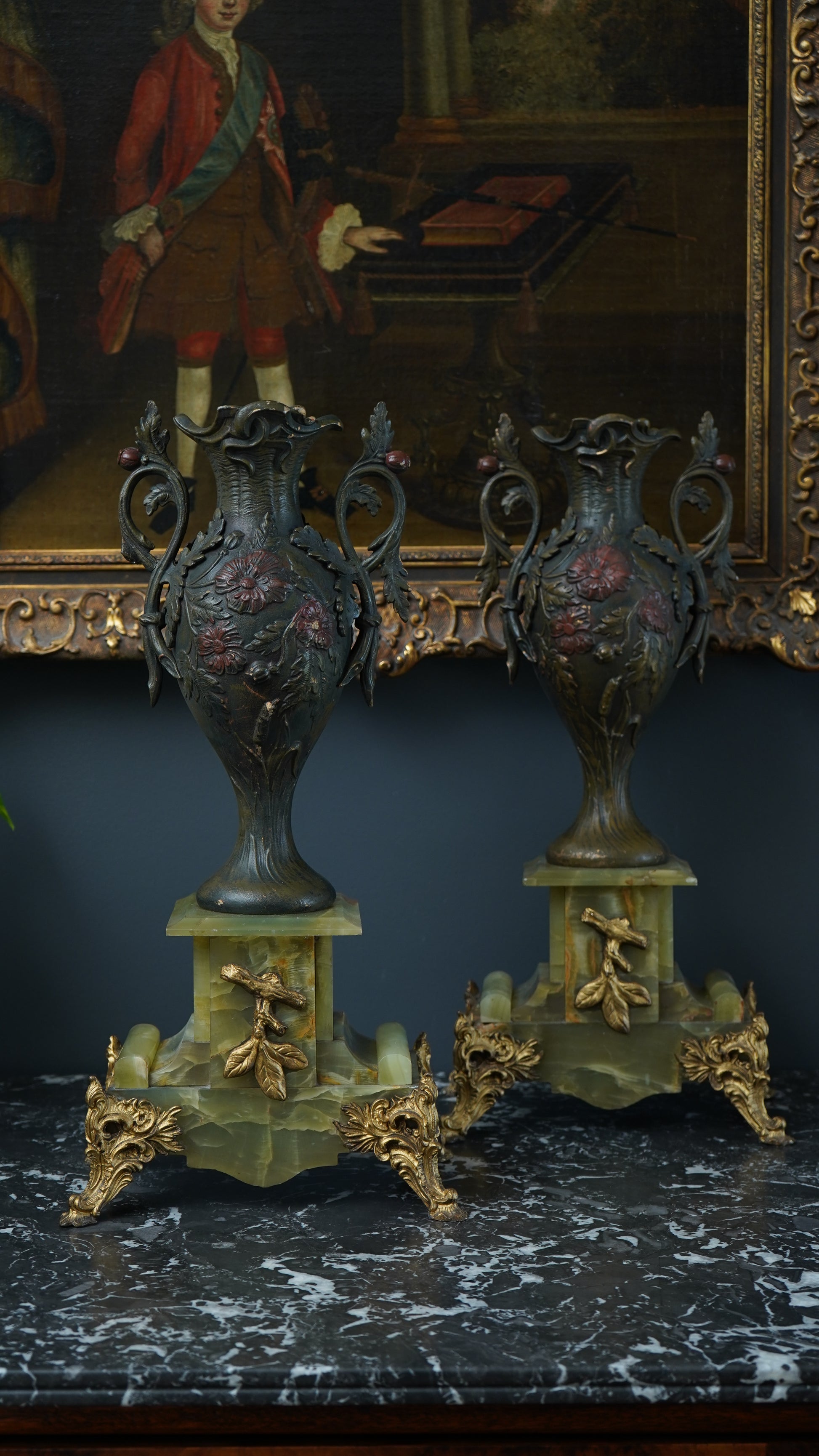 This pair of late 19th-century French urns exemplifies the Neoclassical style popular during that era. Each urn features a cast spelter body adorned with intricate floral reliefs and elegant handles, all resting upon a base of rich green onyx. The gilt brass legs and decorative details enhance their opulent appearance, reflecting the luxurious materials favored in French decorative arts of the time.