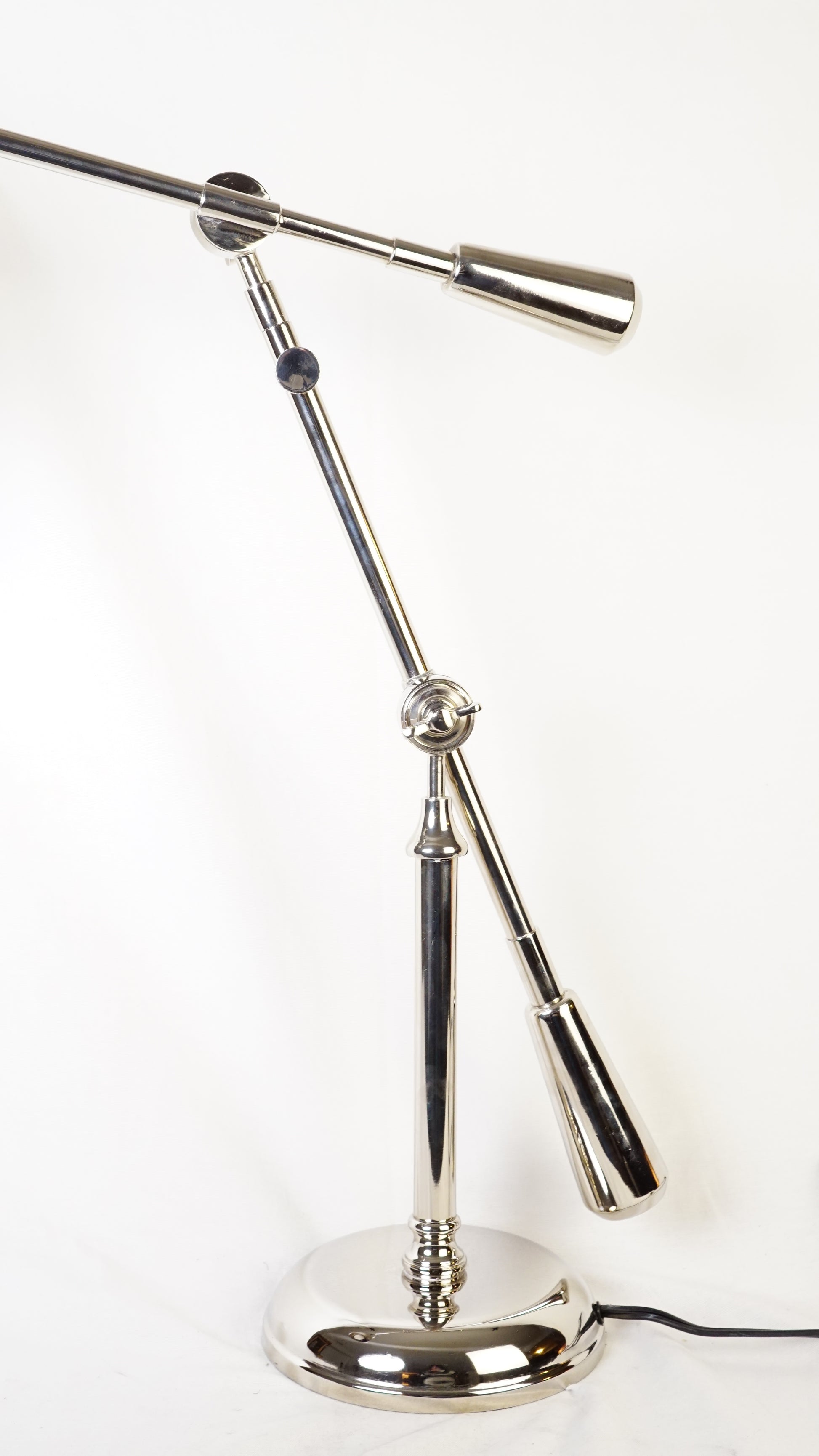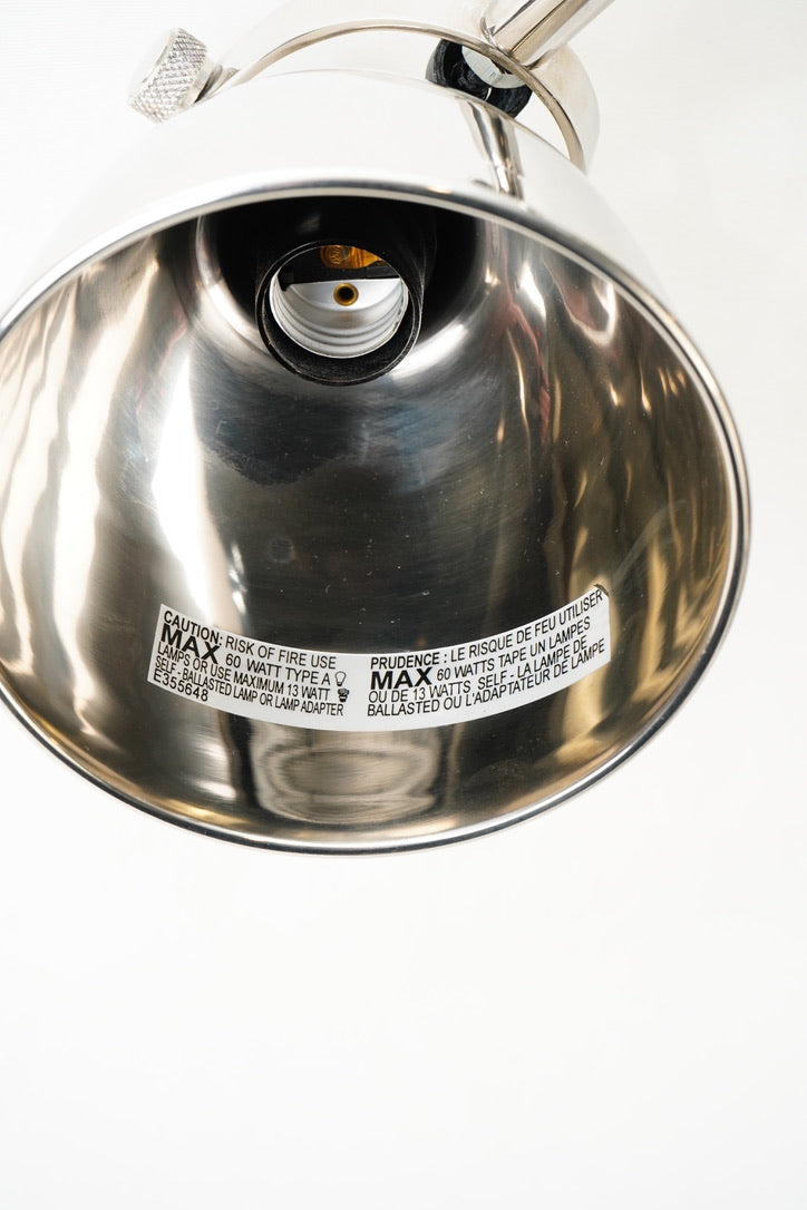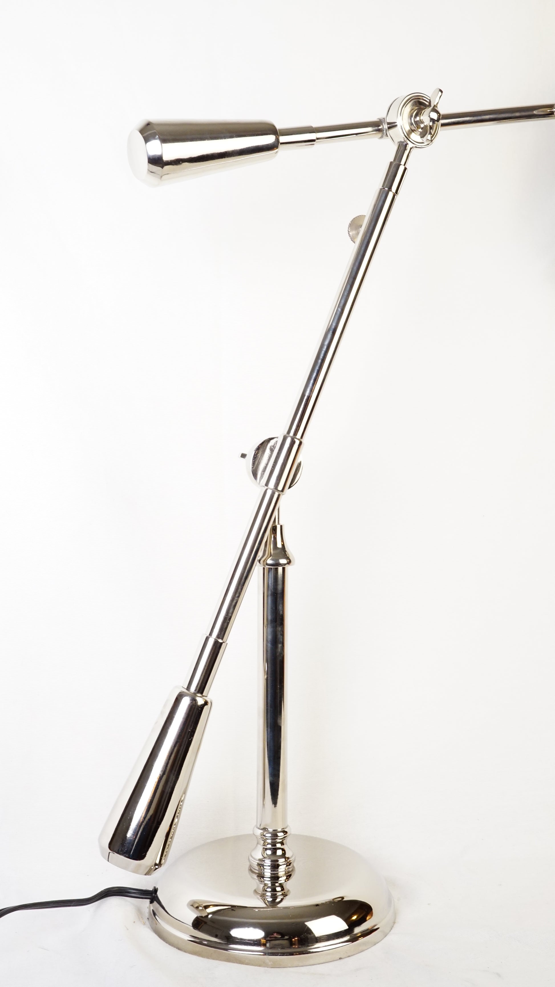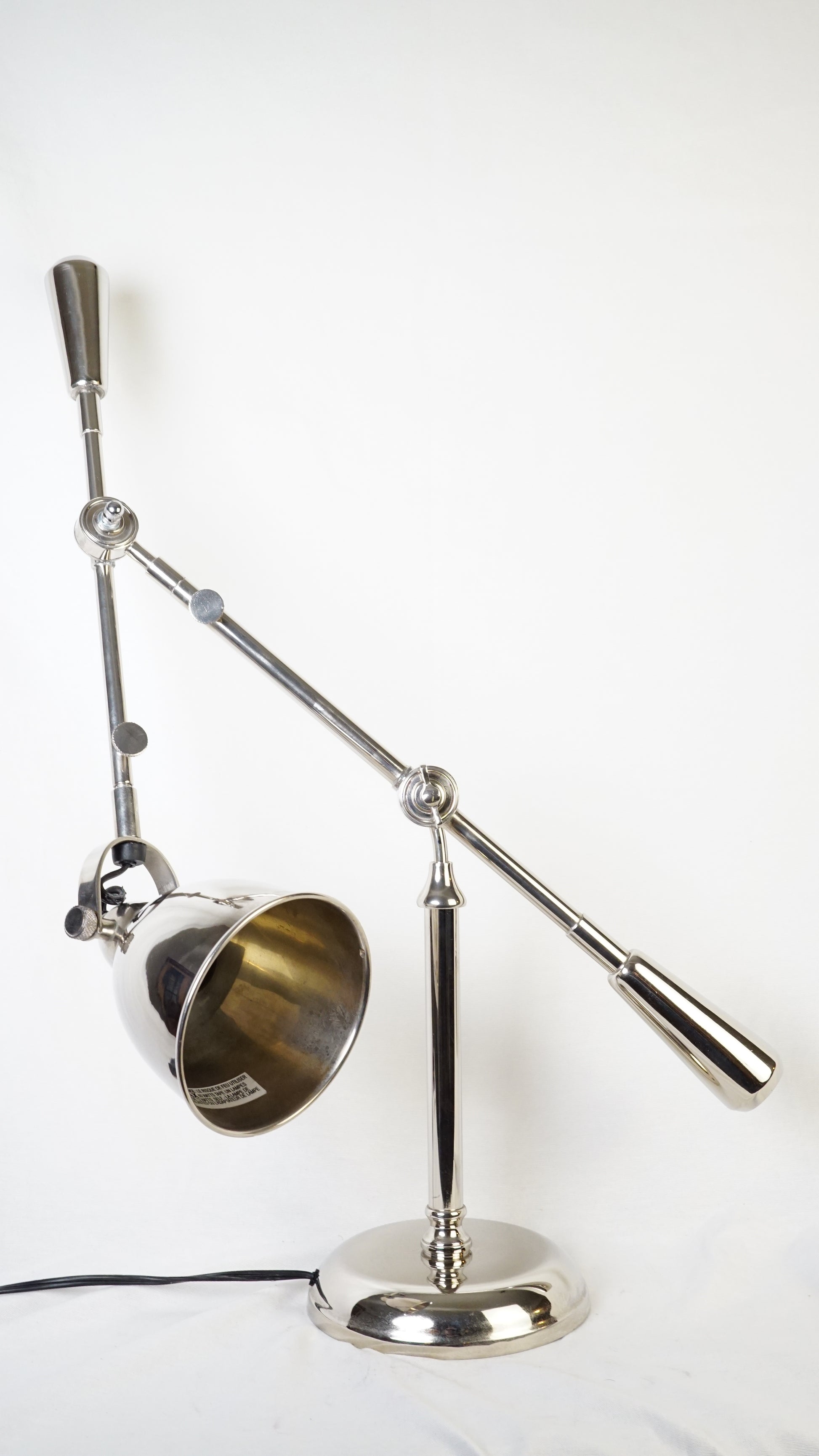 A polished chrome articulating desk lamp with a crisp dome shade and a sculptural, Ralph Lauren inspired silhouette that gives you that tailored library look without trying too hard. The heavy, high-quality build makes it feel substantial on a desk or console, and the adjustable arm lets you dial in focused light for reading, writing, or highlighting a vignette in any space.