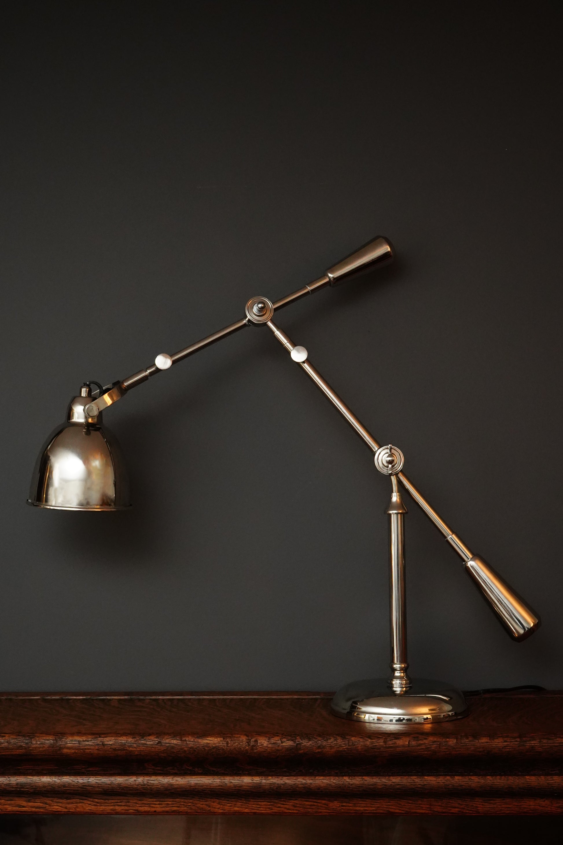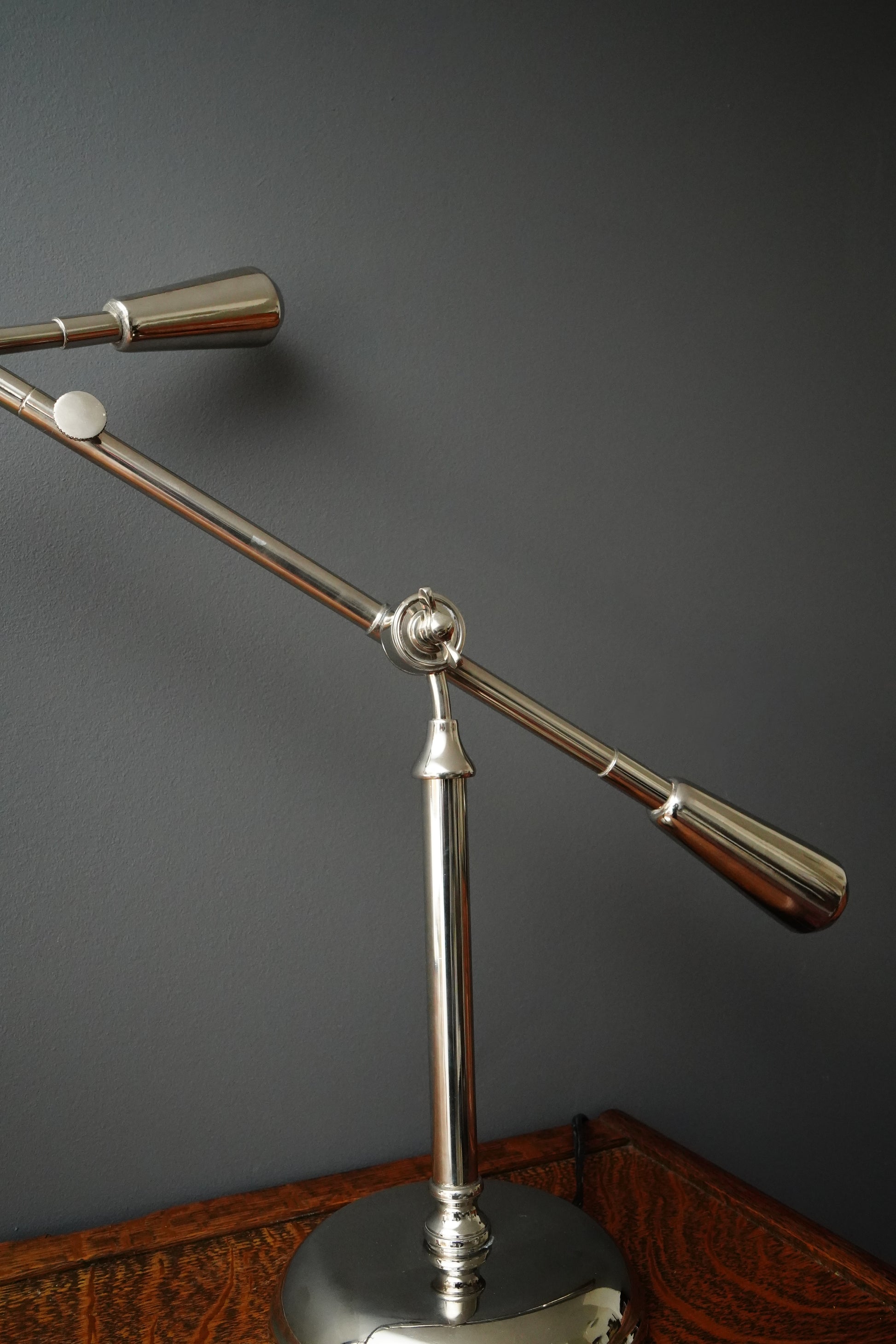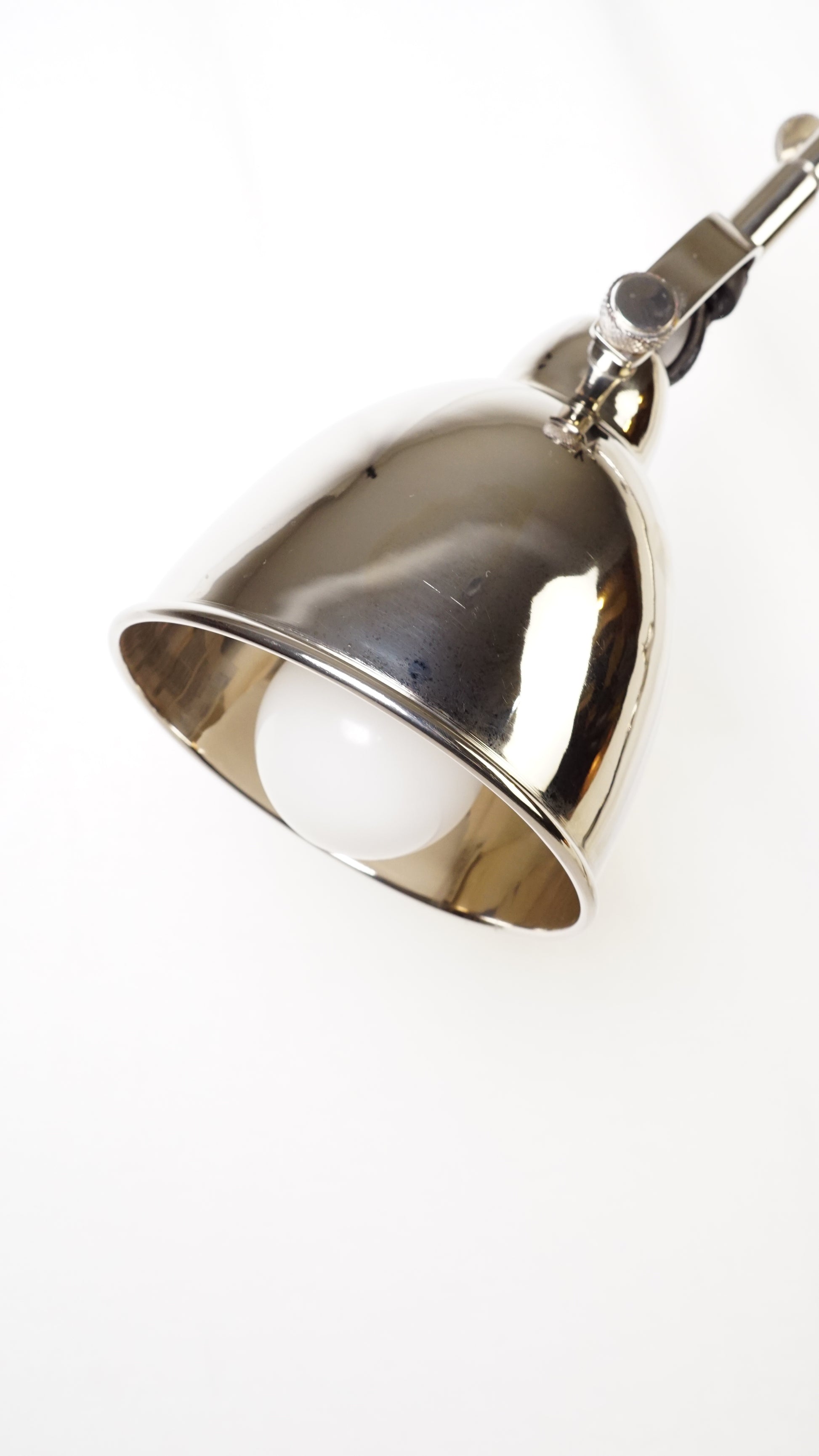 A polished chrome articulating desk lamp with a crisp dome shade and a sculptural, Ralph Lauren inspired silhouette that gives you that tailored library look without trying too hard. The heavy, high-quality build makes it feel substantial on a desk or console, and the adjustable arm lets you dial in focused light for reading, writing, or highlighting a vignette in any space.