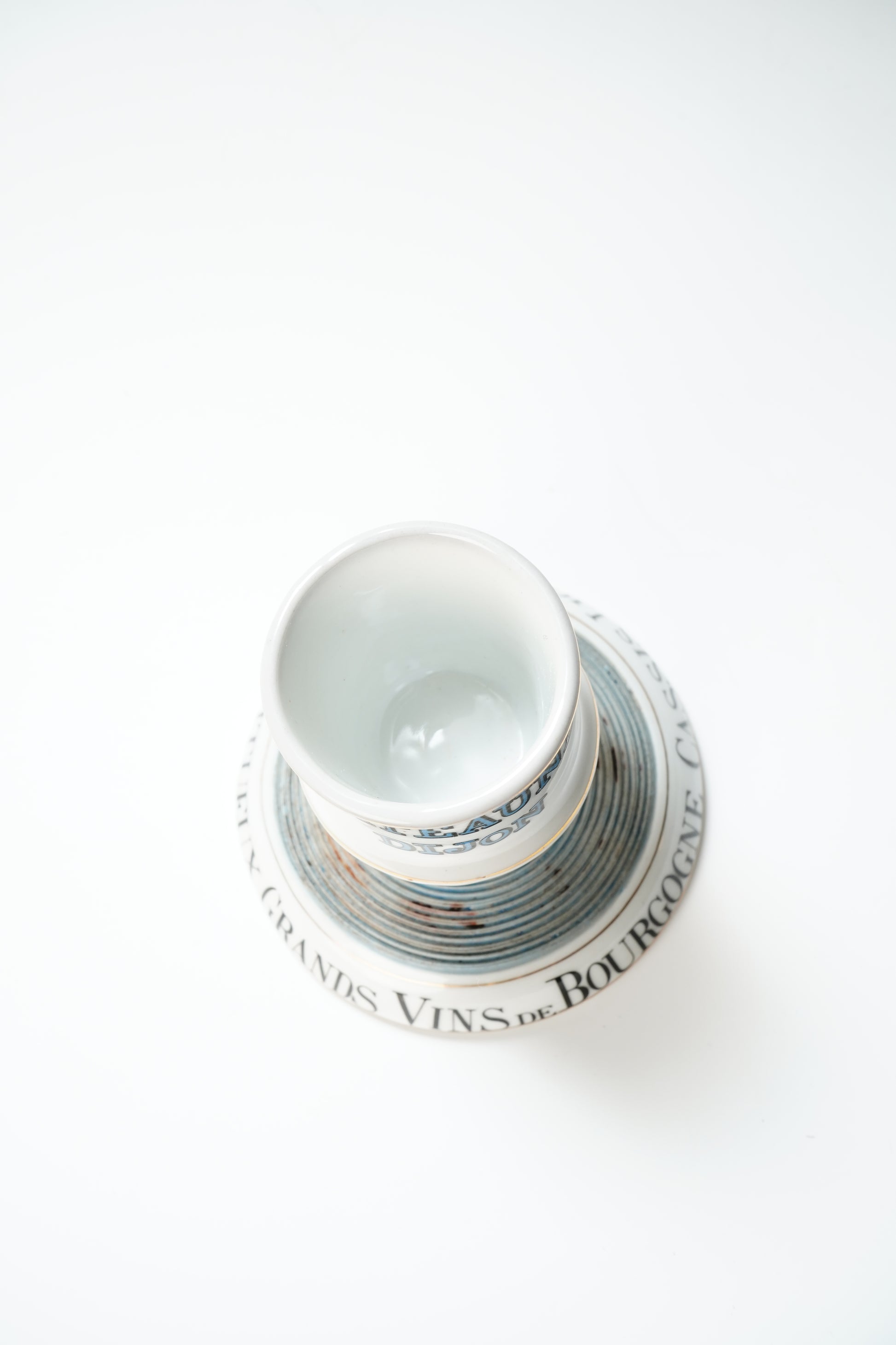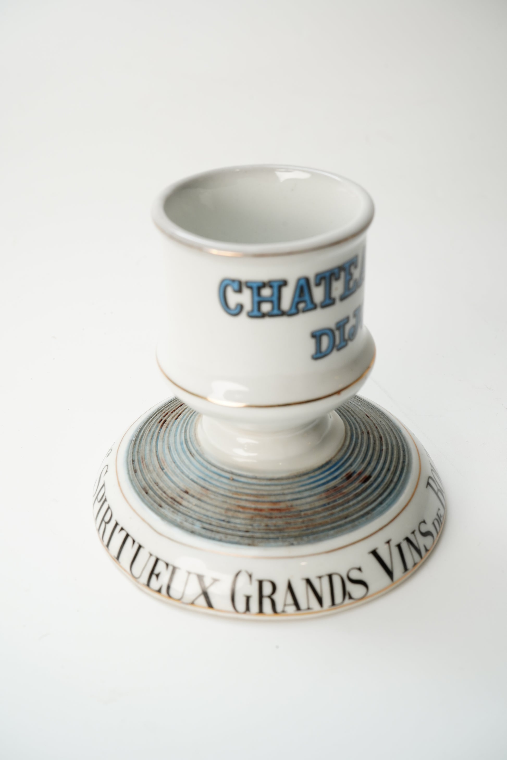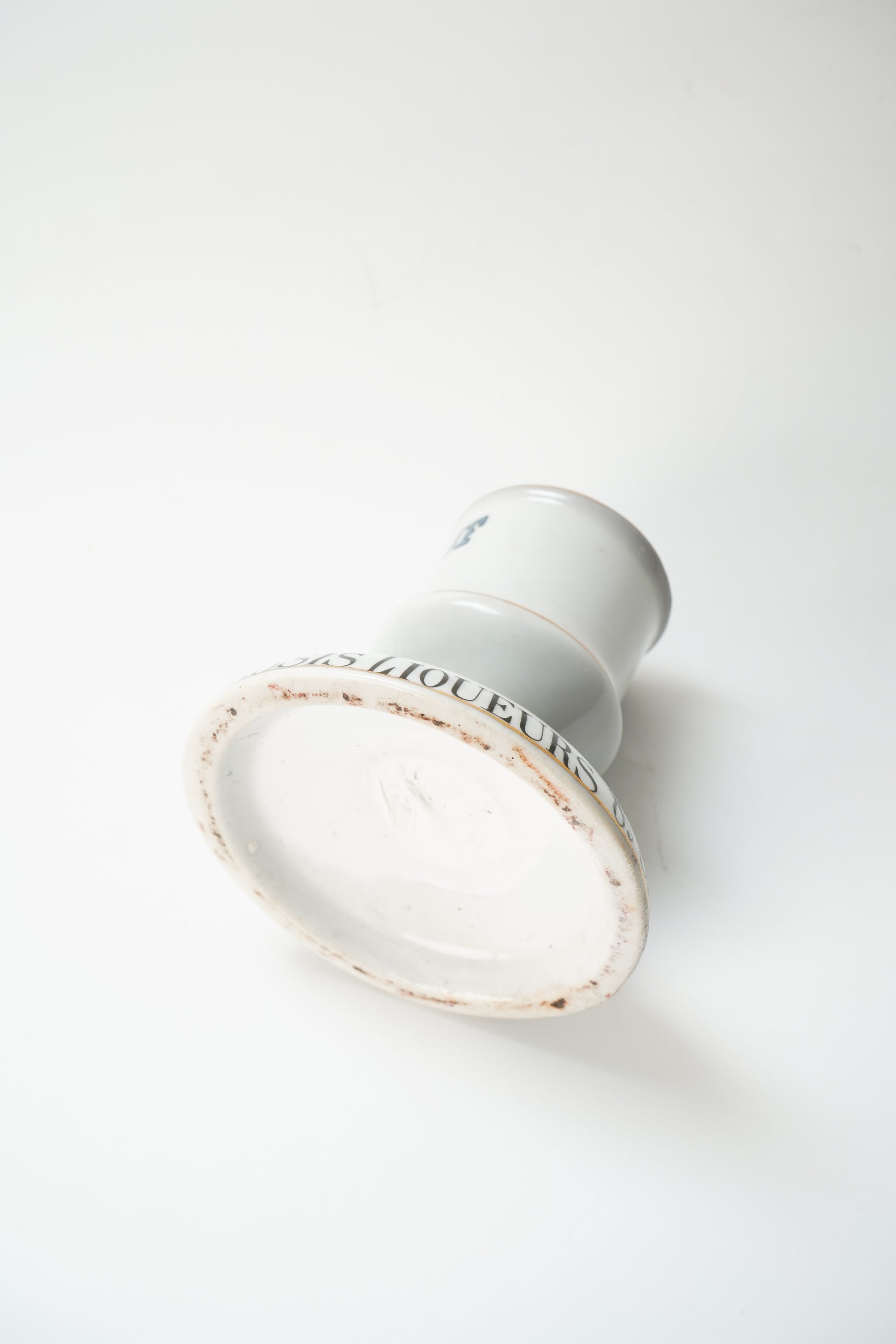 The shape is wonderfully sculptural, with a mini goblet-style match cup rising from a wide base and finished with gilt banding and a concentric blue ring field on the top of the base. Today it’s perfect for a bar cart, open shelving, a French advertising collection, or as a conversation-starting accent in a kitchen vignette.