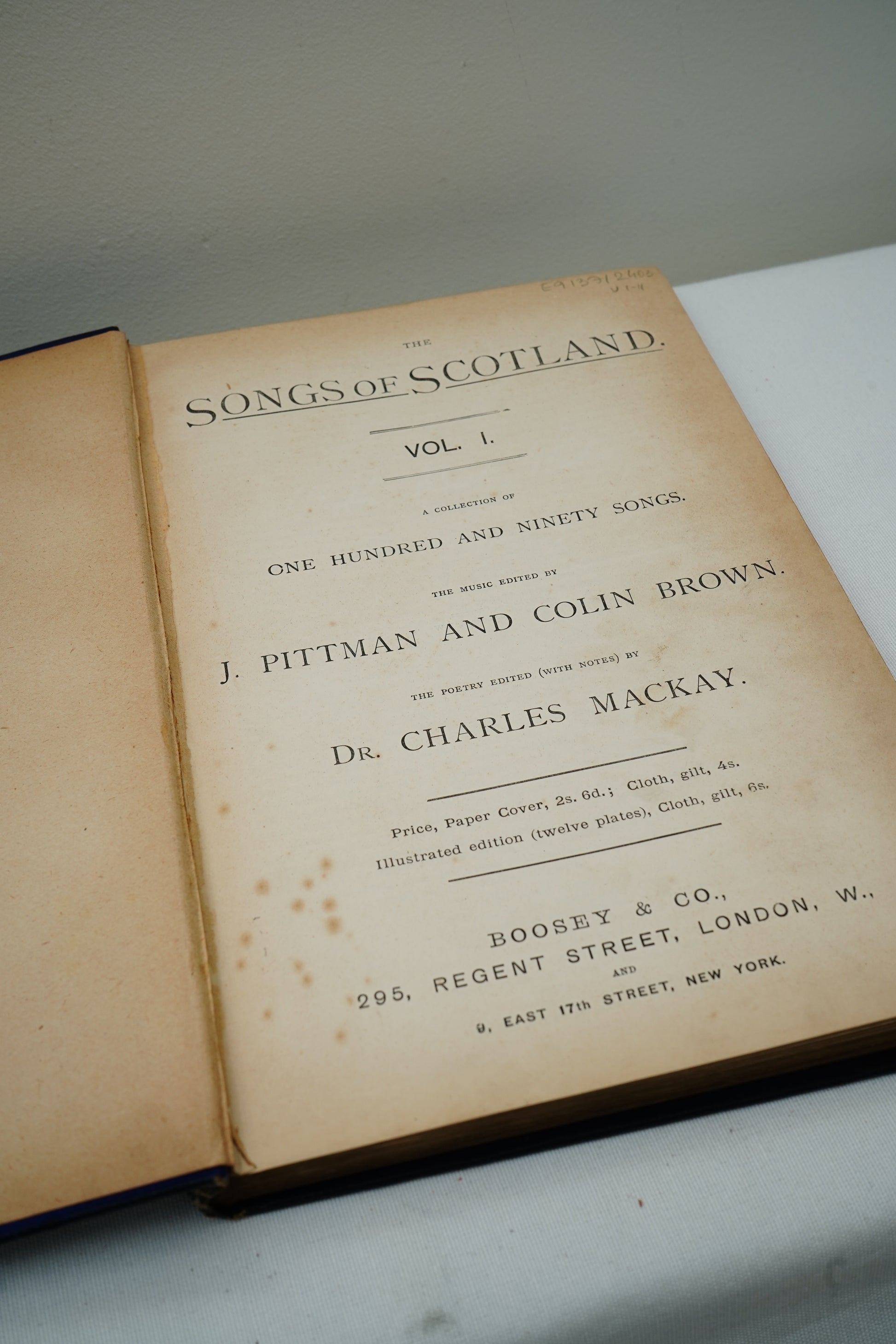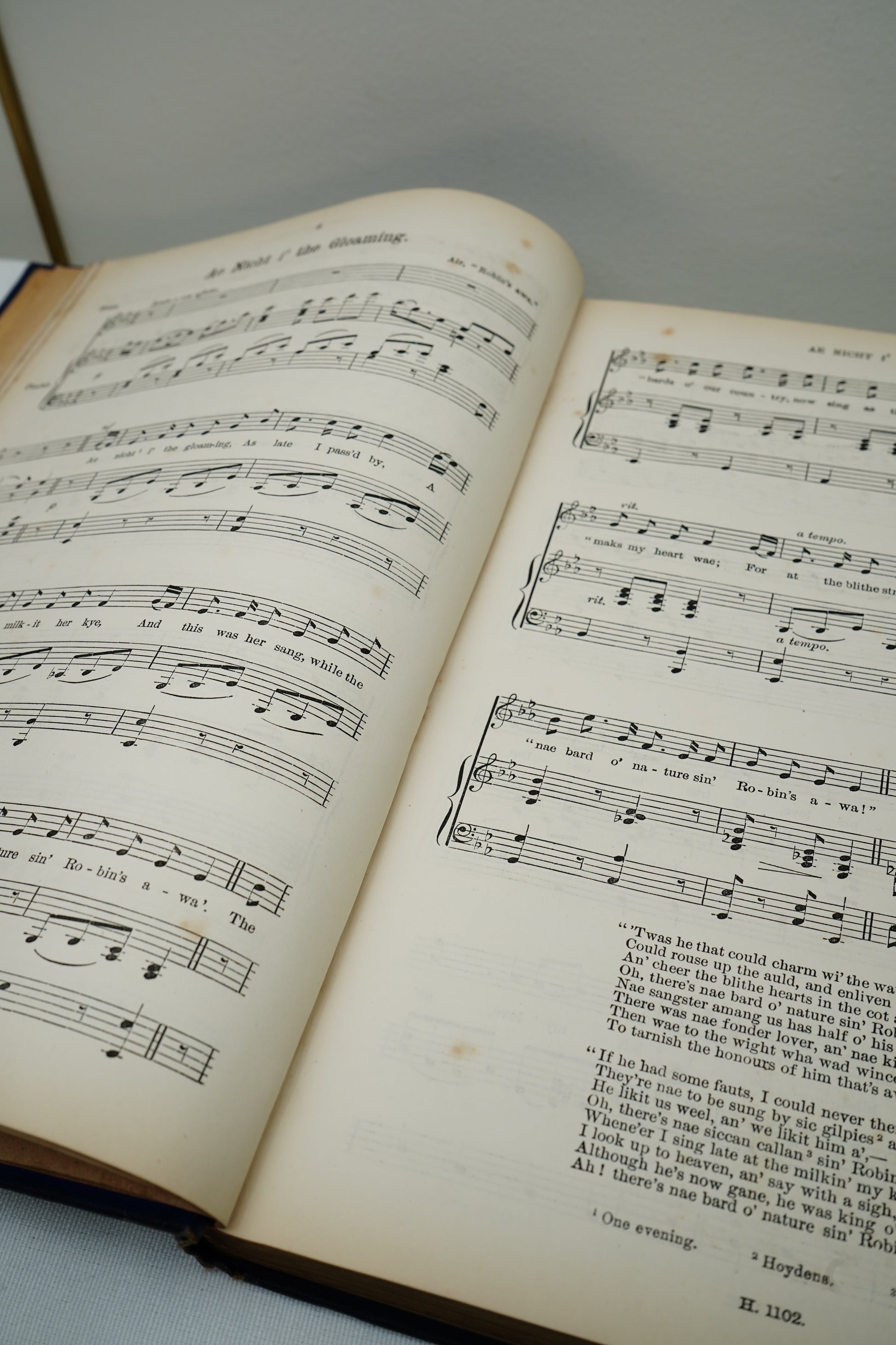 Bring a piece of Victorian musical history into your home with this beautiful two volume set of The Songs of Scotland in the “Royal Edition,” published by the famous music house Boosey & Co. in London and New York, and generally dated to the late 1870s. Volume I presents a collection of one hundred and ninety Scottish songs with poetry edited and annotated by Dr. Charles Mackay, while Volume II adds one hundred and forty three songs collected and edited with new accompaniments by Myles B. Foster, making this a wonderfully substantial archive for anyone who loves Scottish heritage, folk music, or vintage sheet music collections. Beyond the content, these books are simply striking on display: deep cobalt blue cloth boards with ornate embossed detailing, gilt titling, and that dramatic “Royal Edition” cover design that looks incredible in a library, music room, or on a styled shelf. Inside you will find page after page of printed musical notation with lyrics, the kind of “at home” parlor music that defined the Victorian era, when families gathered around a piano and national song collections helped preserve local identity and tradition.