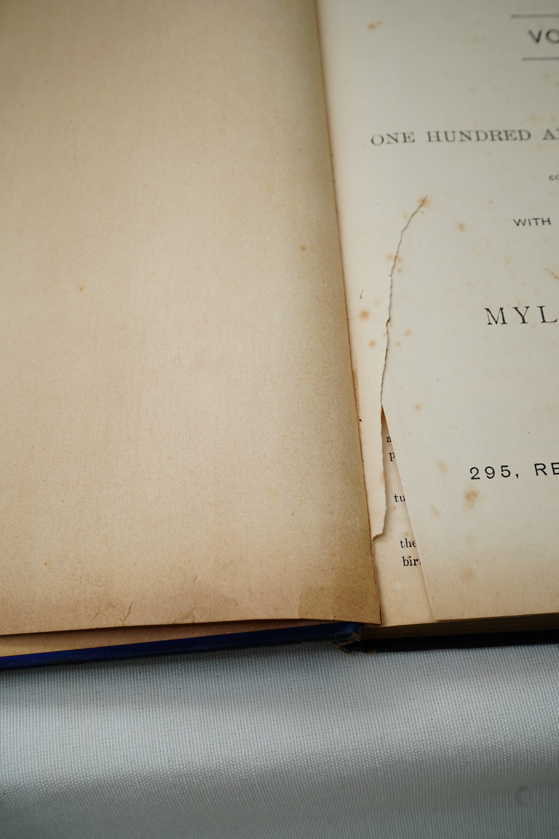 Condition: The blue cloth boards show rubbing and edge wear, especially at the spine ends and corners, and there is light scuffing to the covers. The gilt page edges show wear and dulling in areas. Internally, the pages are toned with scattered foxing and spotting throughout, most noticeable on the early leaves. One volume shows a notable tear to an early leaf near the front, and there may be small edge flaws to a few pages, but the books remain presentable, readable, and display beautifully as a decorative Victorian music set.