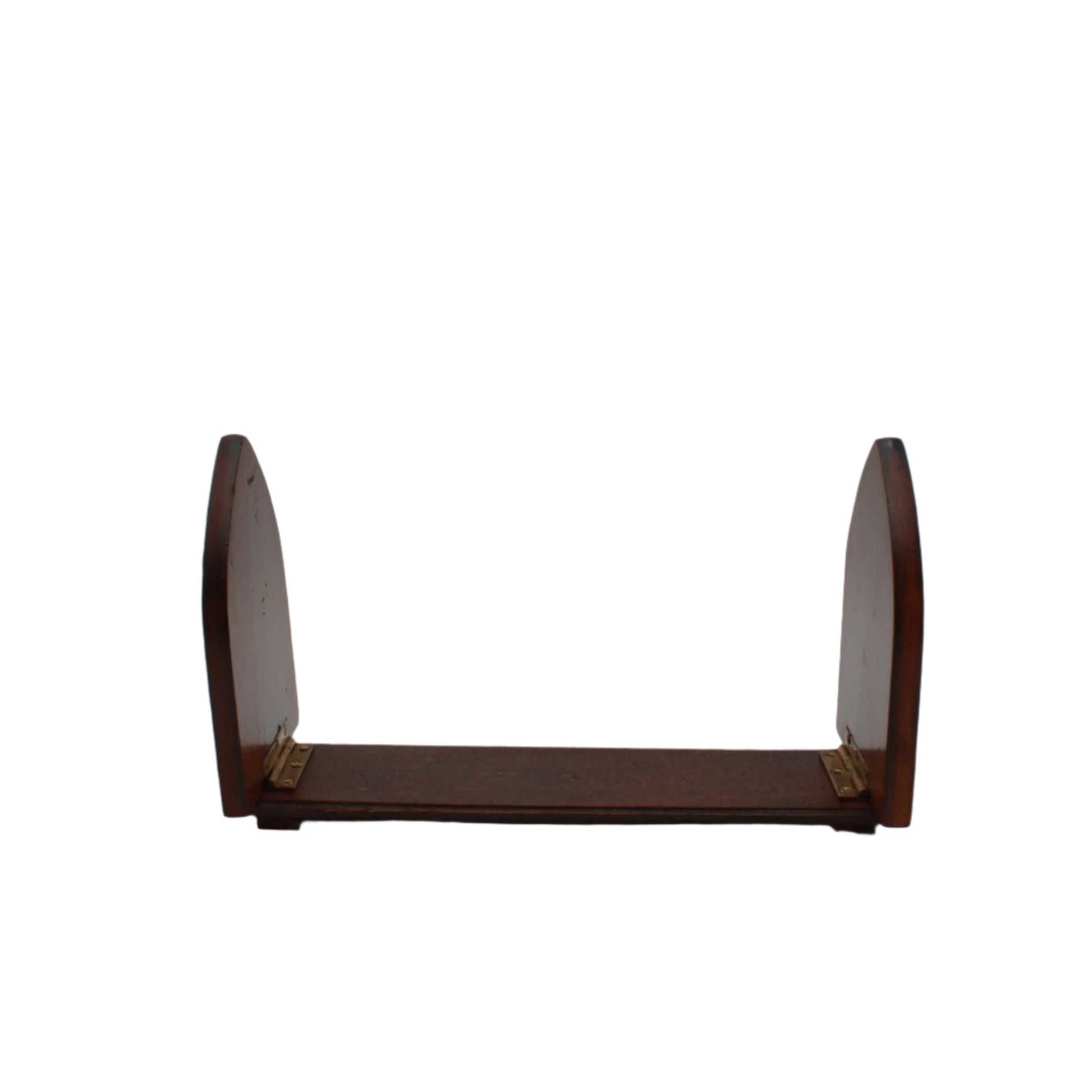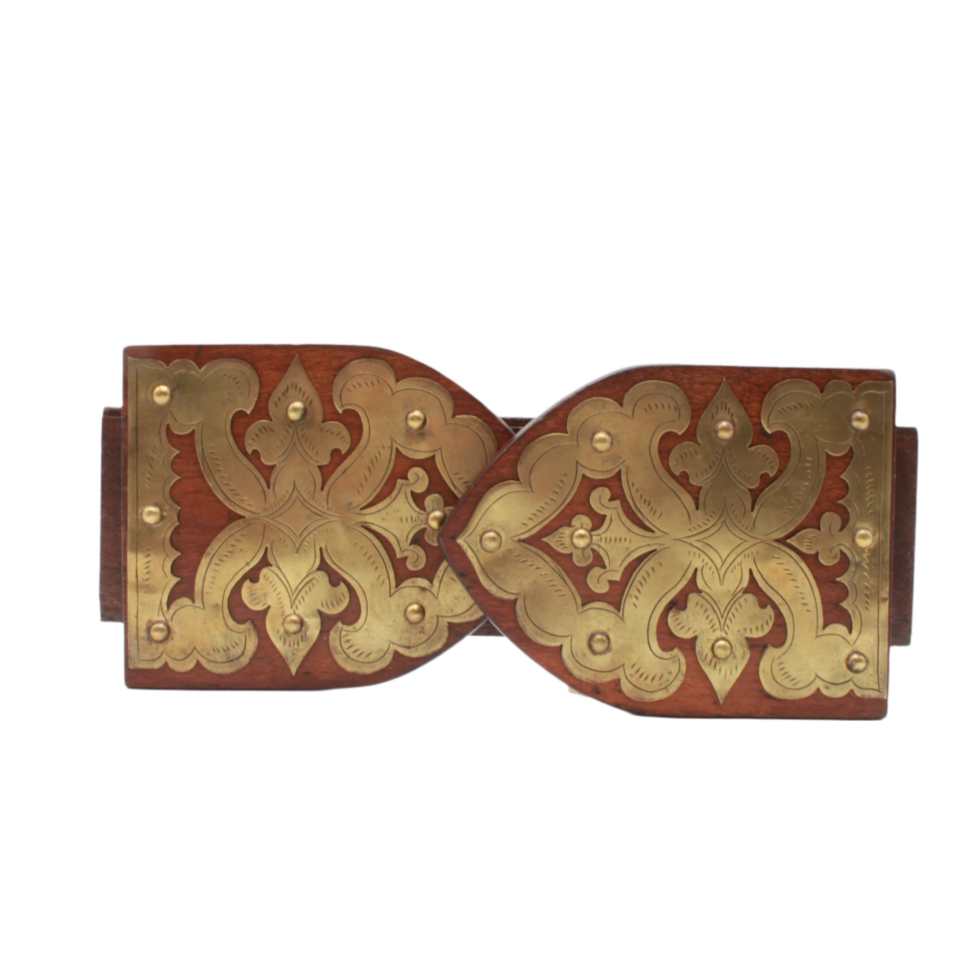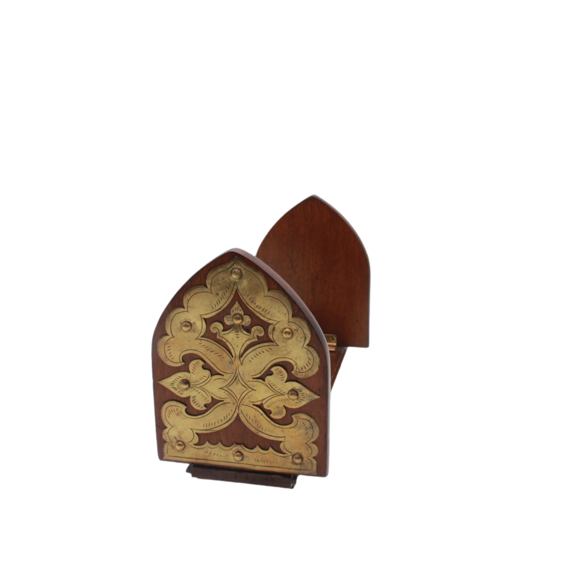 Good antique condition with gentle age and use. Hardwood shows a rich, even color with small nicks at the edges and expected surface wear. Brass mounts have a pleasing patina with minor marks and the domed studs secure and stable. Hinge operates well and the base sits level. Clean, sturdy, and ready for use.