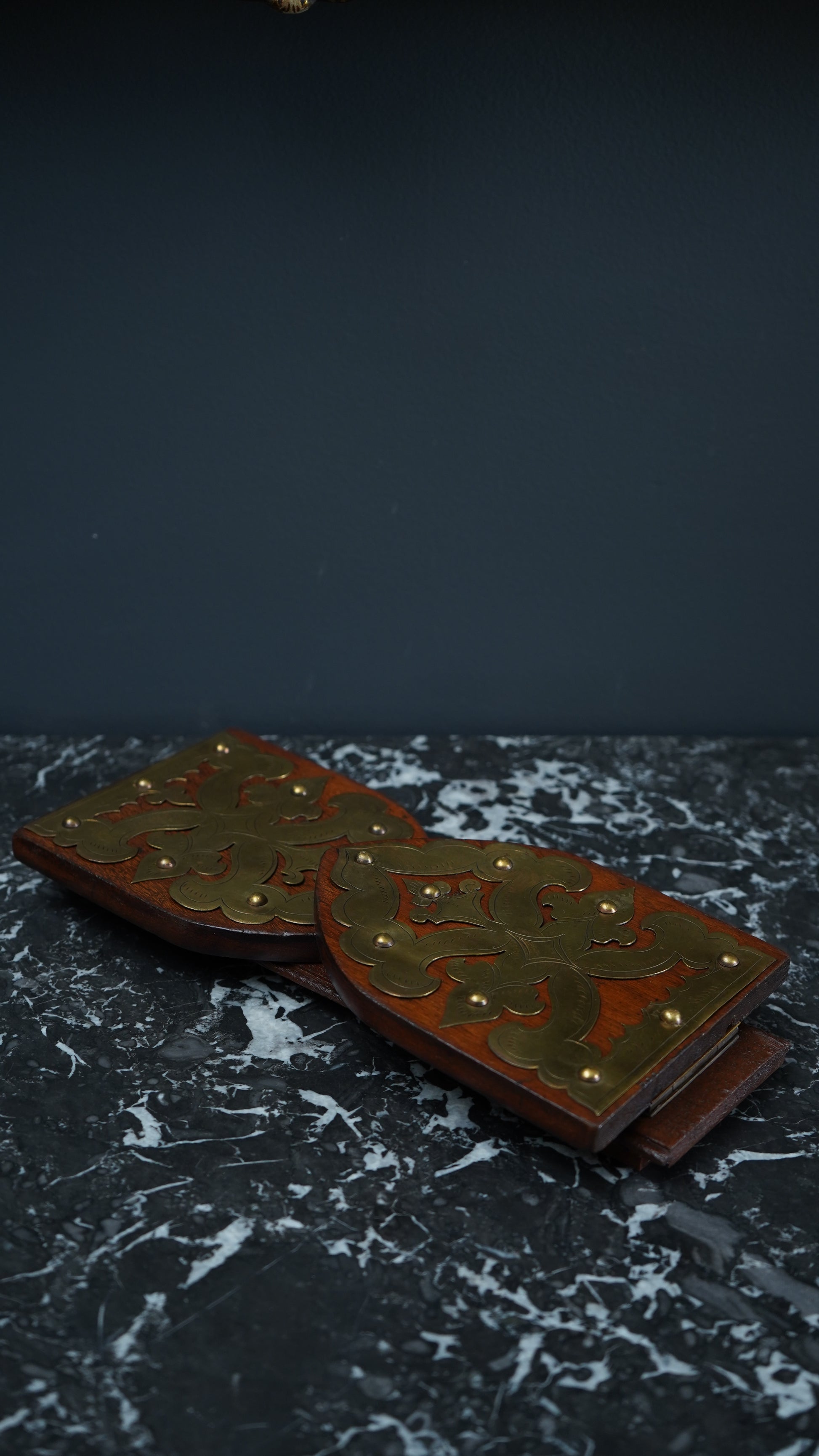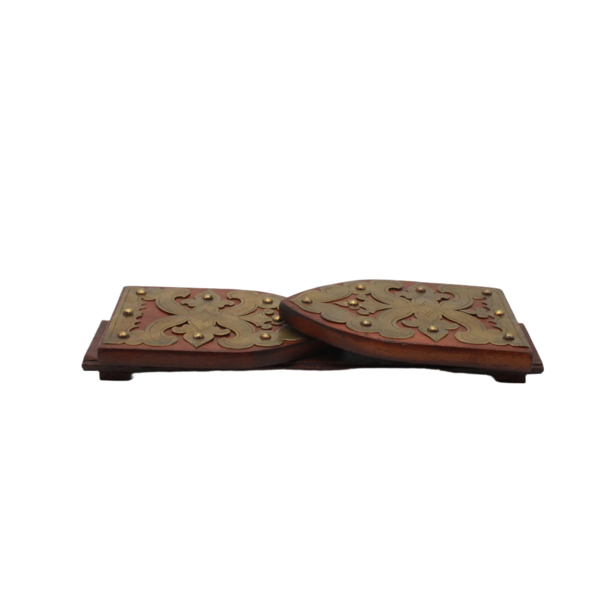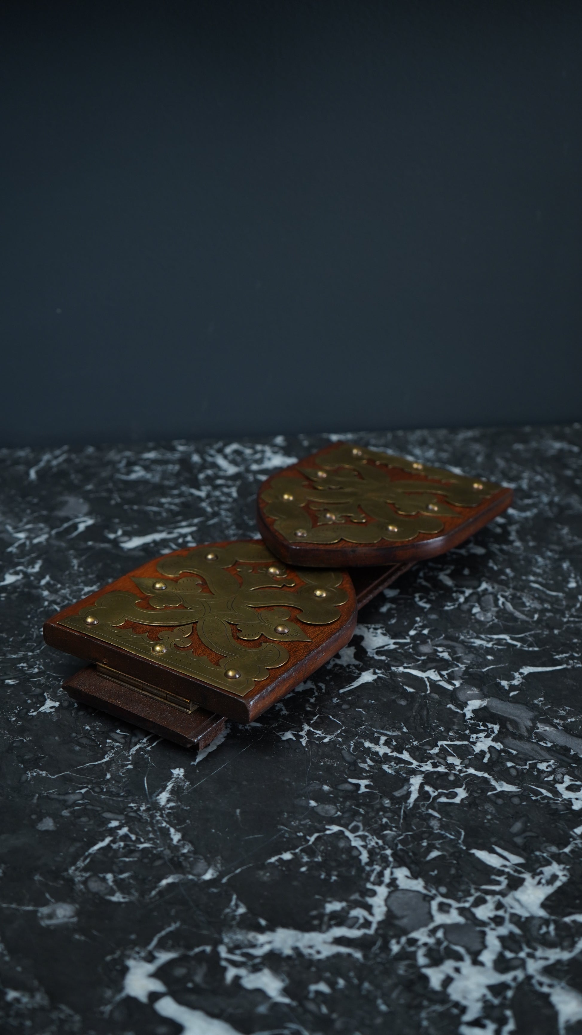 Good antique condition with gentle age and use. Hardwood shows a rich, even color with small nicks at the edges and expected surface wear. Brass mounts have a pleasing patina with minor marks and the domed studs secure and stable. Hinge operates well and the base sits level. Clean, sturdy, and ready for use.