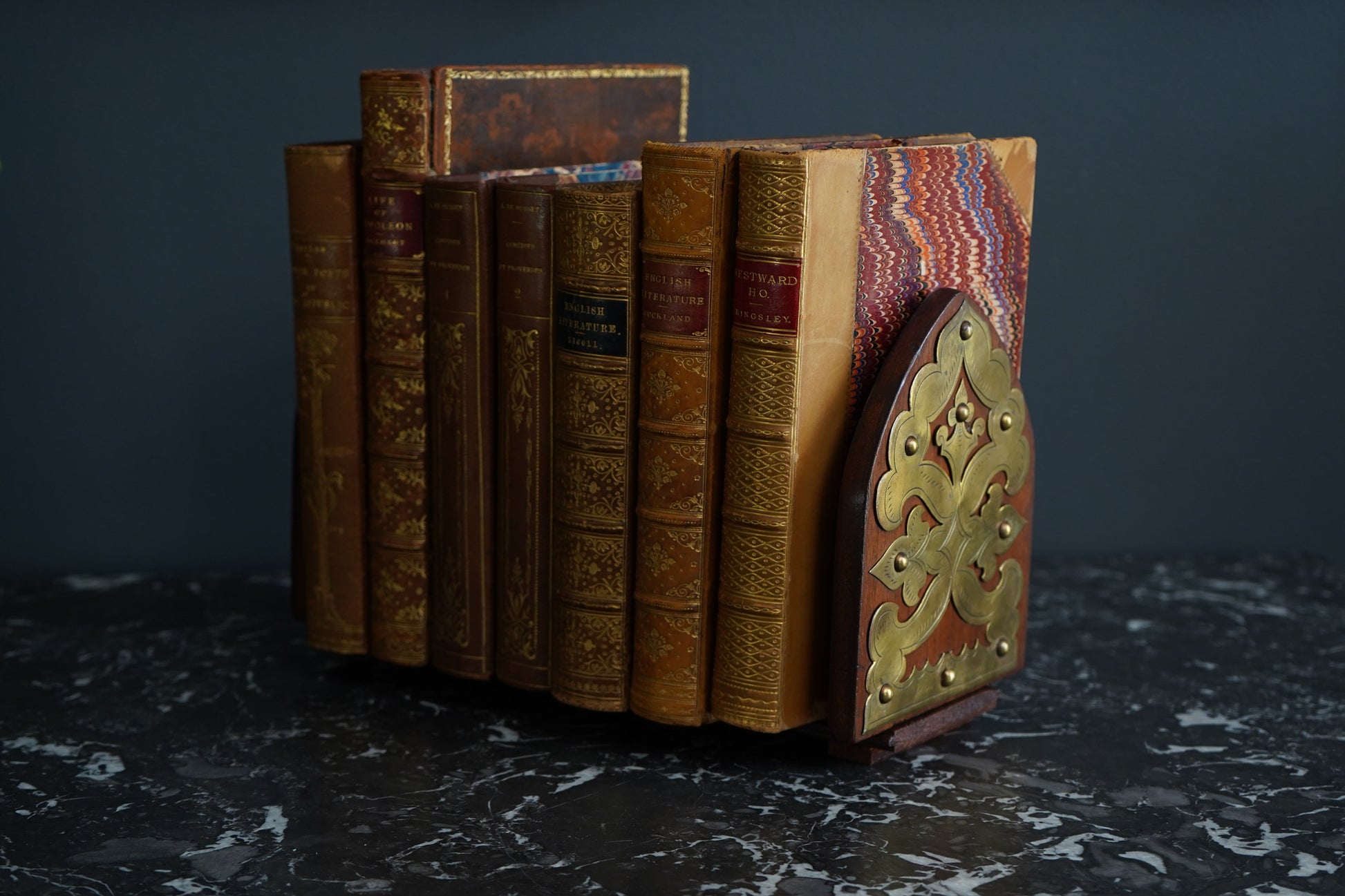 Antique Gothic Revival Folding Book Slide in Oak and Brass, c. 1890